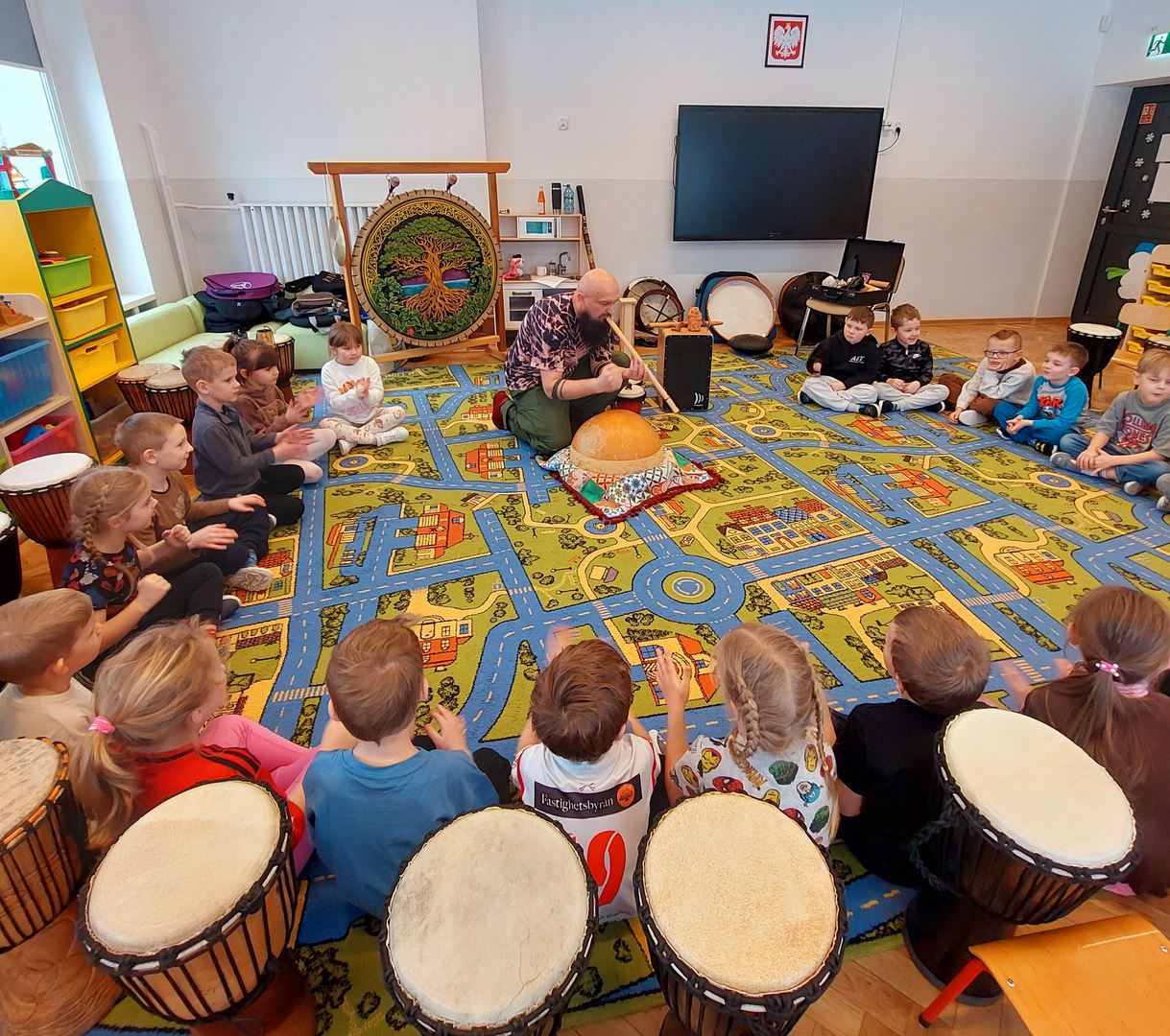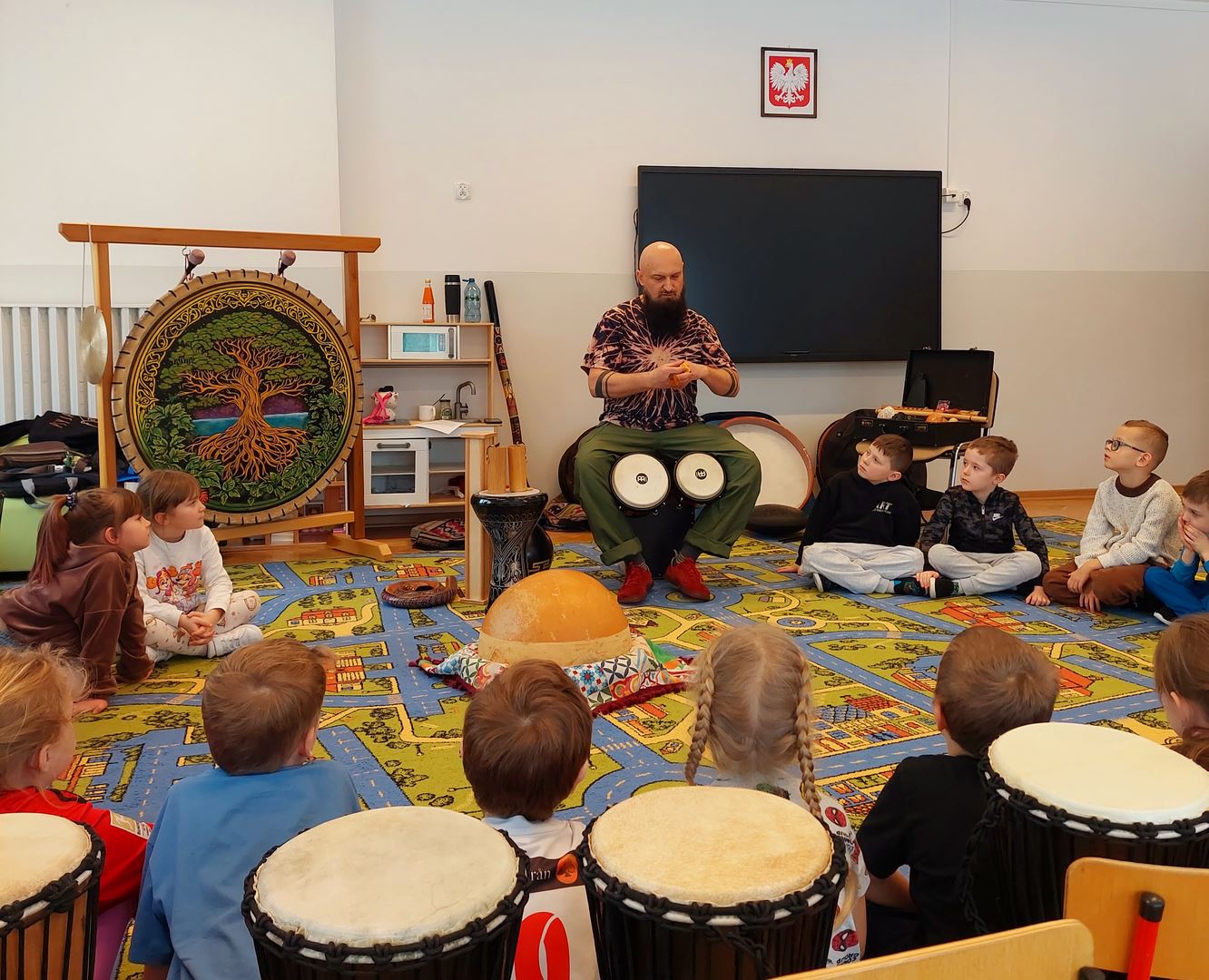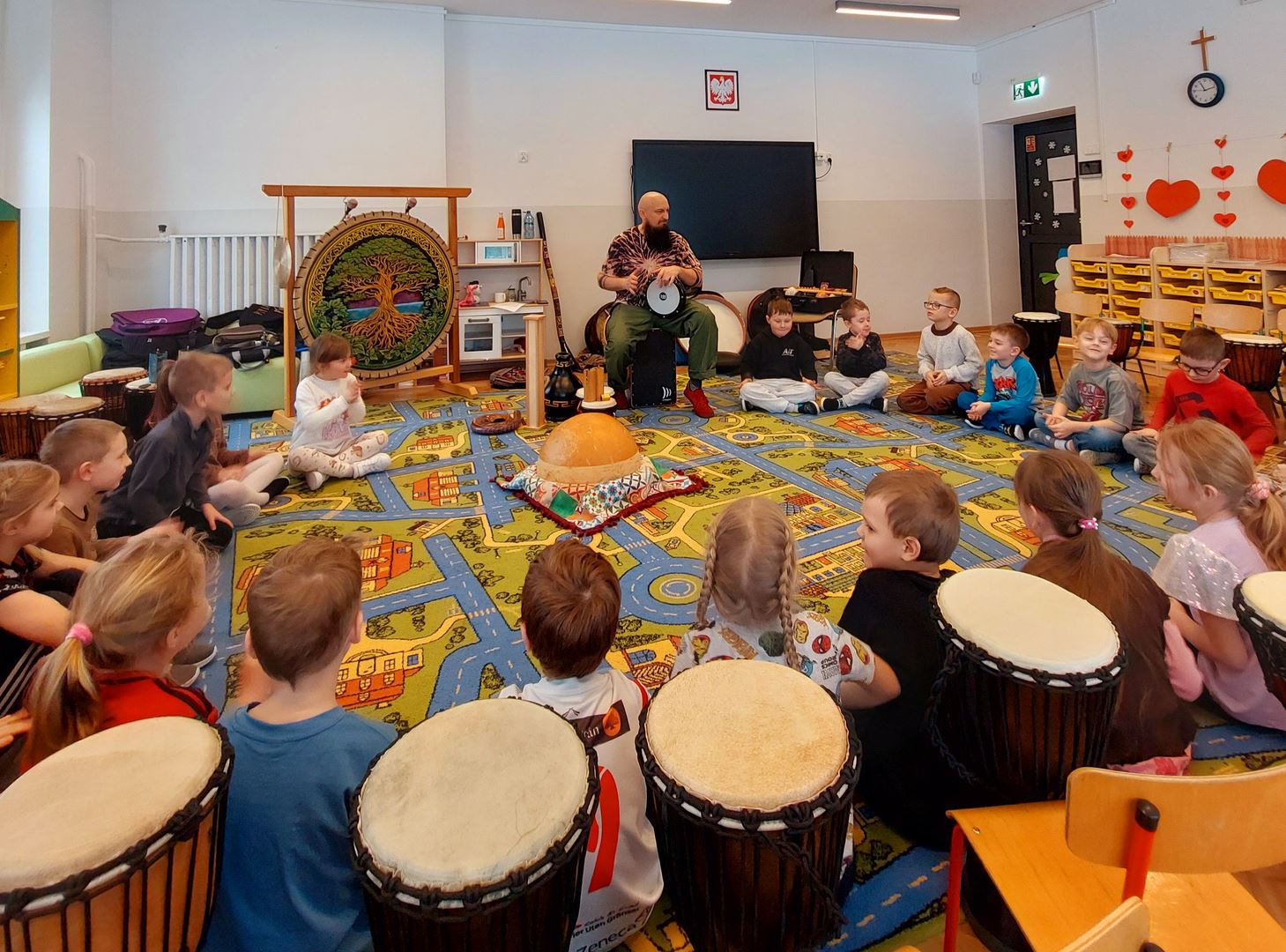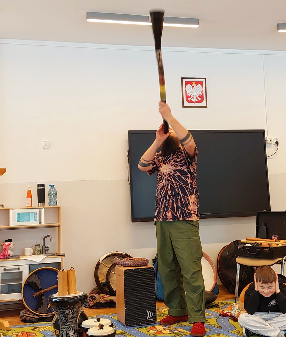 Dzieci były zachwycone! Z ogromnym zainteresowaniem słuchały, próbowały i odkrywały nowe dźwięki. Wśród ogromu prezentowanych instrumentów znalazły się m.in.: djembe, kazu, didgeridoo, handpan, drumla i wiele innych. Były także takie, imitujące dźwięk ptaków , deszcz czy szum oceanu...