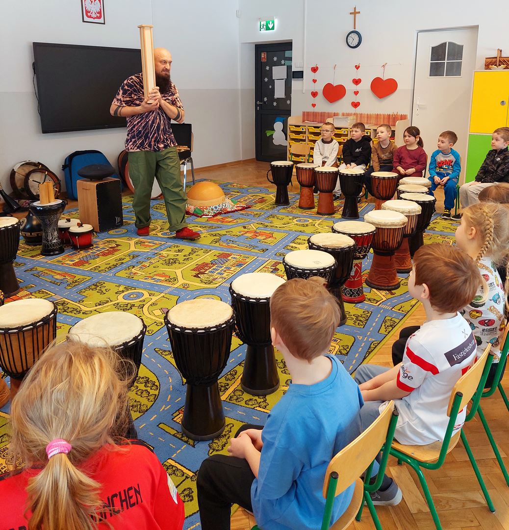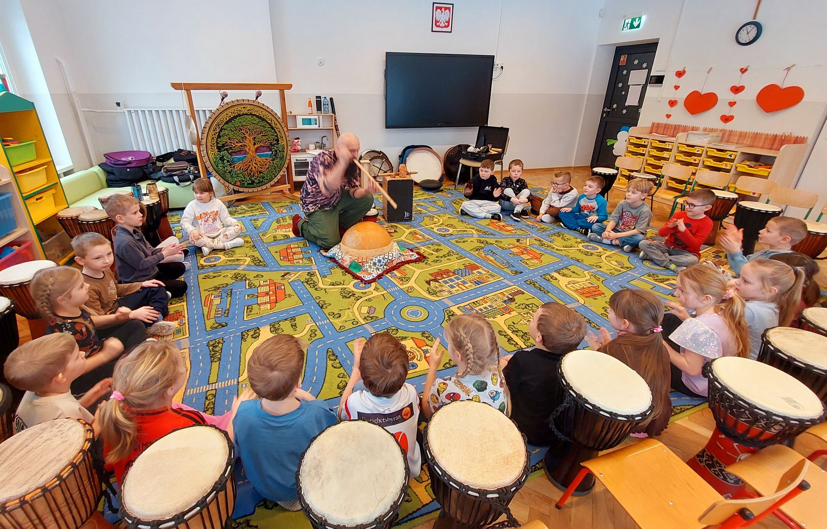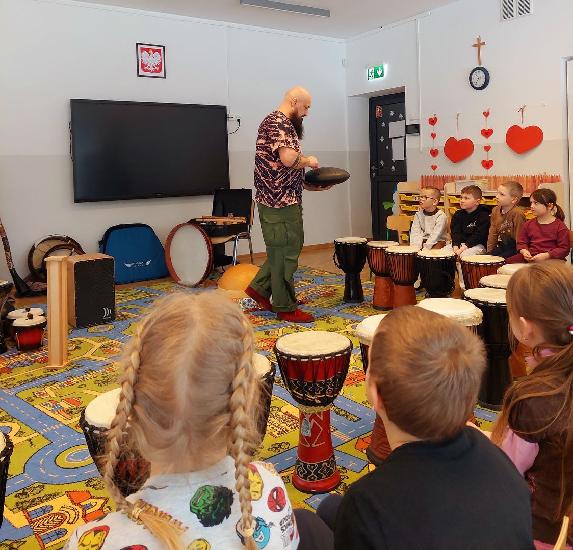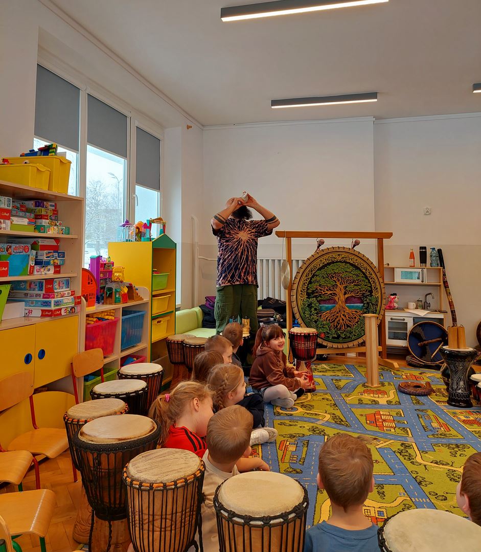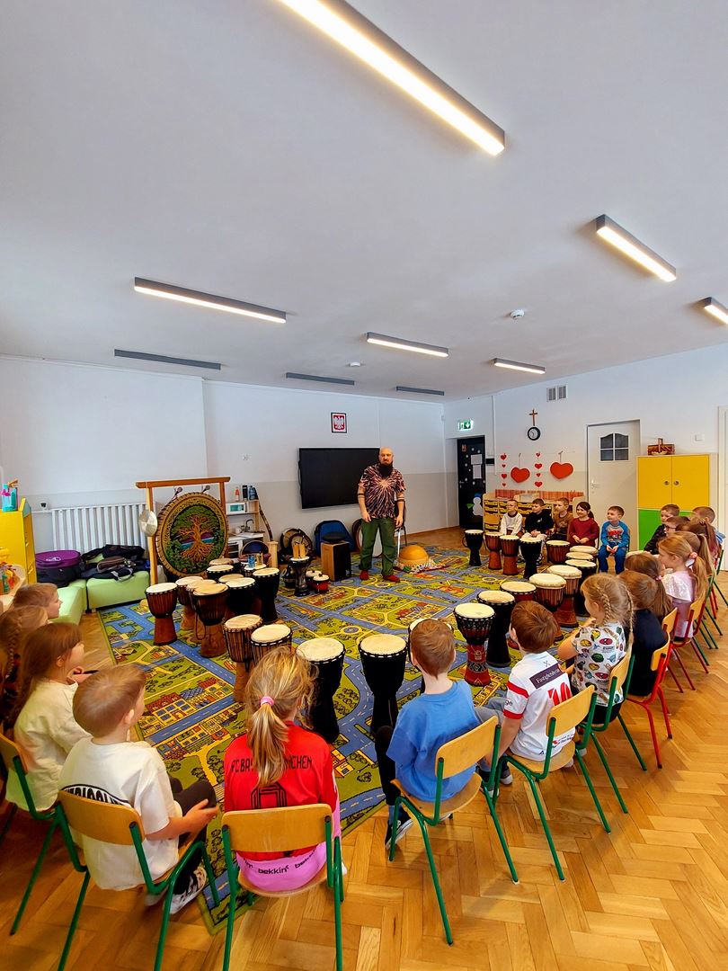 Dzieci były zachwycone! Z ogromnym zainteresowaniem słuchały, próbowały i odkrywały nowe dźwięki. Wśród ogromu prezentowanych instrumentów znalazły się m.in.: djembe, kazu, didgeridoo, handpan, drumla i wiele innych. Były także takie, imitujące dźwięk ptaków , deszcz czy szum oceanu...