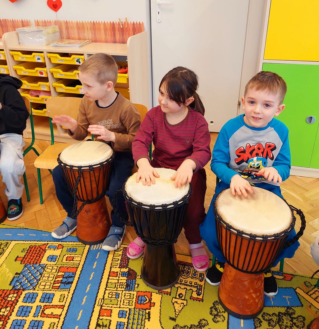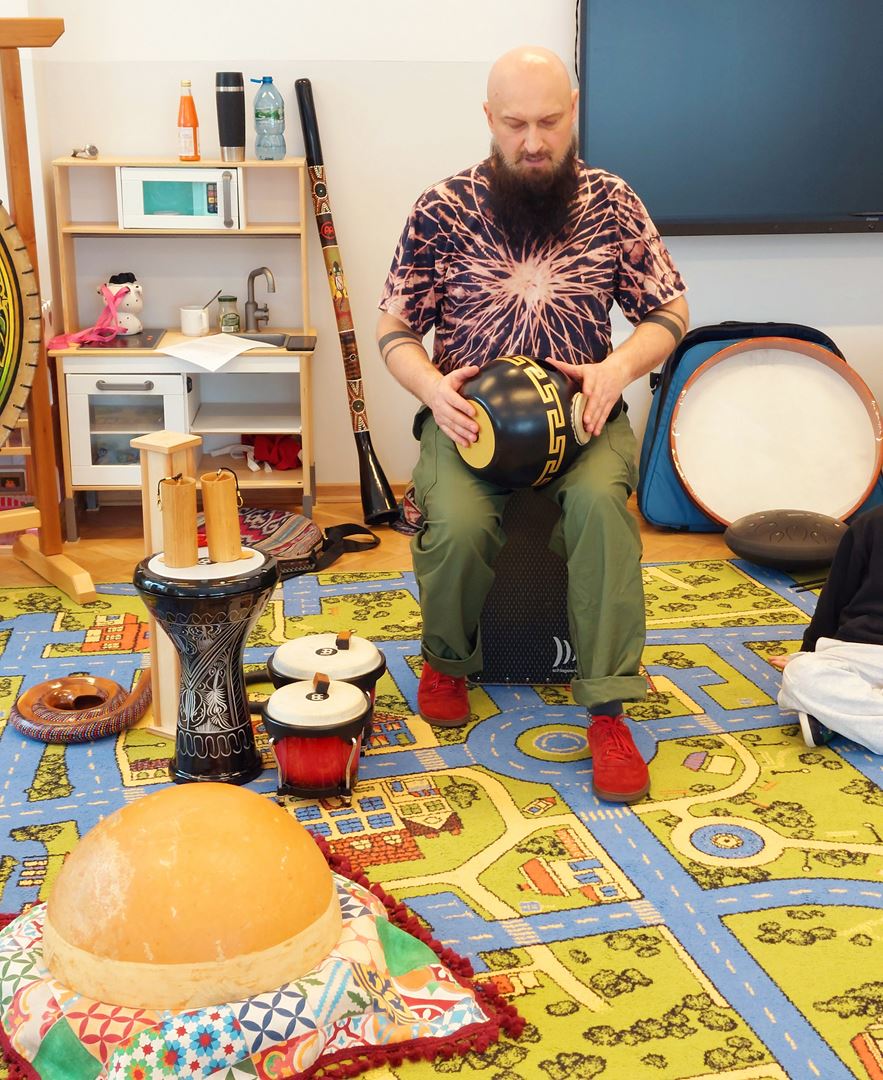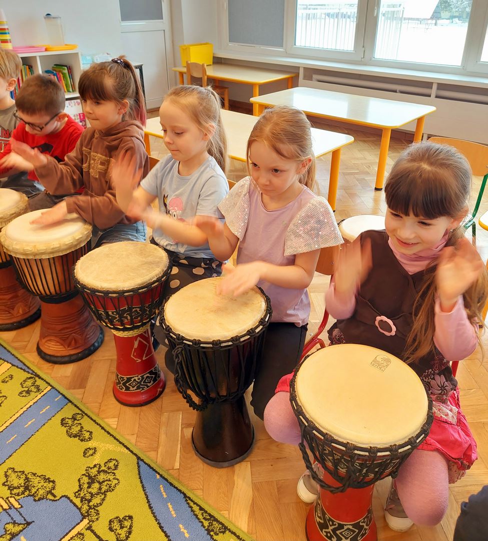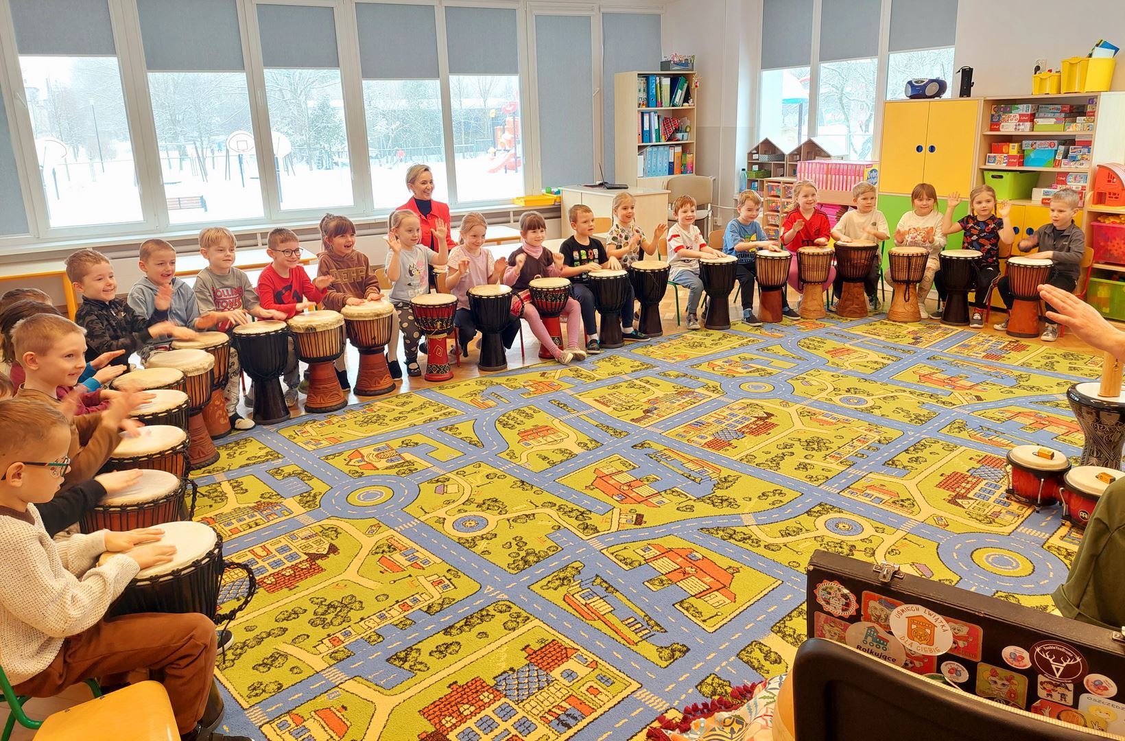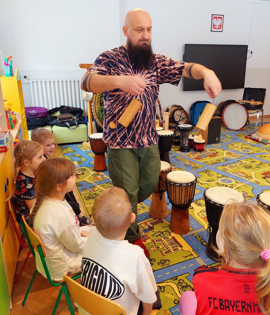Dzieci były zachwycone! Z ogromnym zainteresowaniem słuchały, próbowały i odkrywały nowe dźwięki. Wśród ogromu prezentowanych instrumentów znalazły się m.in.: djembe, kazu, didgeridoo, handpan, drumla i wiele innych. Były także takie, imitujące dźwięk ptaków , deszcz czy szum oceanu...