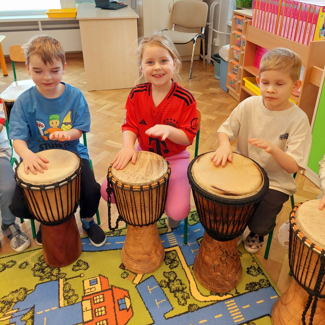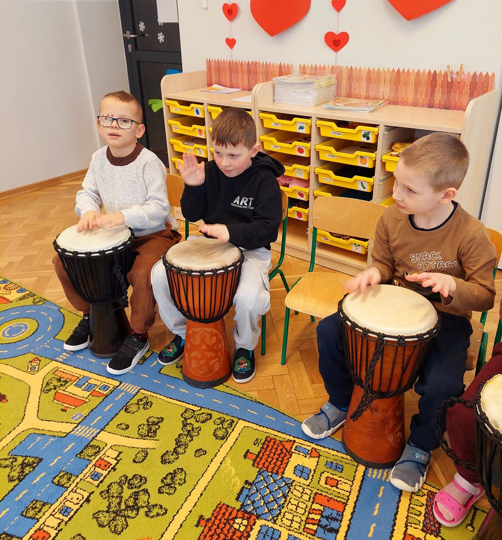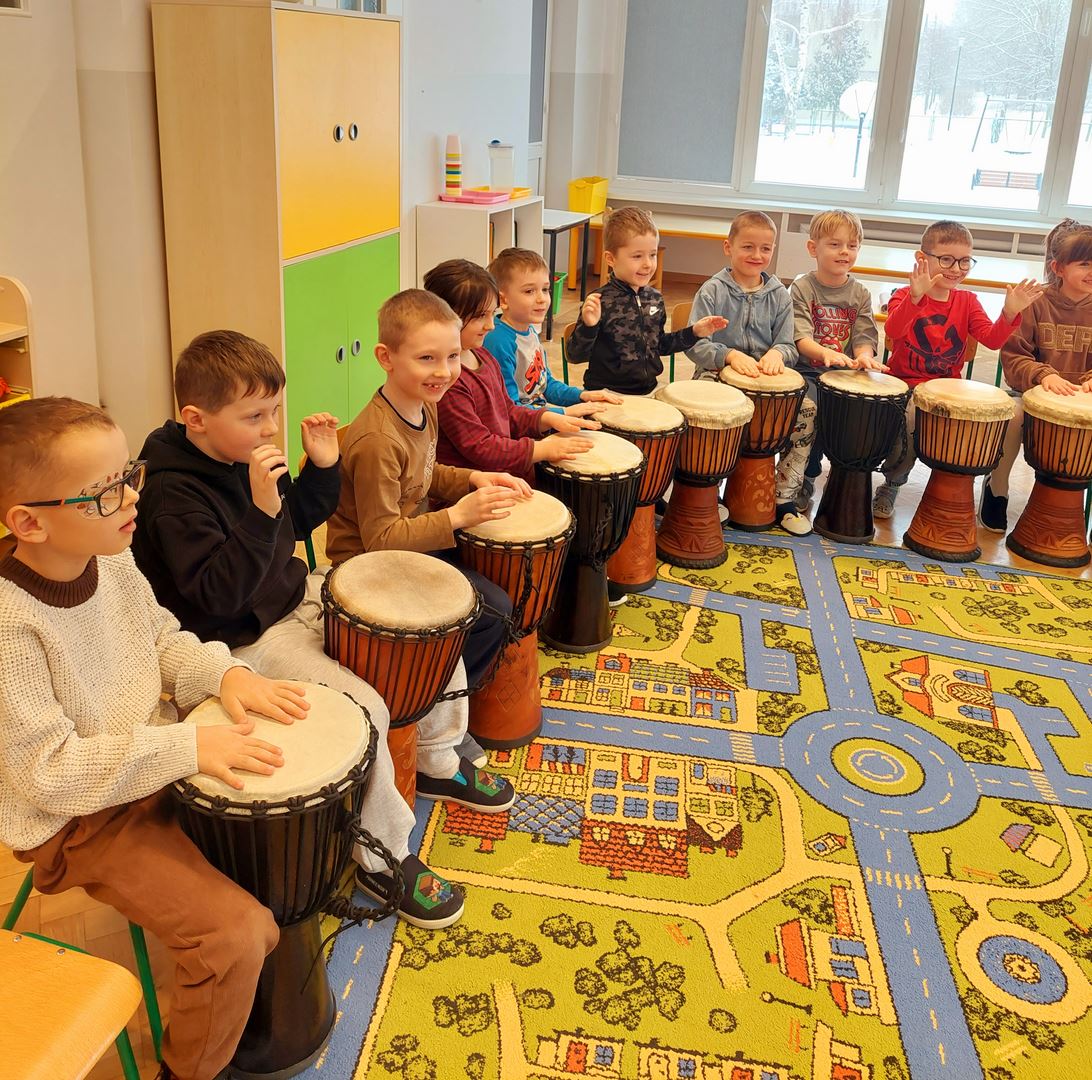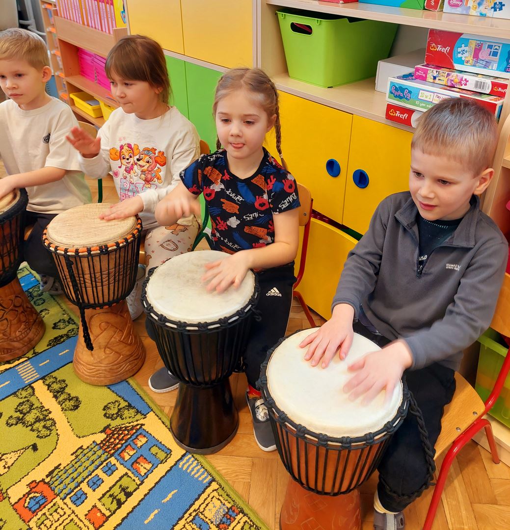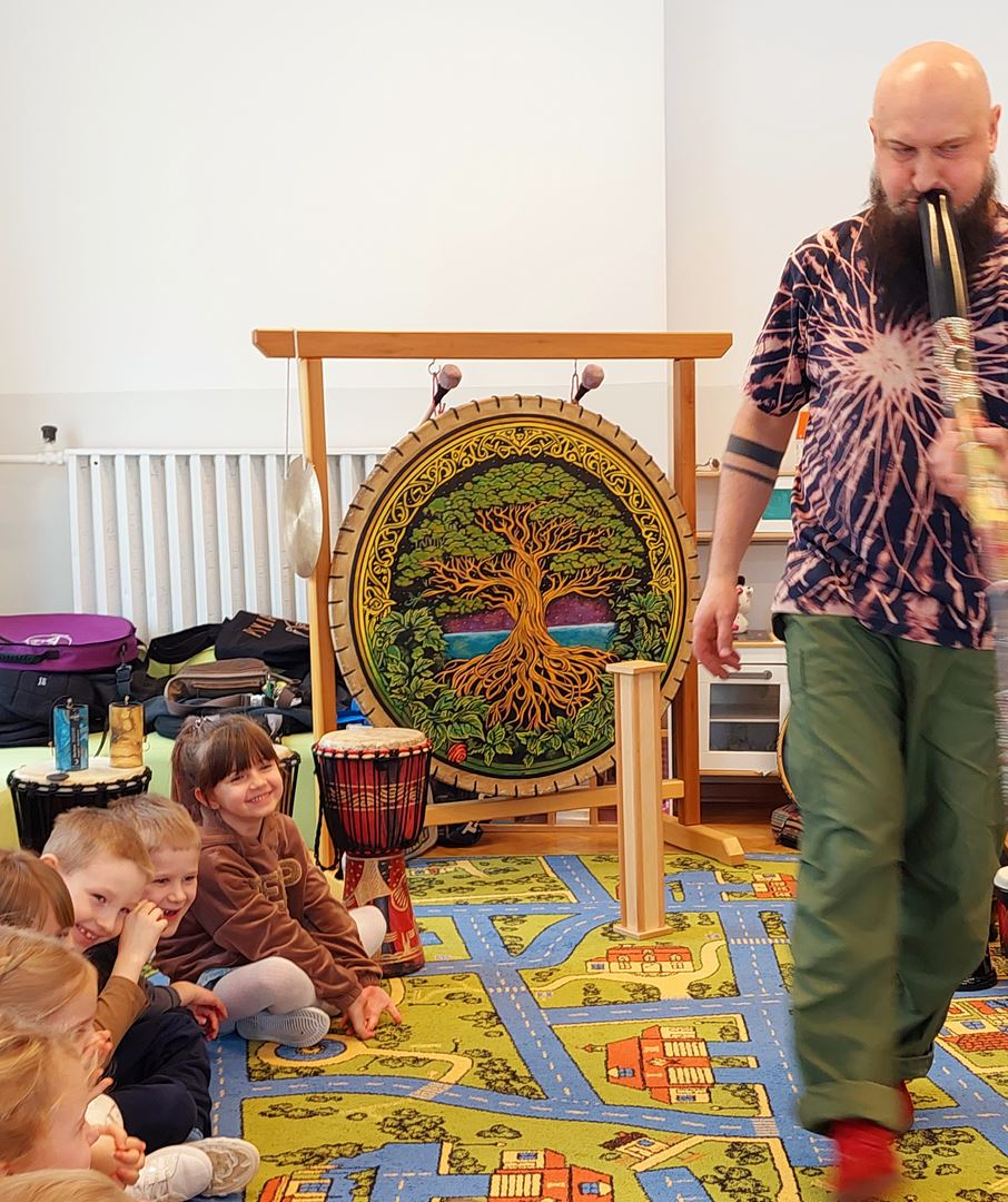 Dzieci były zachwycone! Z ogromnym zainteresowaniem słuchały, próbowały i odkrywały nowe dźwięki. Wśród ogromu prezentowanych instrumentów znalazły się m.in.: djembe, kazu, didgeridoo, handpan, drumla i wiele innych. Były także takie, imitujące dźwięk ptaków , deszcz czy szum oceanu...