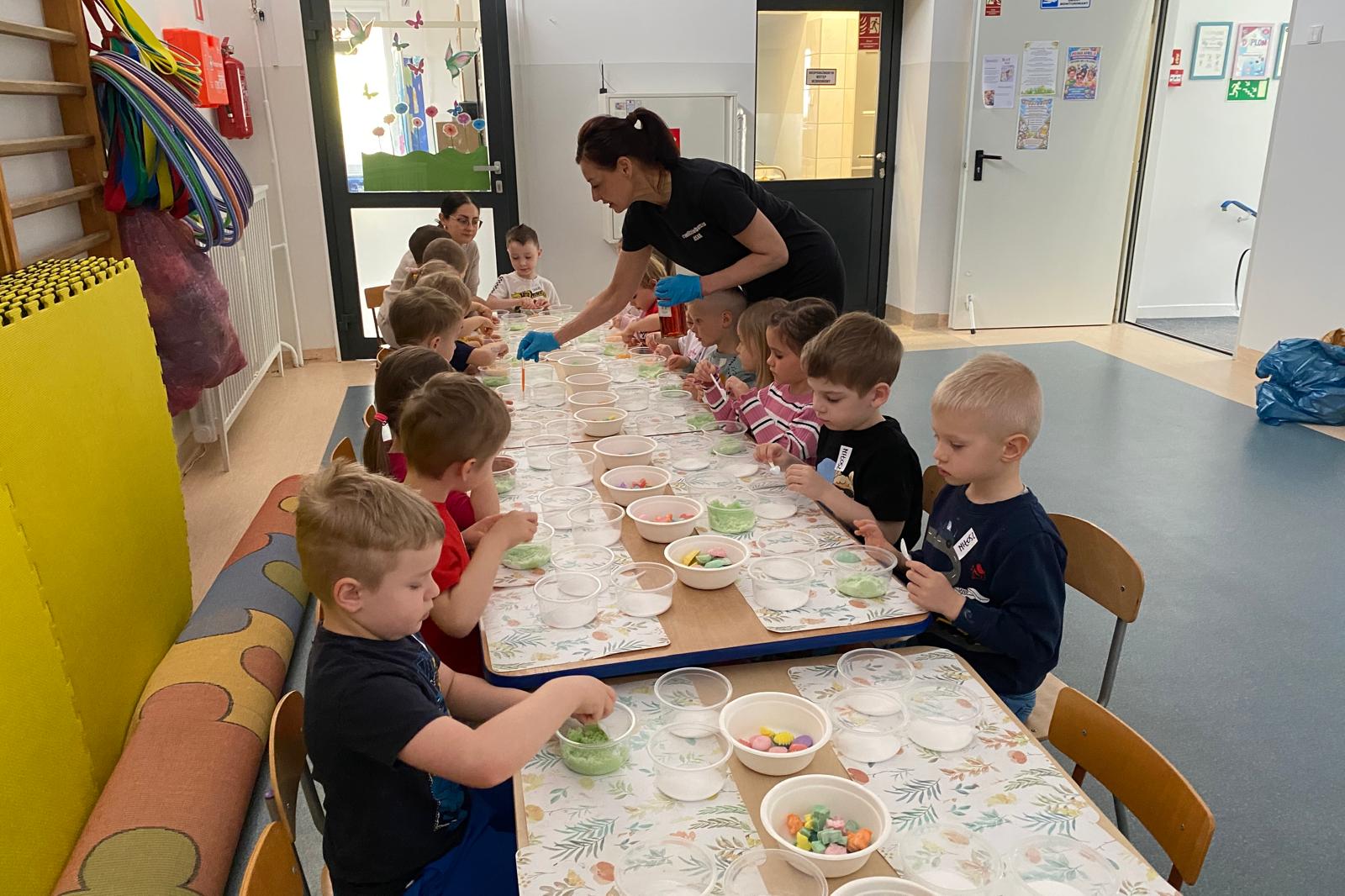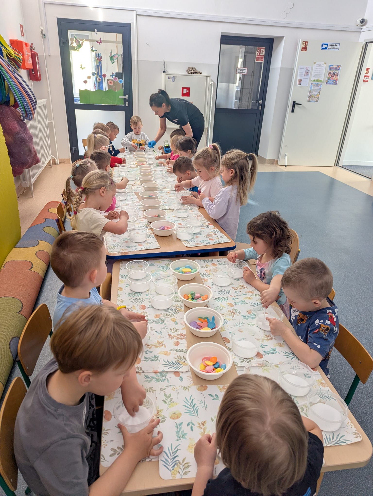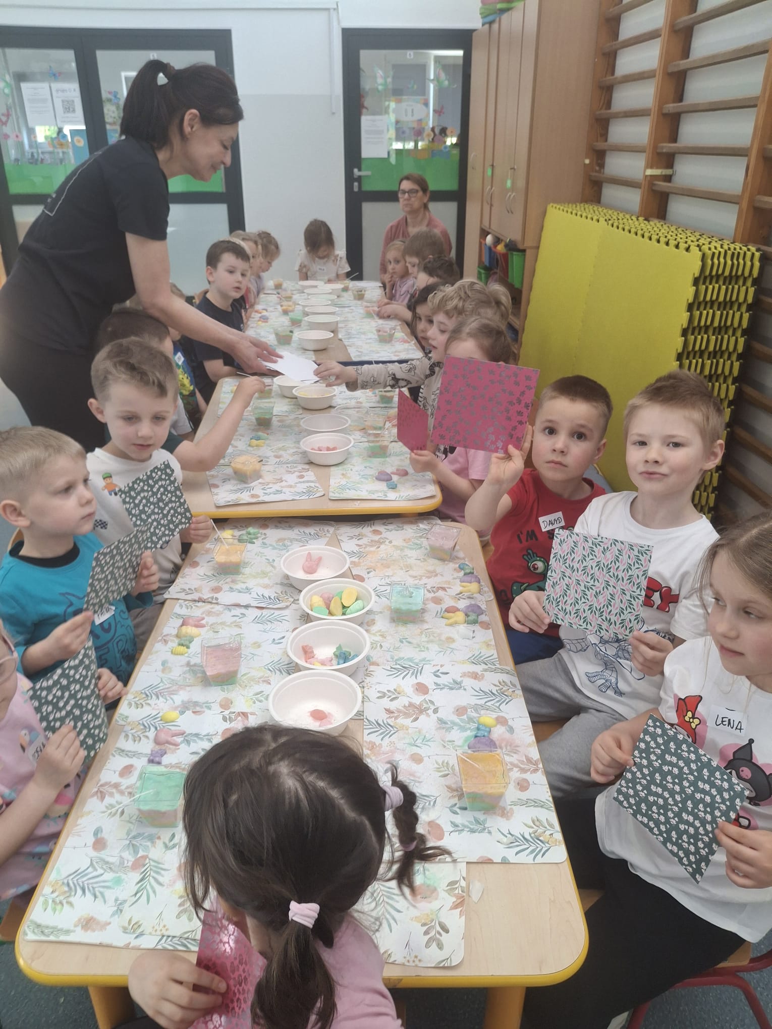 Podczas zajęć przedszkolaki tworzyły własne, niepowtarzalne świece z wykorzystaniem soli, barwników oraz ozdób wielkanocnych z wosku sojowego. Wśród dekoracji pojawiały się urocze zajączki, kolorowe jajeczka oraz wiosenne motywy, które nadawały pracom wyjątkowy, świąteczny charakter i mnóstwo kolorów wiosny .
