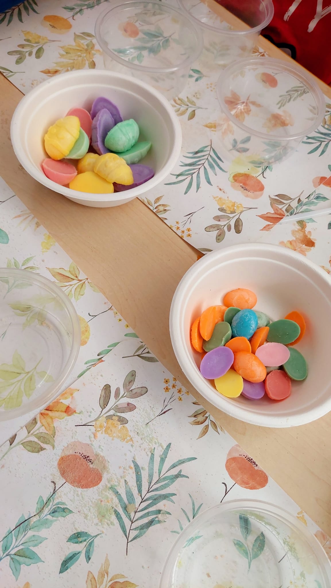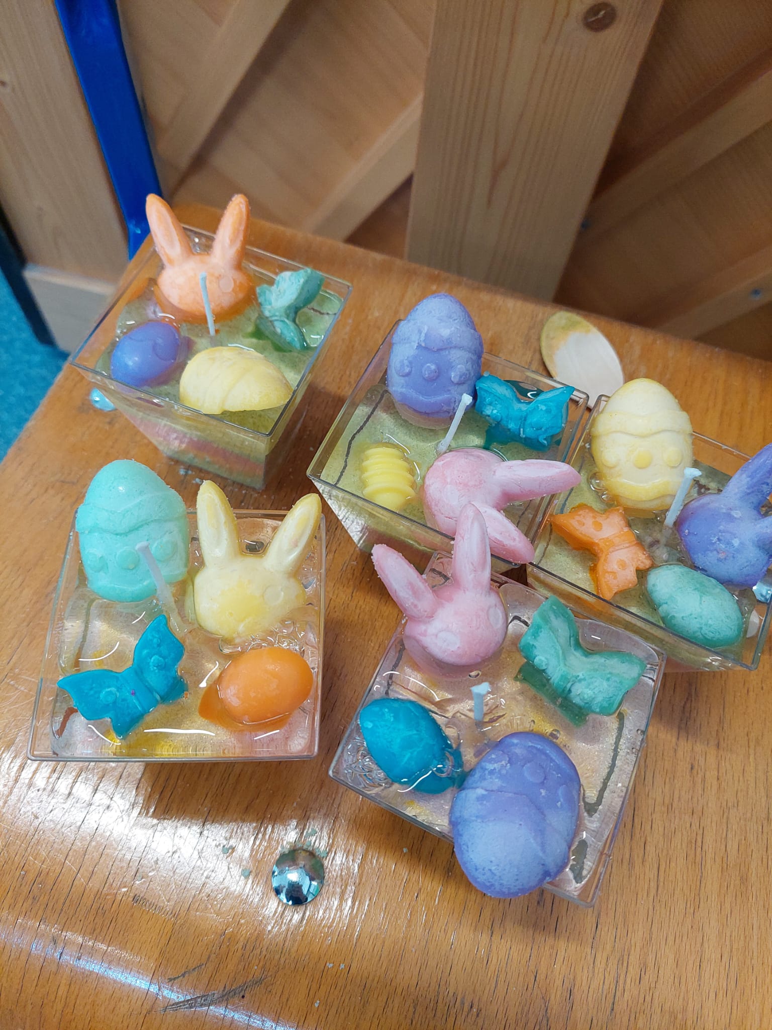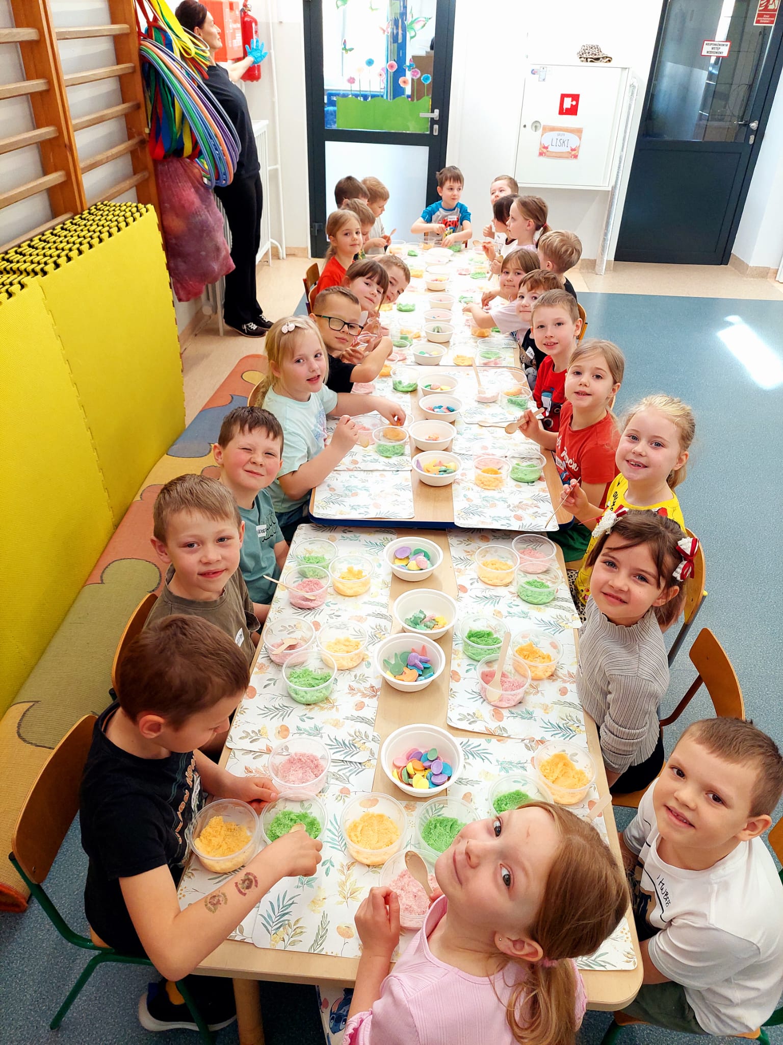 Podczas zajęć przedszkolaki tworzyły własne, niepowtarzalne świece z wykorzystaniem soli, barwników oraz ozdób wielkanocnych z wosku sojowego. Wśród dekoracji pojawiały się urocze zajączki, kolorowe jajeczka oraz wiosenne motywy, które nadawały pracom wyjątkowy, świąteczny charakter i mnóstwo kolorów wiosny .