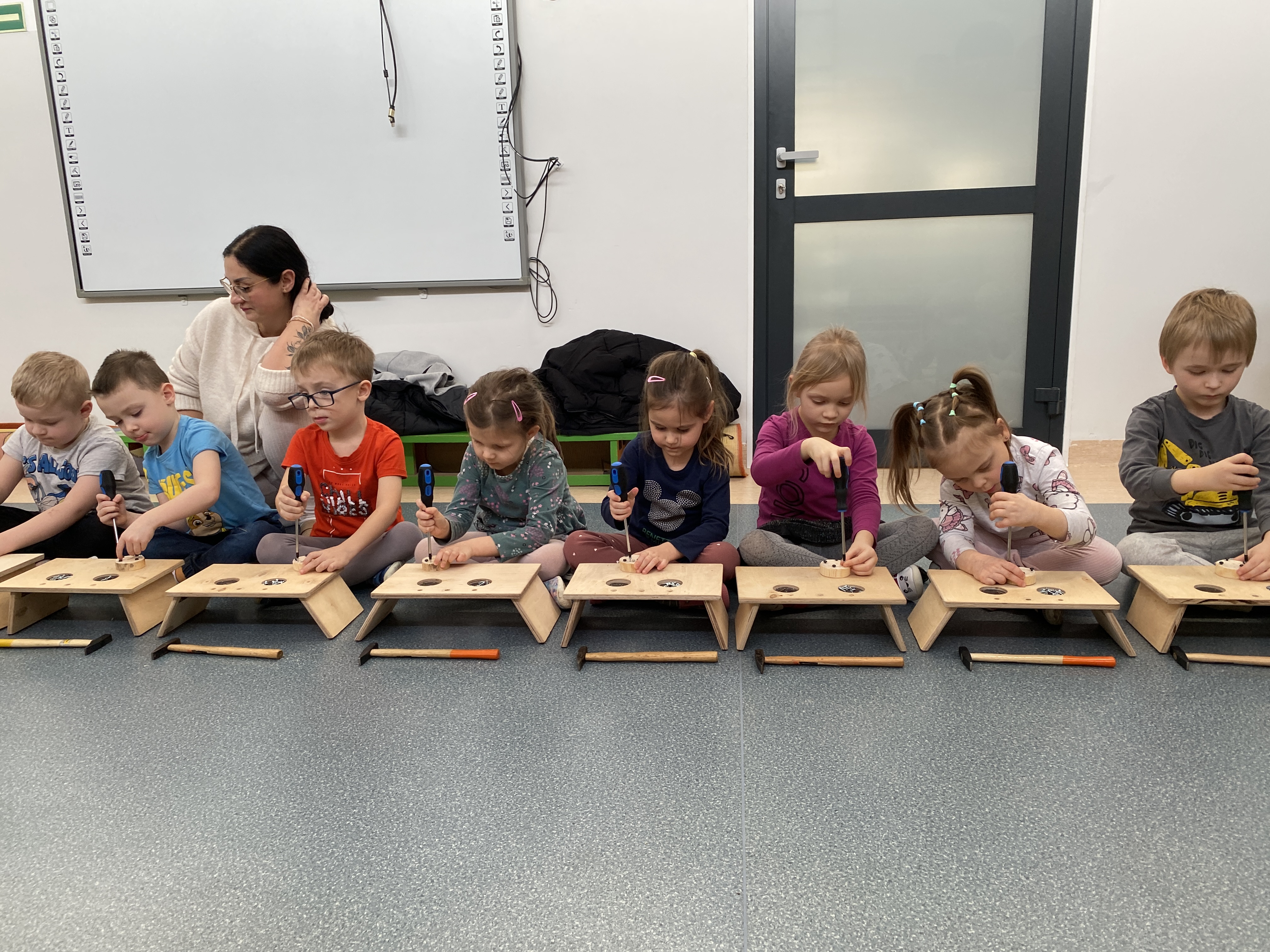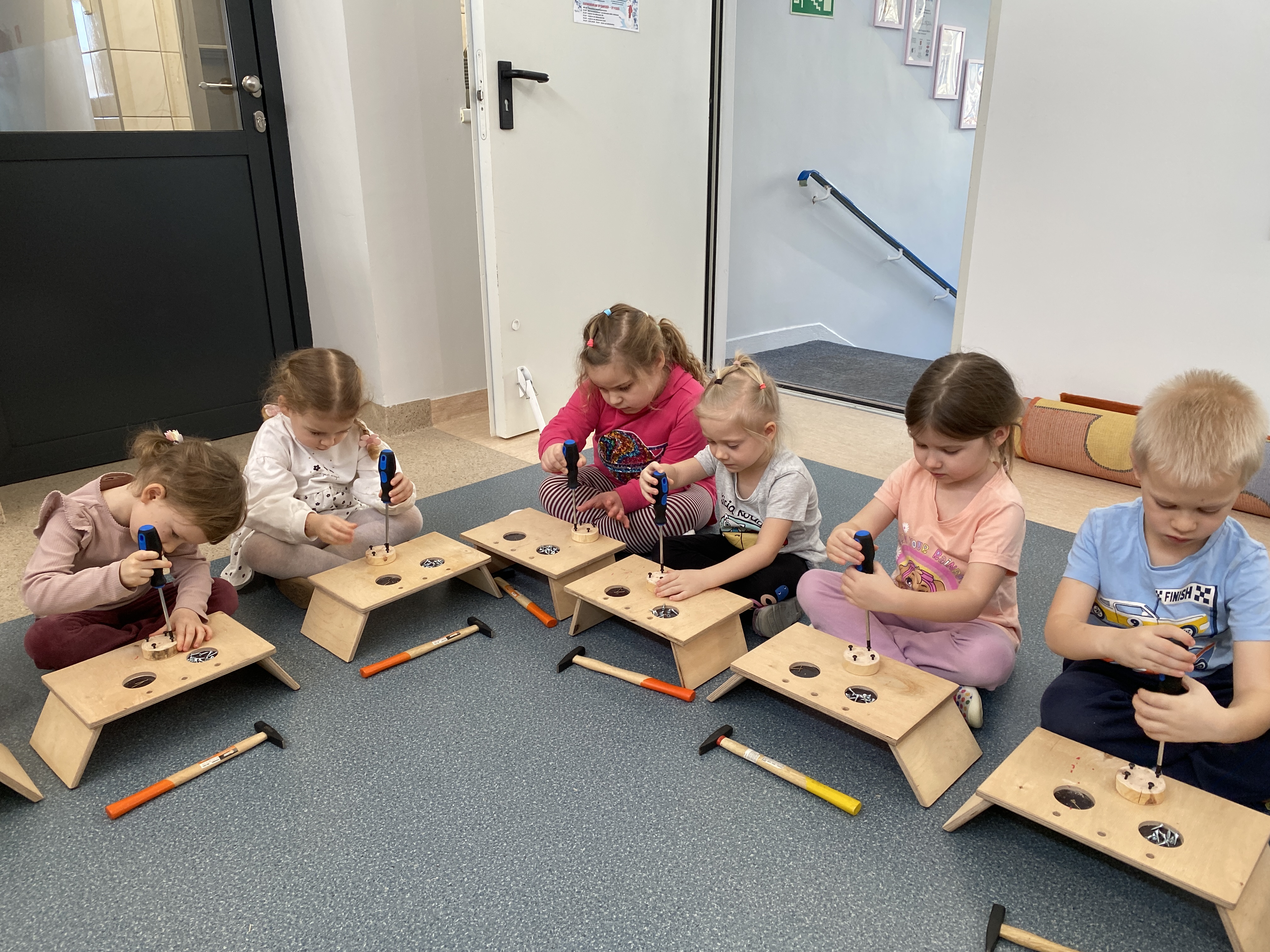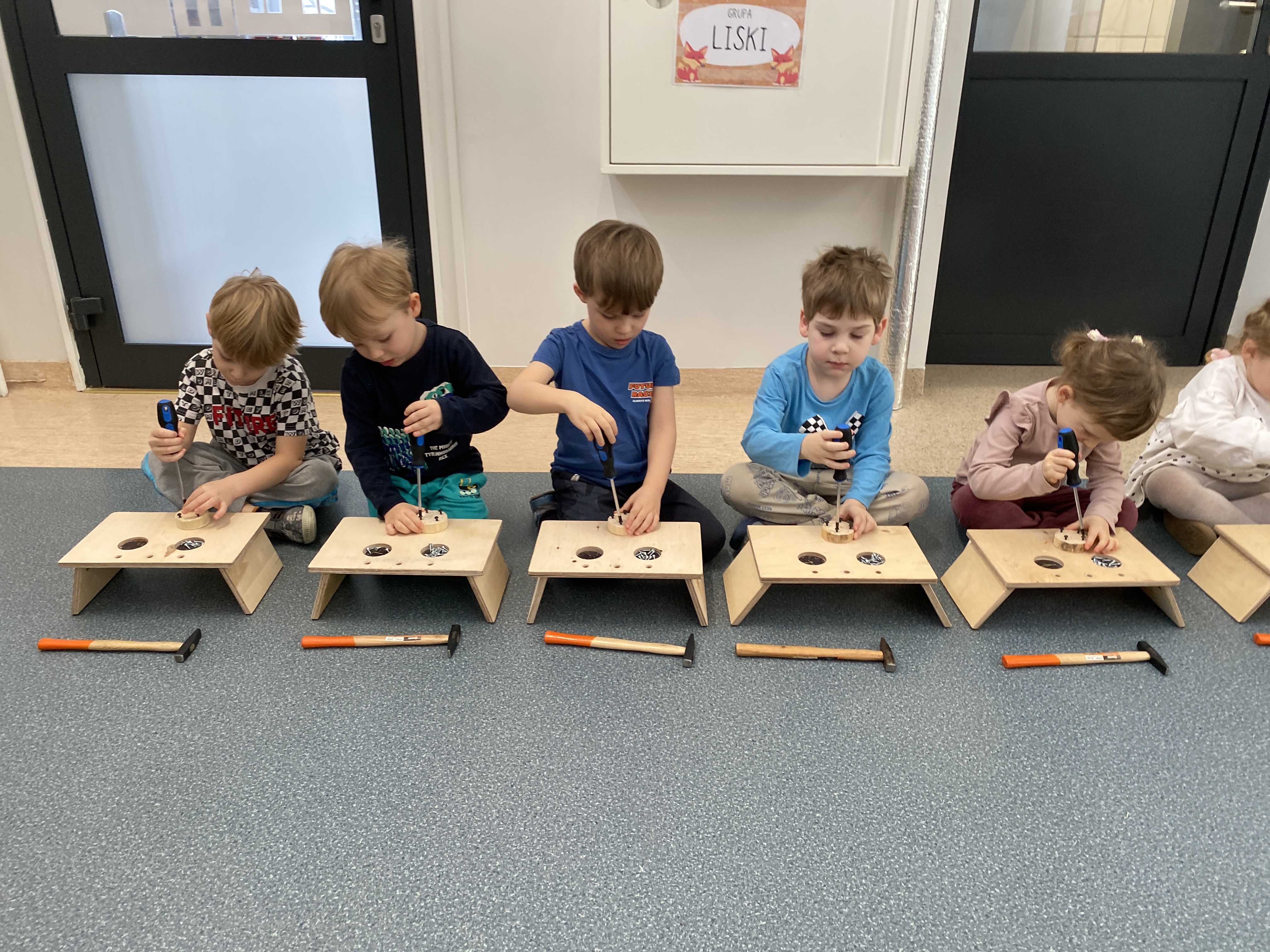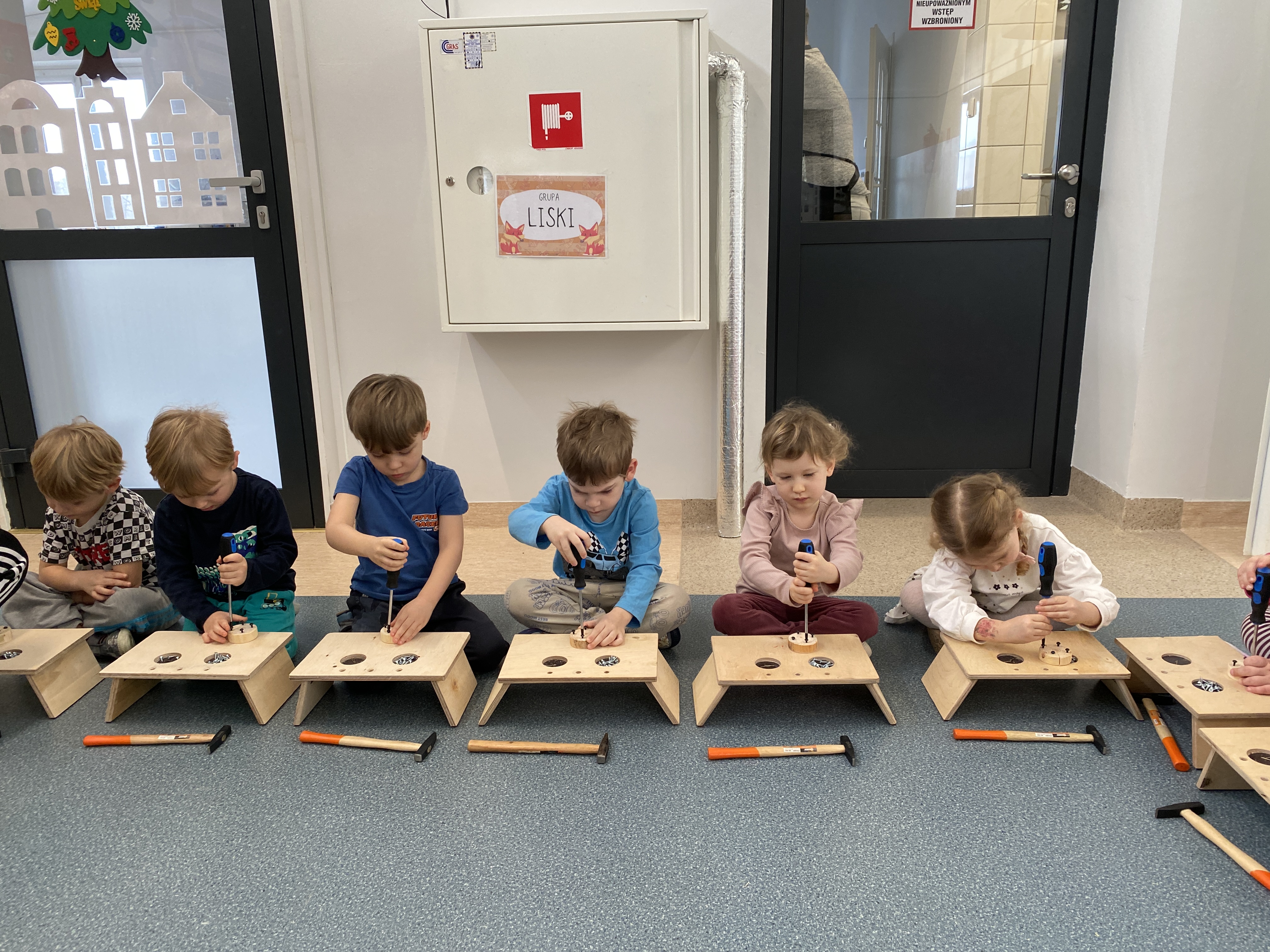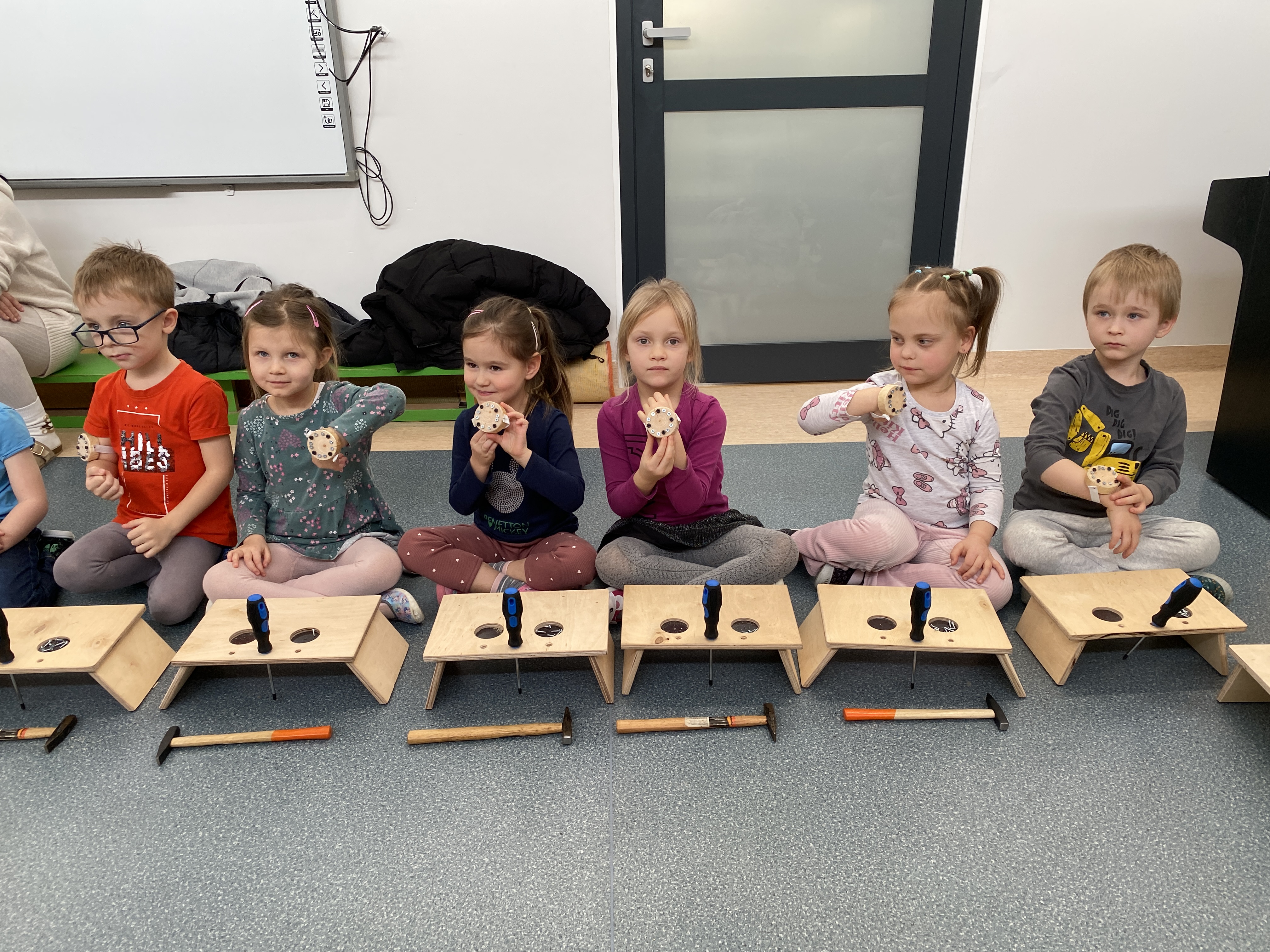 8 stycznia Kreciki miały przyjemność wziąć udział w warszatach z majsterkowania. Dzieci z ogromnym zaangażowaniem wykonywały drewniane zegarki na rękę. Samodzielnie wkręcały śrubki oraz przybijały gwoździe, ćwicząc przy tym sprawność manualną i koordynację ruchową. Zajęcia sprawiły dzieciom wiele radości i były doskonałą okazją do rozwijania kreatywności oraz samodzielności.