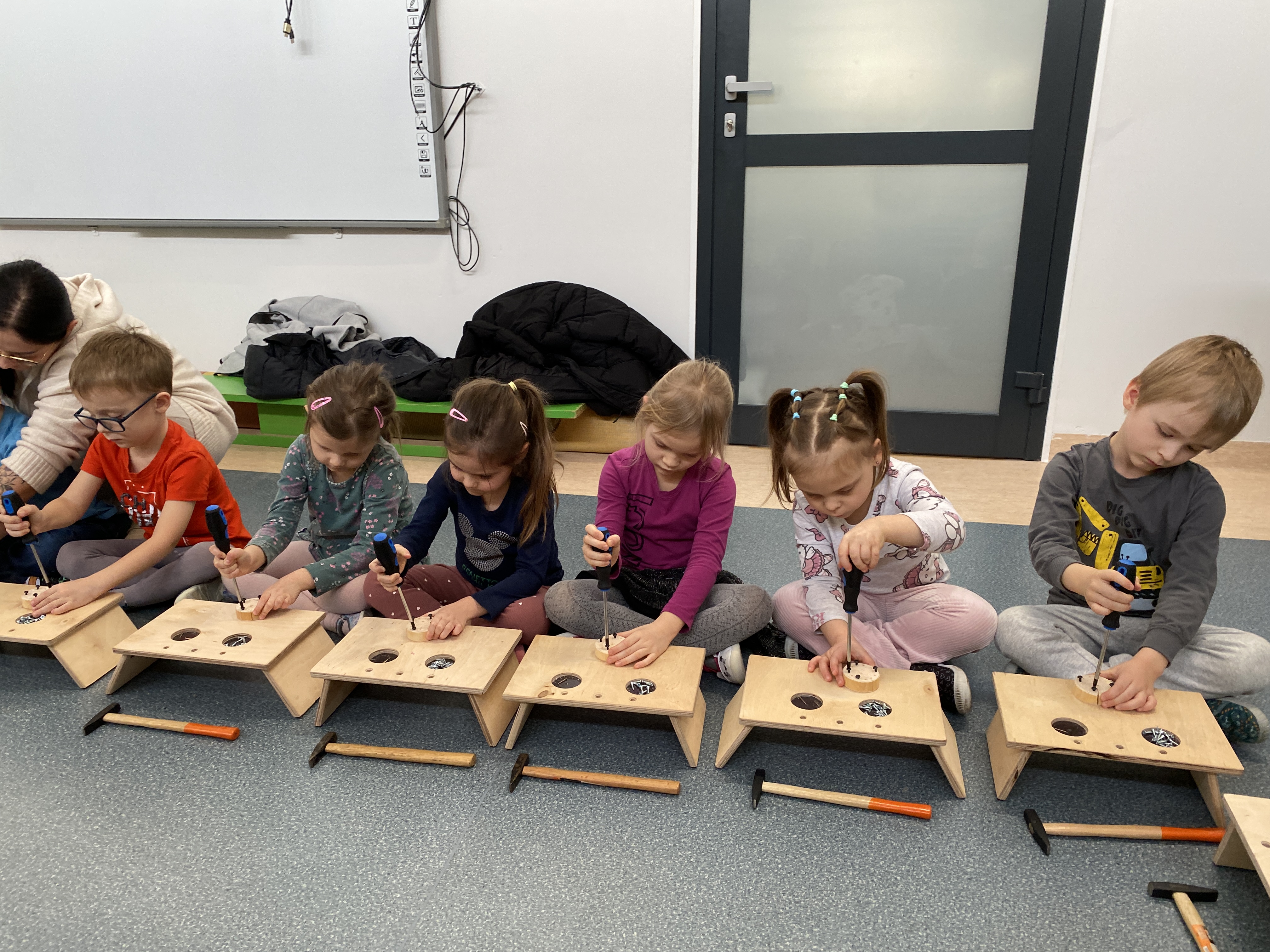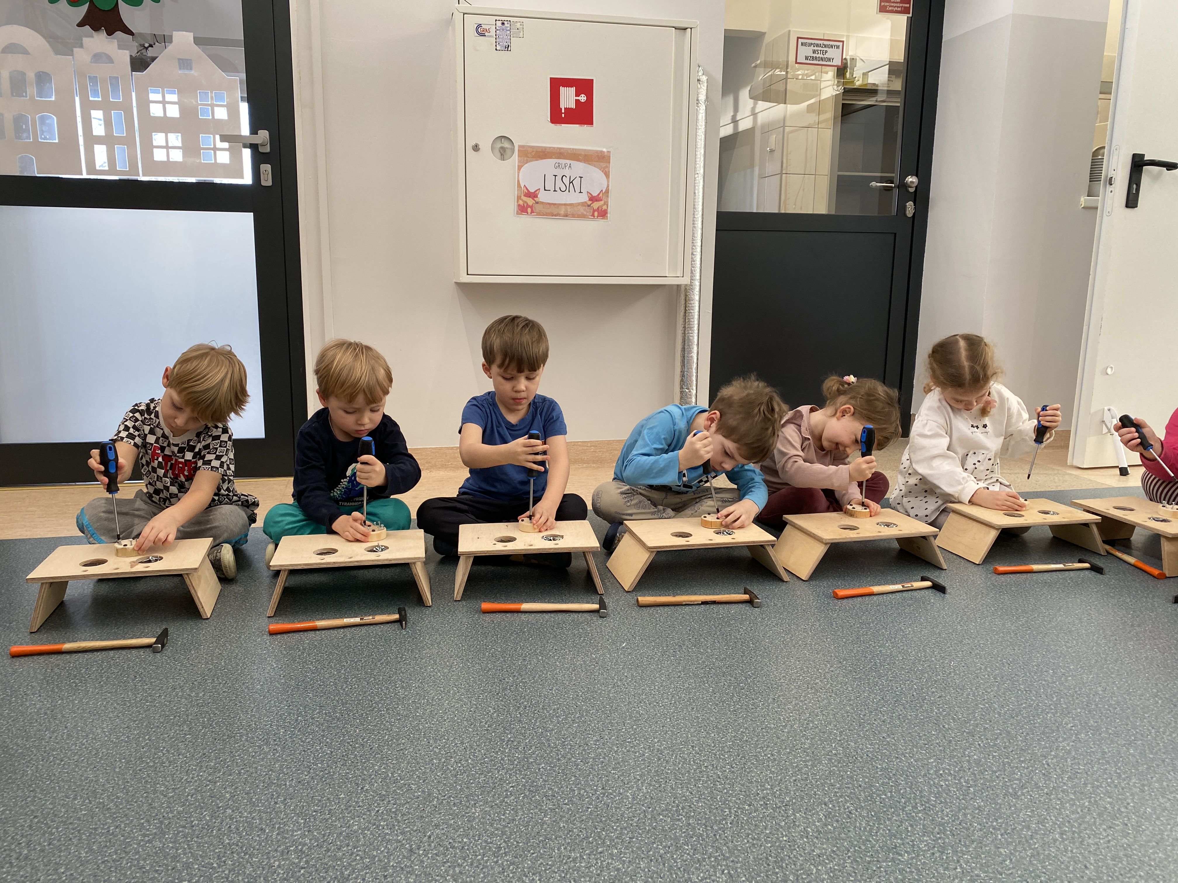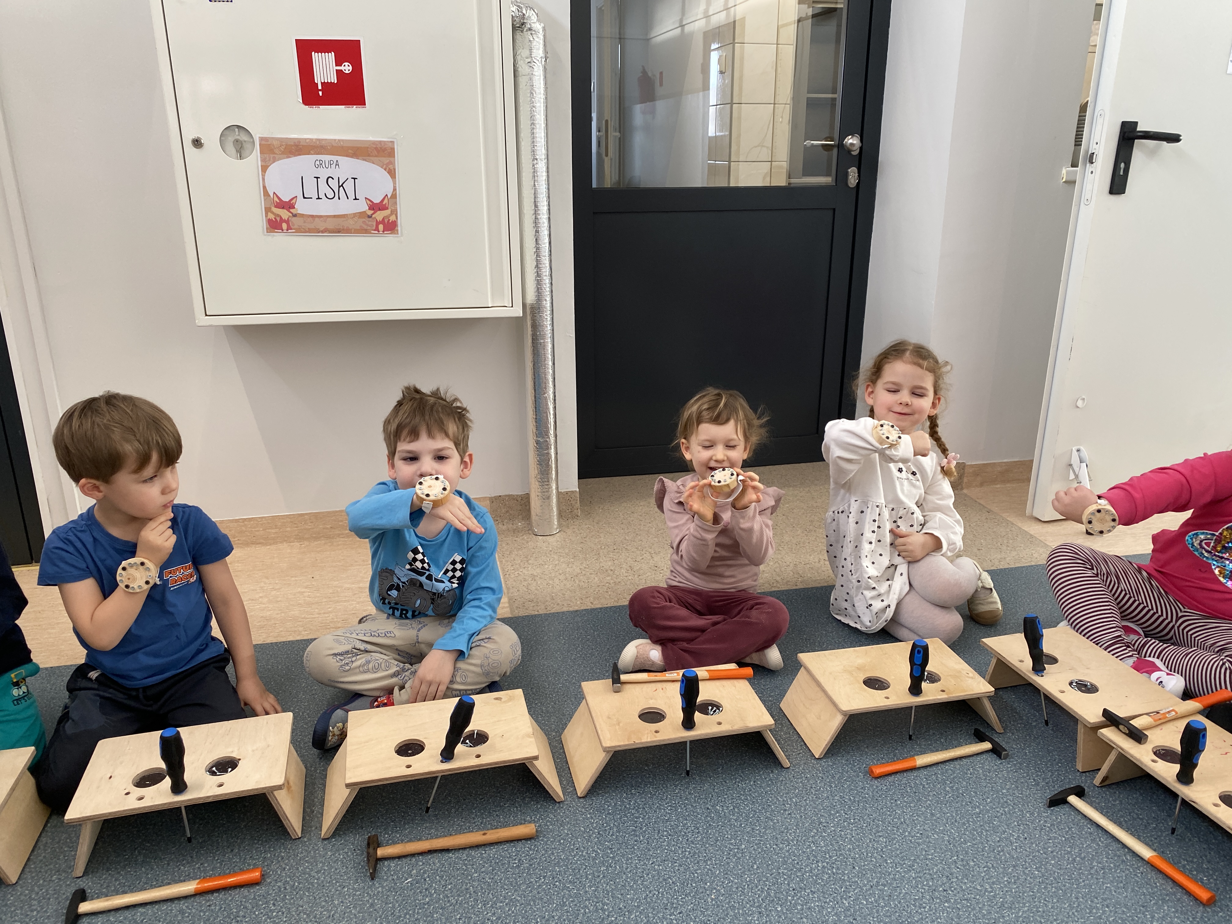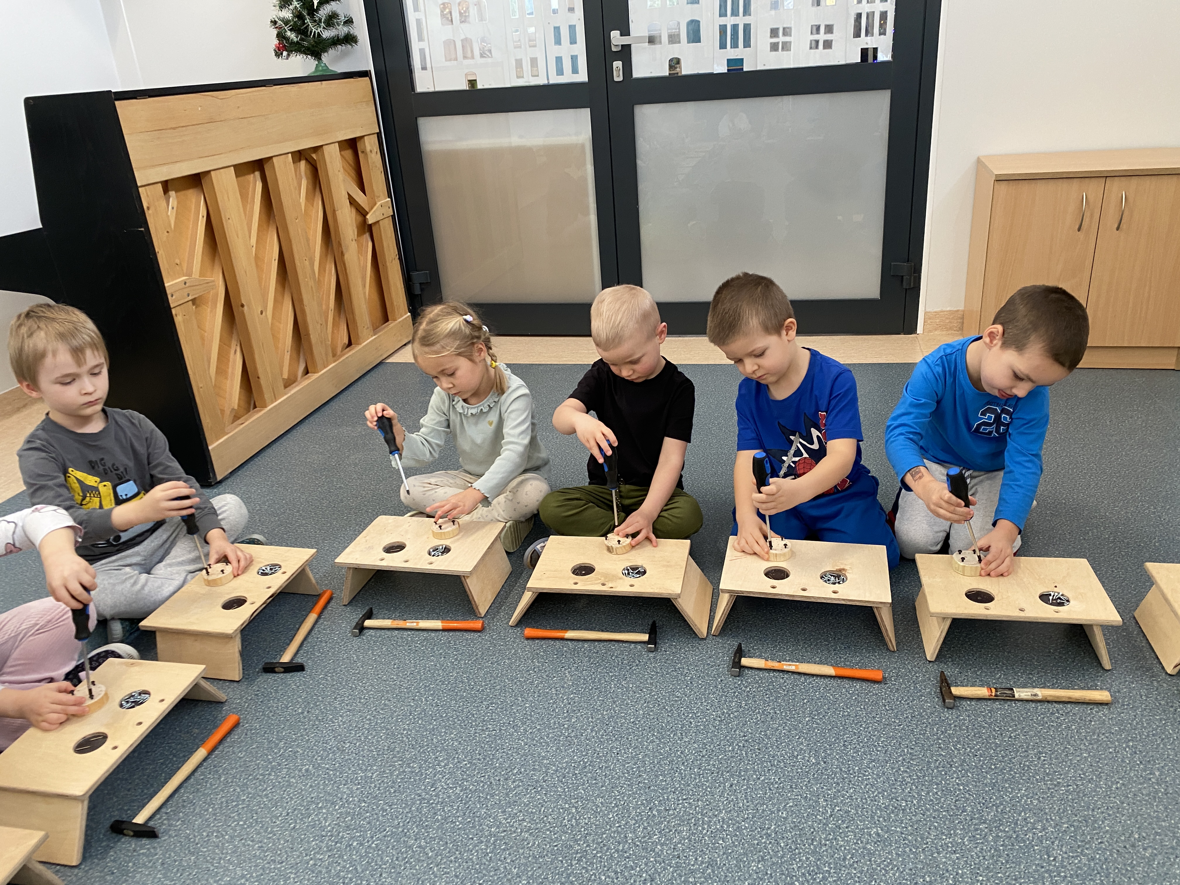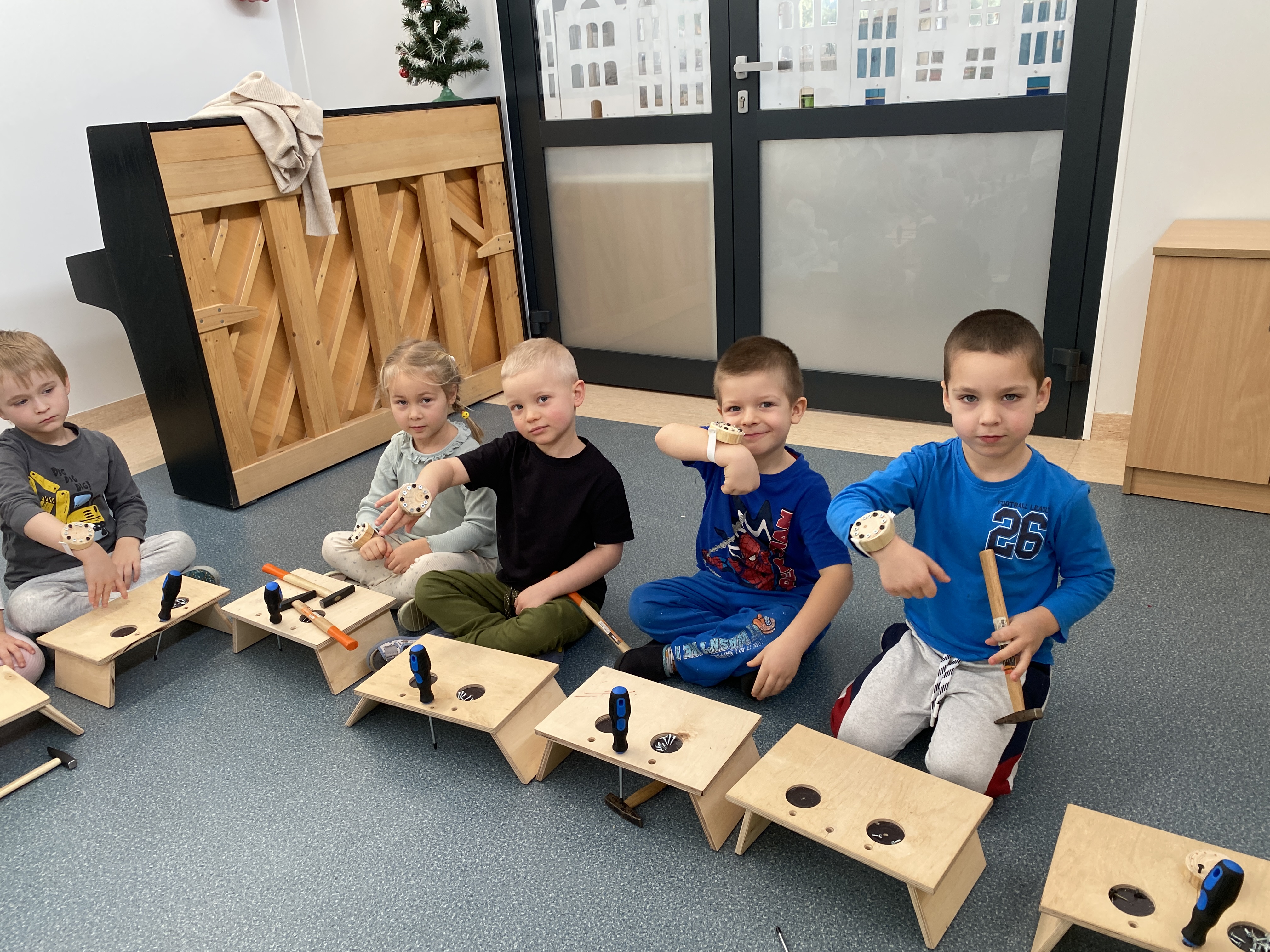 8 stycznia Kreciki miały przyjemność wziąć udział w warszatach z majsterkowania. Dzieci z ogromnym zaangażowaniem wykonywały drewniane zegarki na rękę. Samodzielnie wkręcały śrubki oraz przybijały gwoździe, ćwicząc przy tym sprawność manualną i koordynację ruchową. Zajęcia sprawiły dzieciom wiele radości i były doskonałą okazją do rozwijania kreatywności oraz samodzielności.