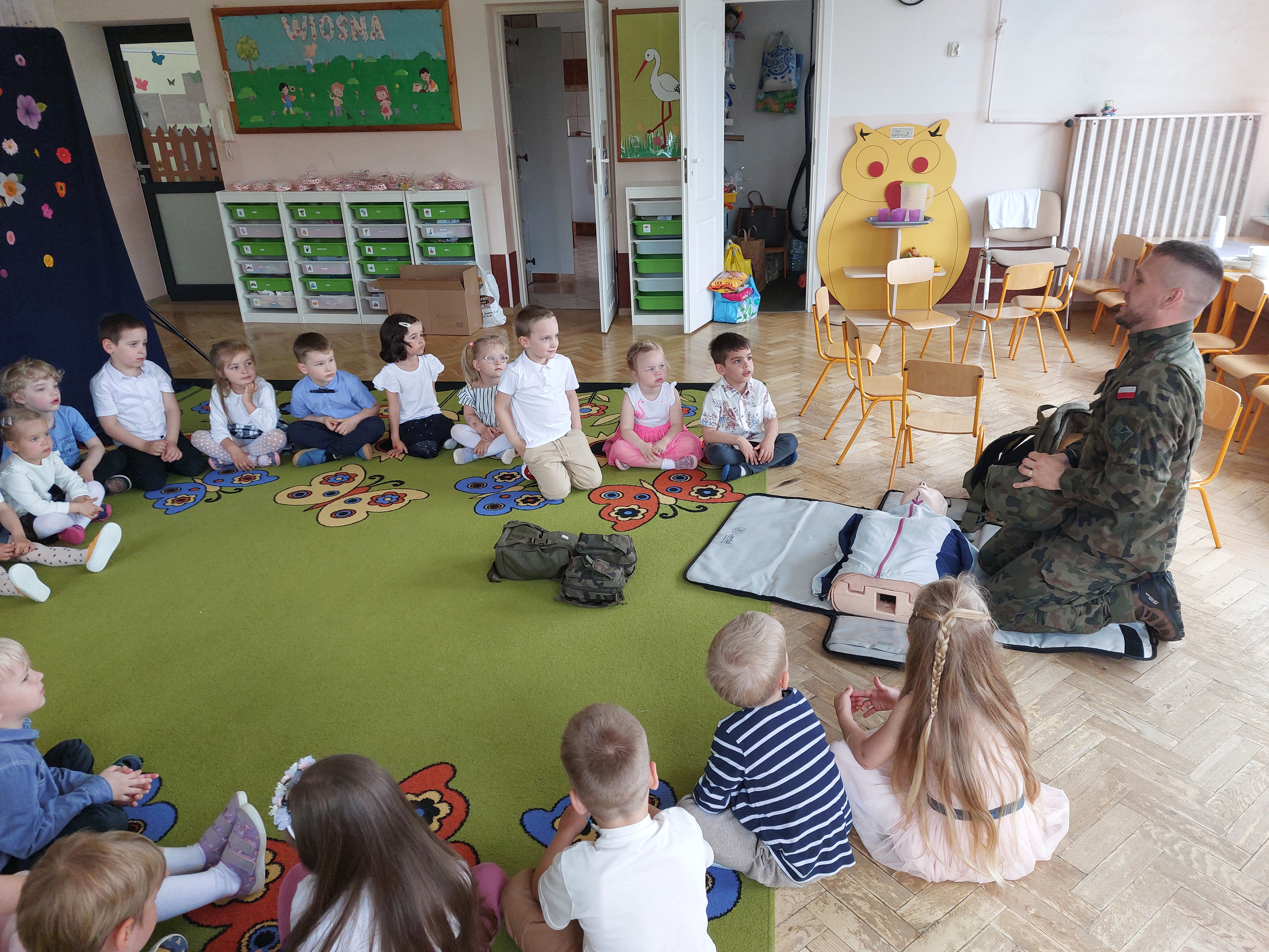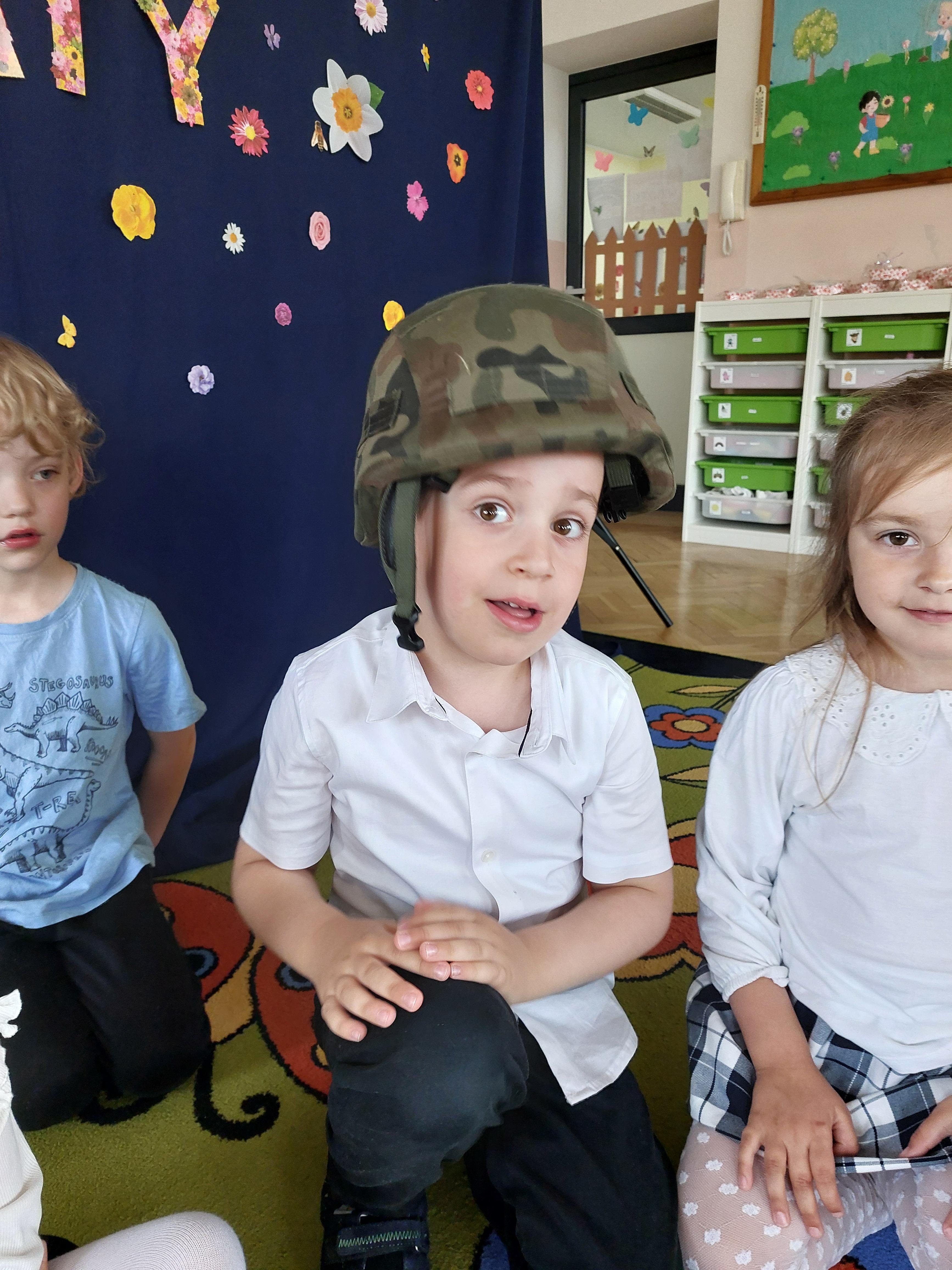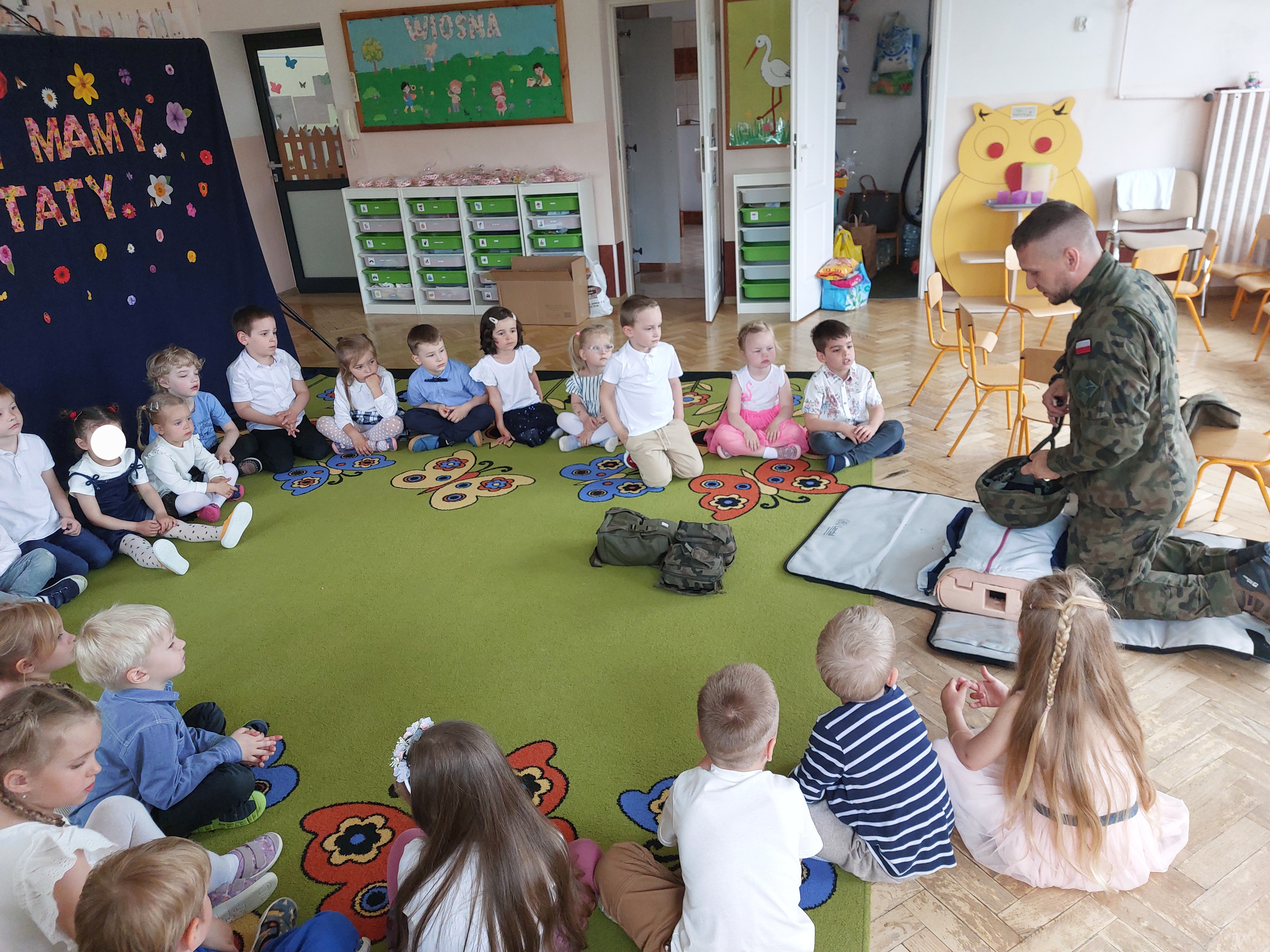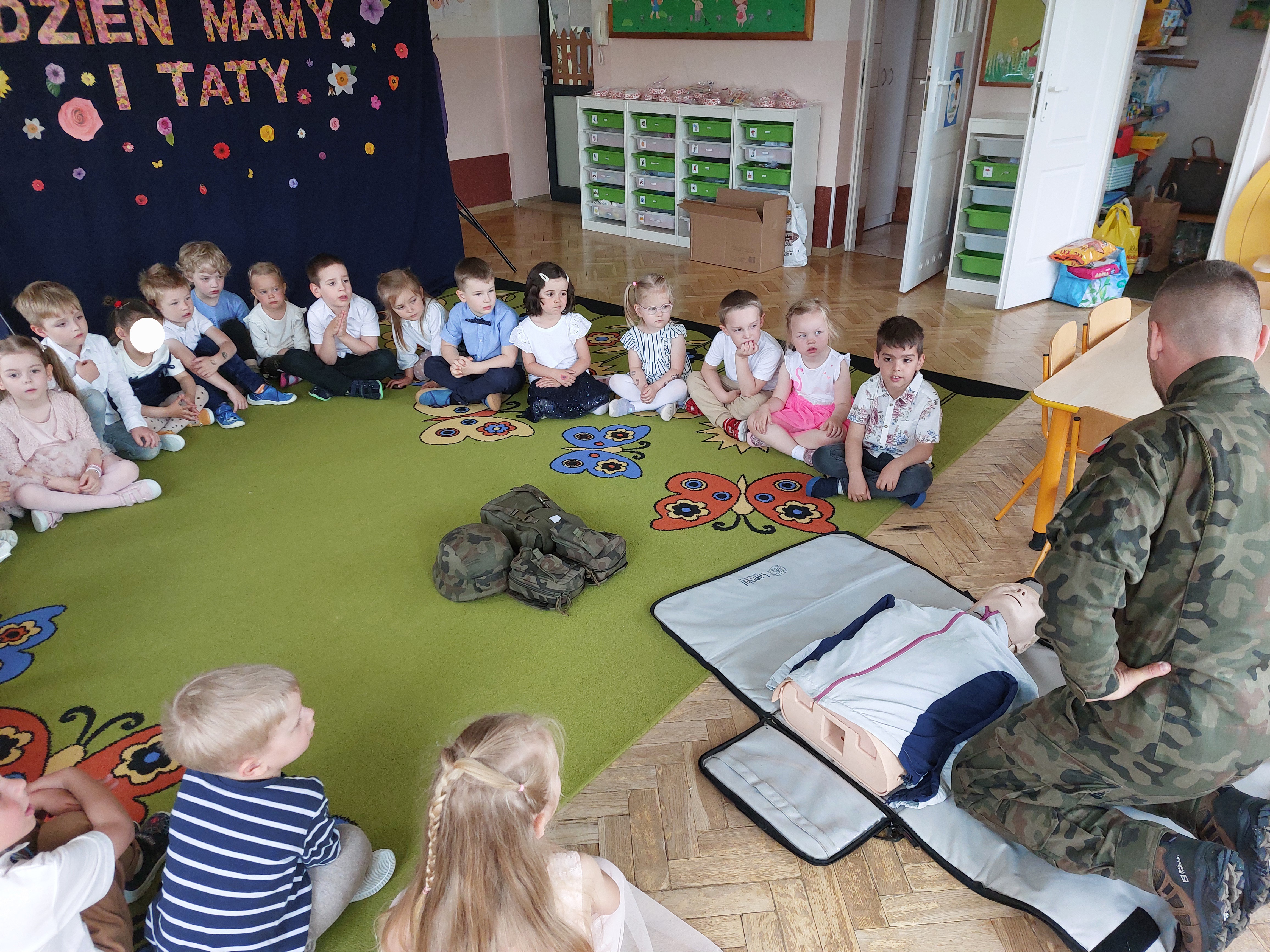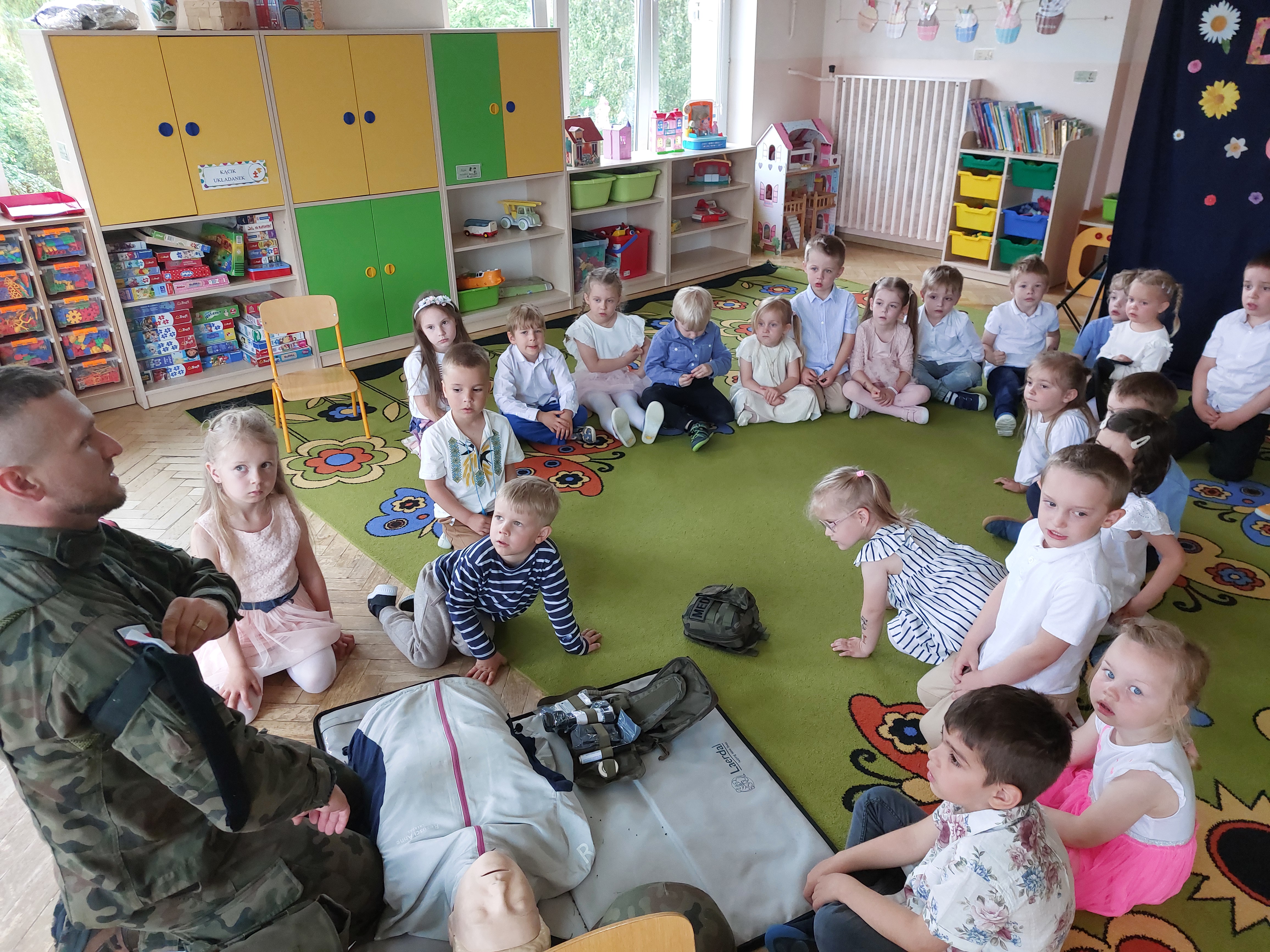 W dniu 5.06 nasze przedszkole odwiedził żołnierz z 49 Bazy Lotniczej w Pruszczu Gdańskim. Przy pomocy fantoma zaprezentował nam, jak przeprowadza się pierwszą pomoc, opowiedział nam o swojej pracy i pokazał przedmioty z wyposażenia, które posiada każdy żołnierz. Chętne dzieci mogły przymierzyć nawet prawdziwy wojskowy hełm! To nietypowe spotkanie wzbudziło wśród dzieci wiele emocji, a pytaniom nie było końca.