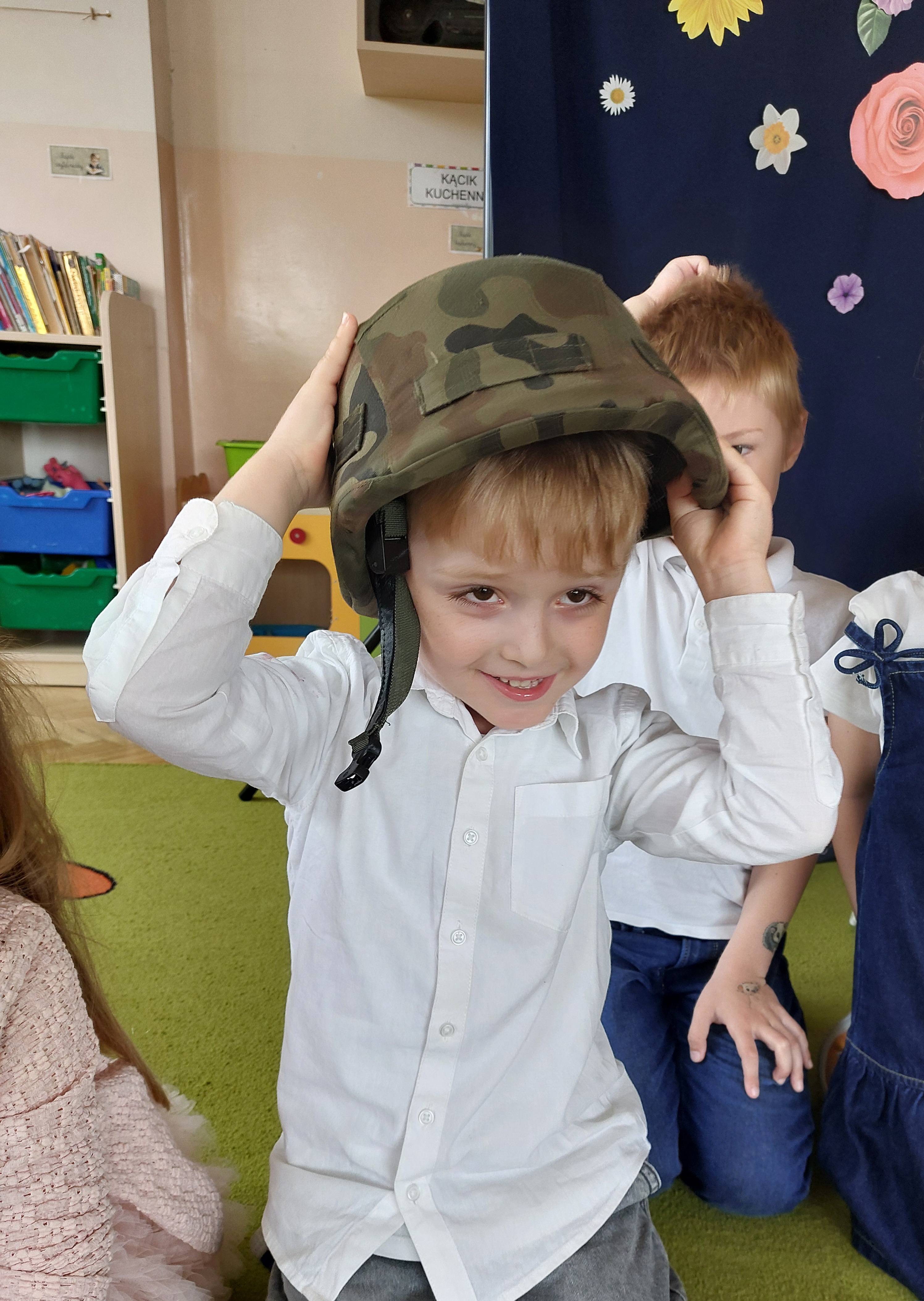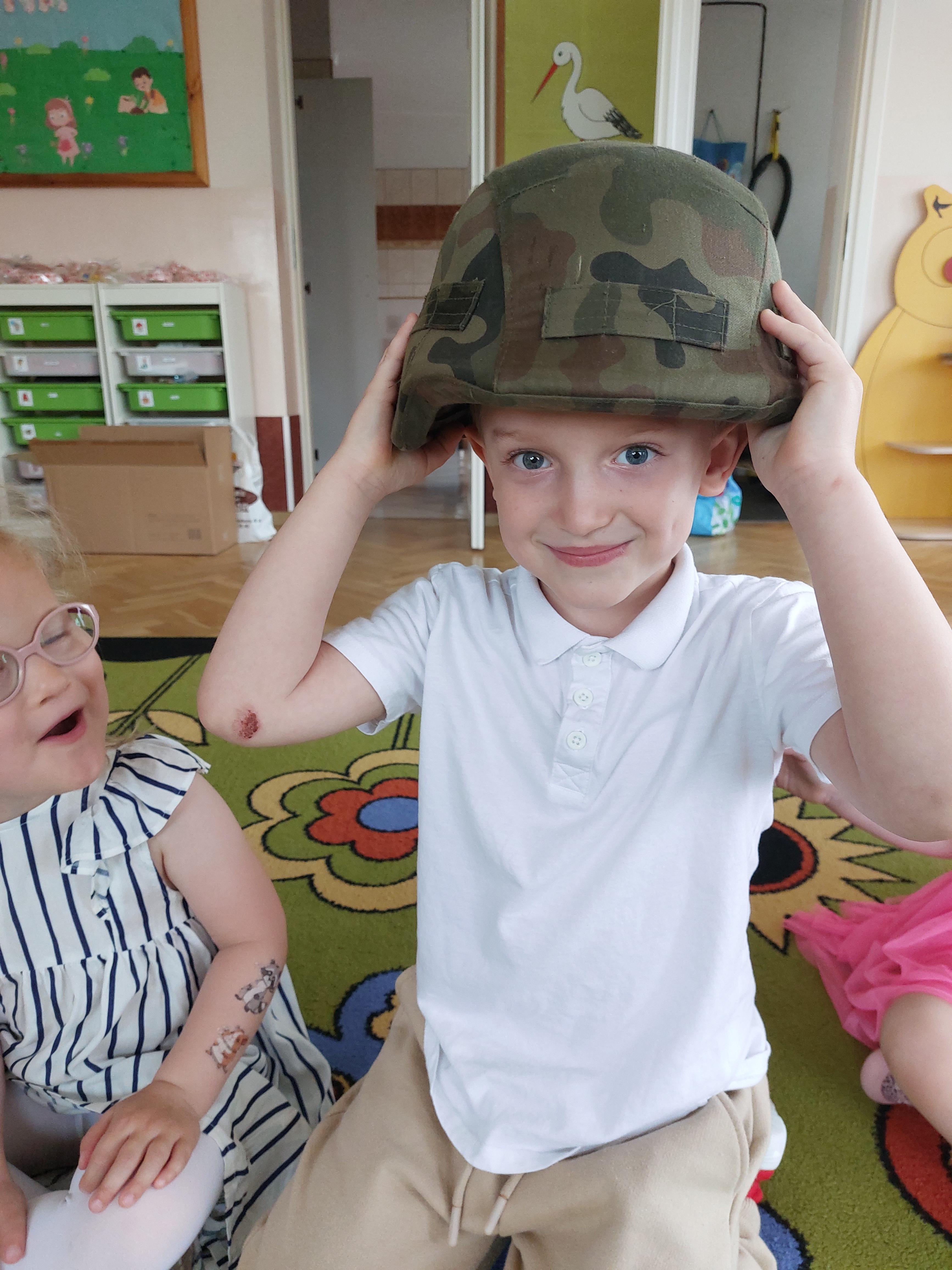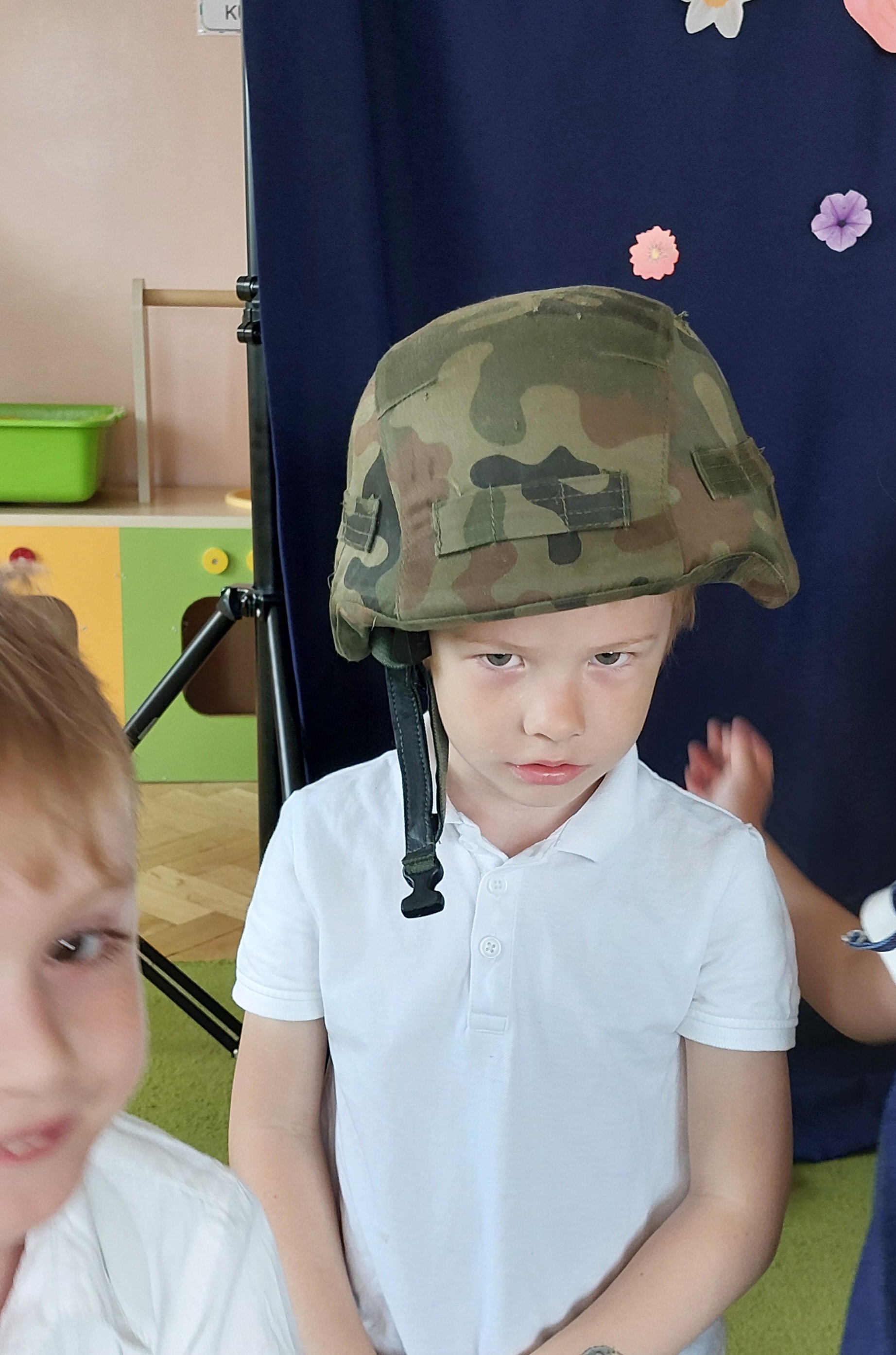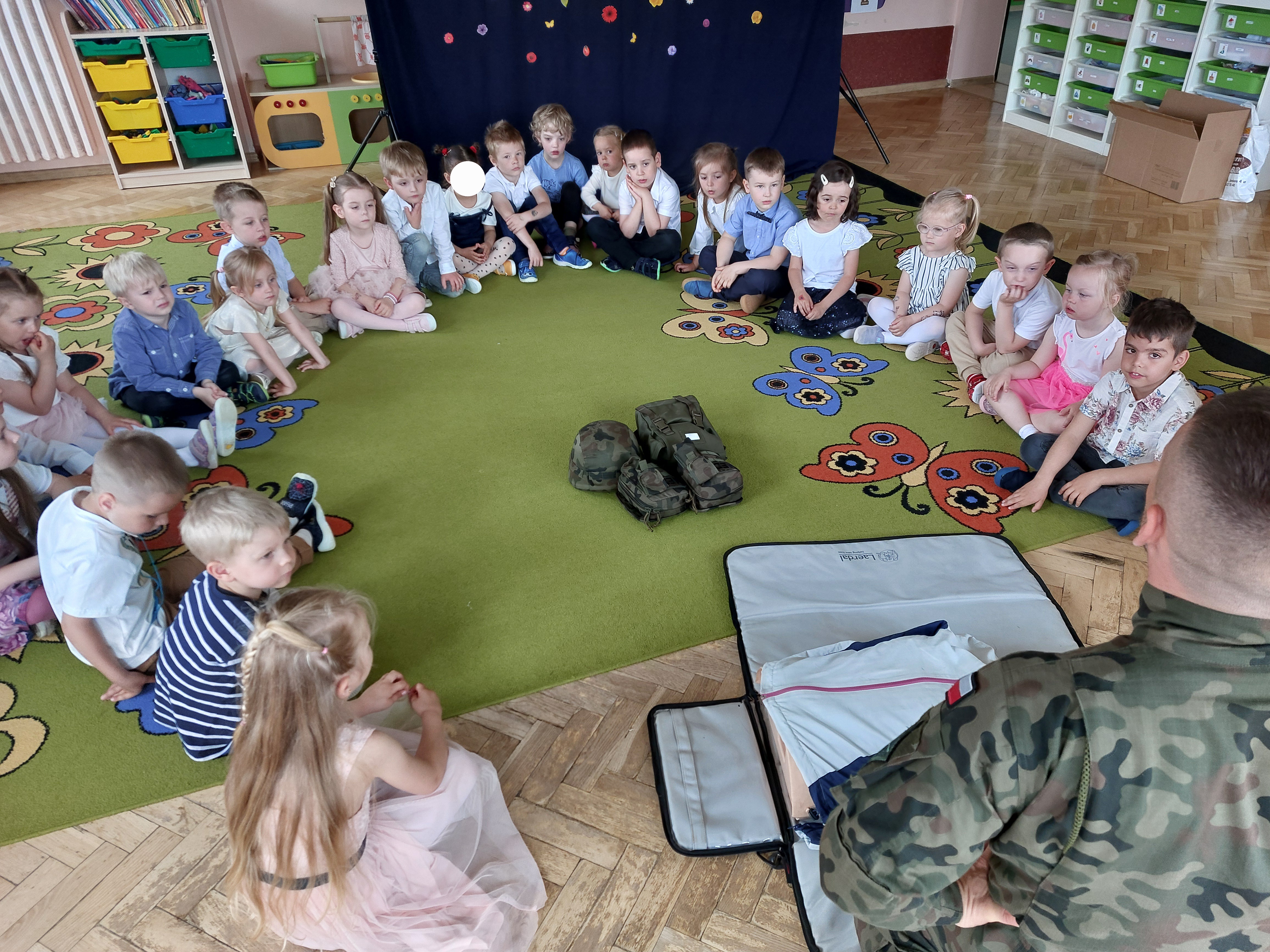 W dniu 5.06 nasze przedszkole odwiedził żołnierz z 49 Bazy Lotniczej w Pruszczu Gdańskim. Przy pomocy fantoma zaprezentował nam, jak przeprowadza się pierwszą pomoc, opowiedział nam o swojej pracy i pokazał przedmioty z wyposażenia, które posiada każdy żołnierz. Chętne dzieci mogły przymierzyć nawet prawdziwy wojskowy hełm! To nietypowe spotkanie wzbudziło wśród dzieci wiele emocji, a pytaniom nie było końca.