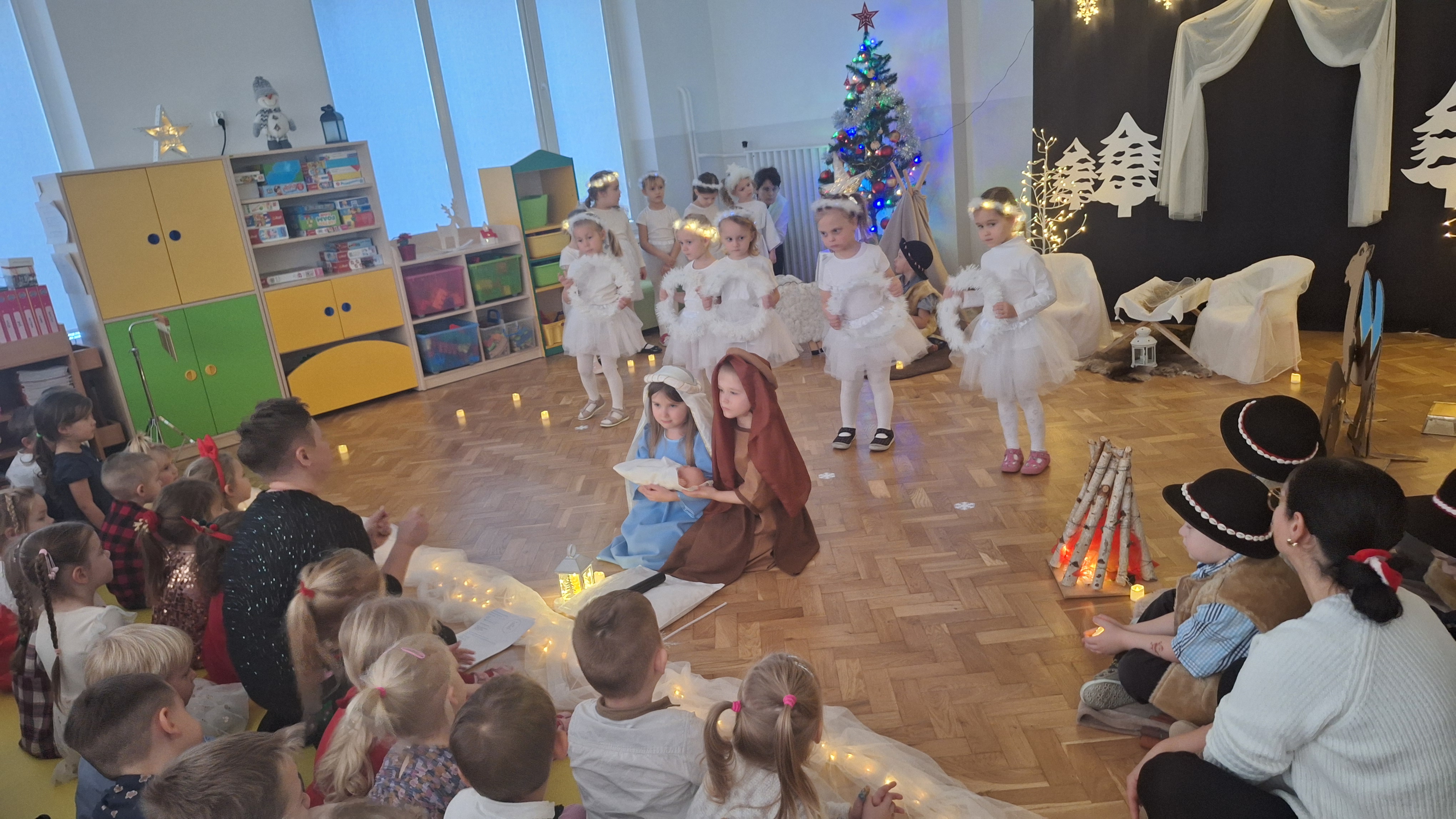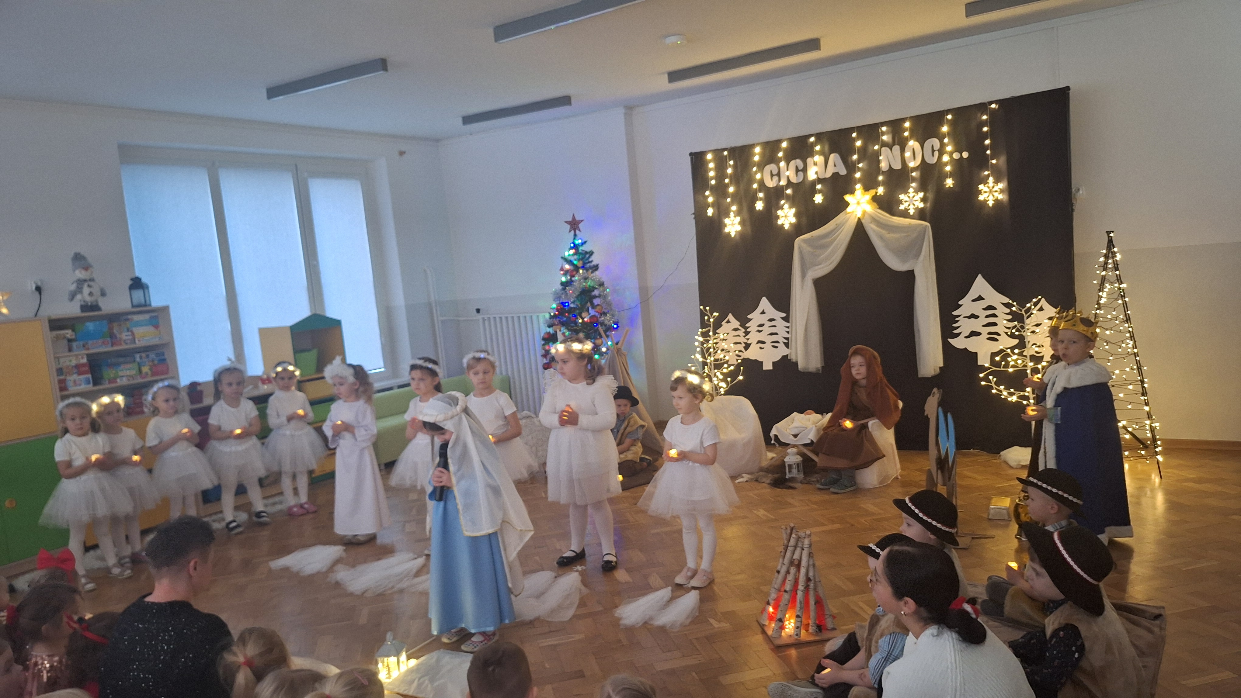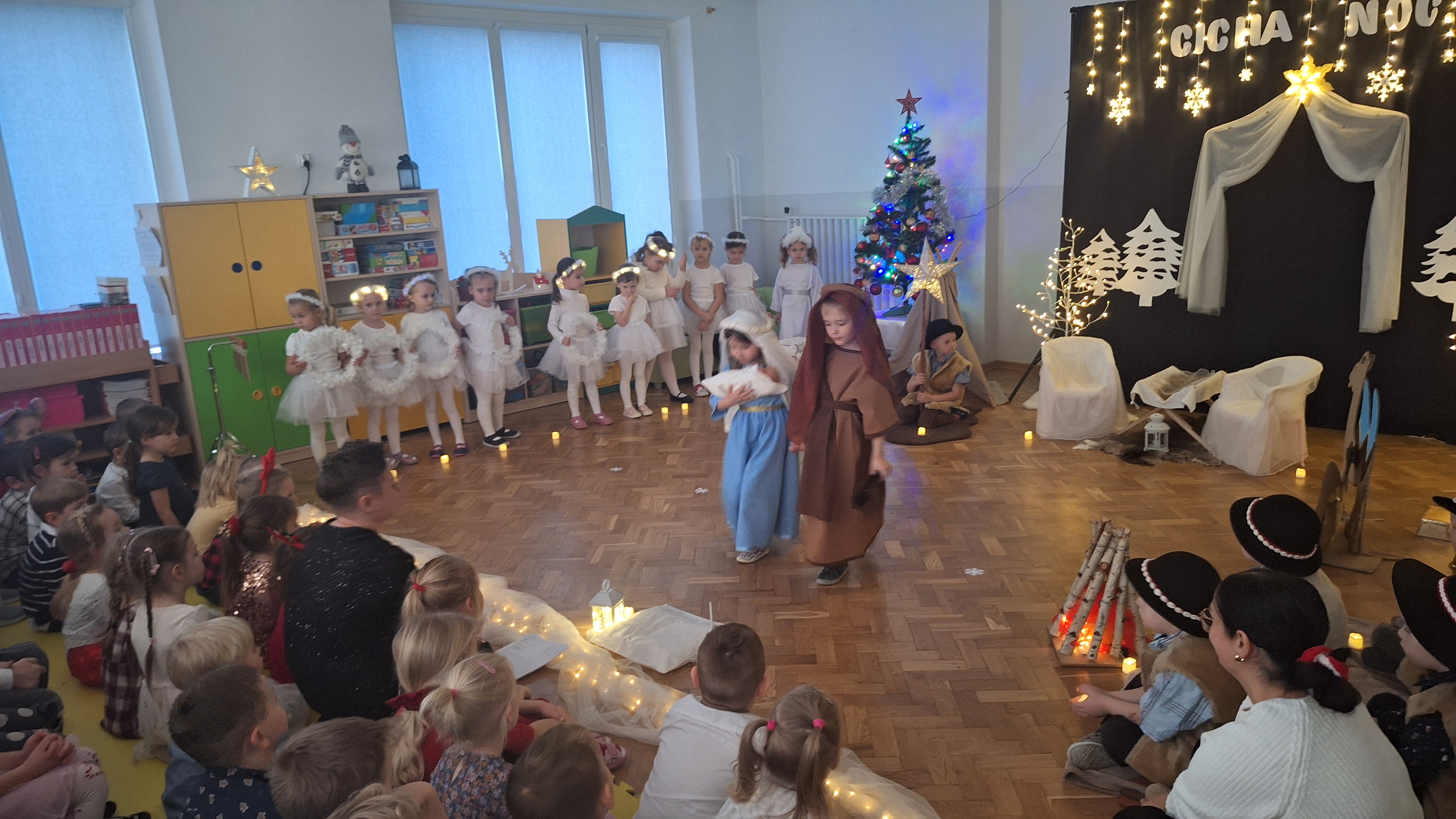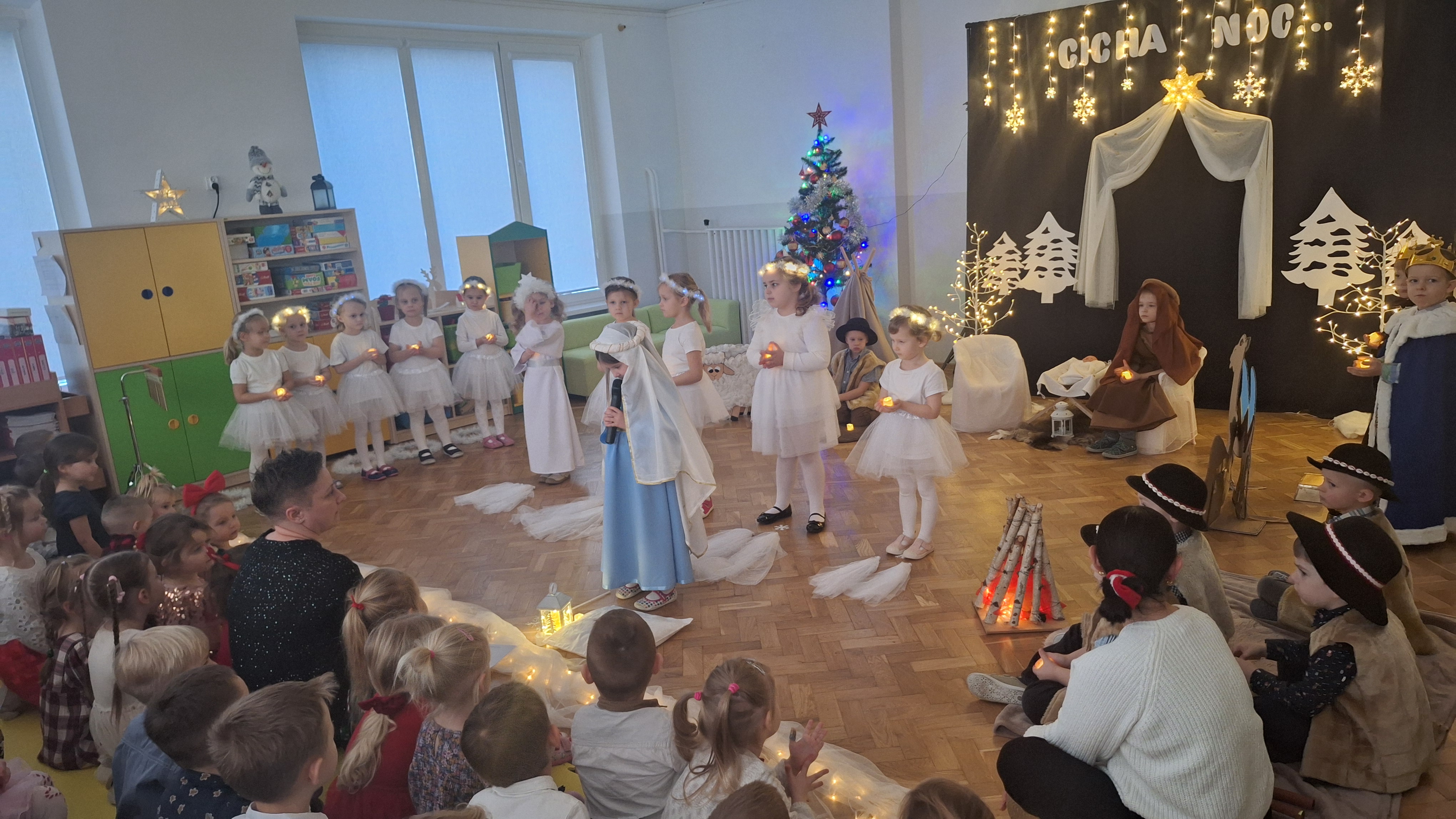 W naszym przedszkolu odbyła się uroczysta, grupowa Wigilia, którą poprzedziły piękne jasełka w wykonaniu grupy "Kreciki”. Mali artyści z wielkim zaangażowaniem wprowadzili nas w świąteczny nastrój, przypominając o tradycjach i radości Bożego Narodzenia.