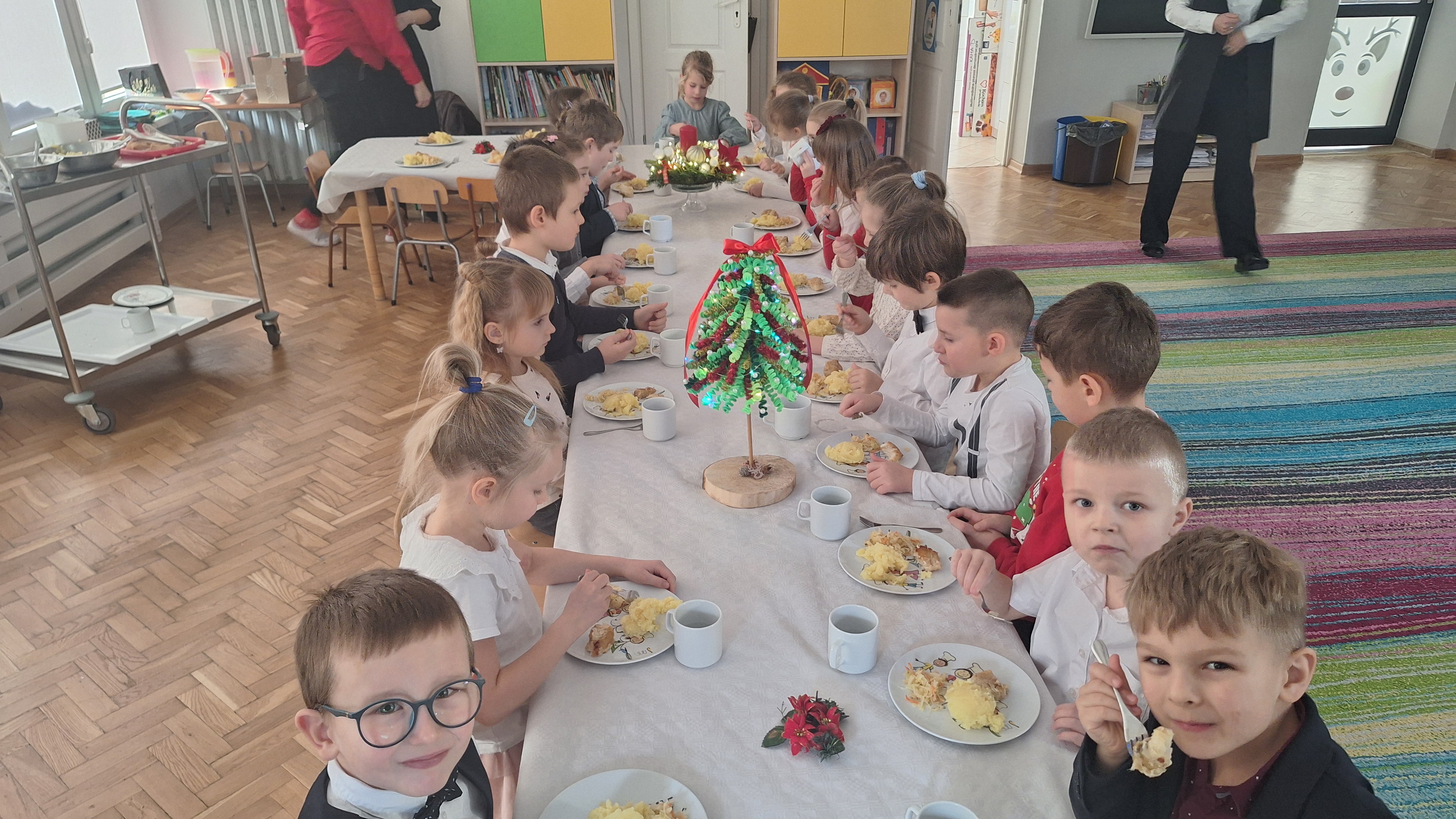 Następnie wszyscy udali się do swoich sal, gdzie przy akompaniamencie kolęd dzieci podzieliły się opłatkiem, składając sobie świąteczne życzenia. Uroczystość zakończył wspólny, odświętny obiad wigilijny.