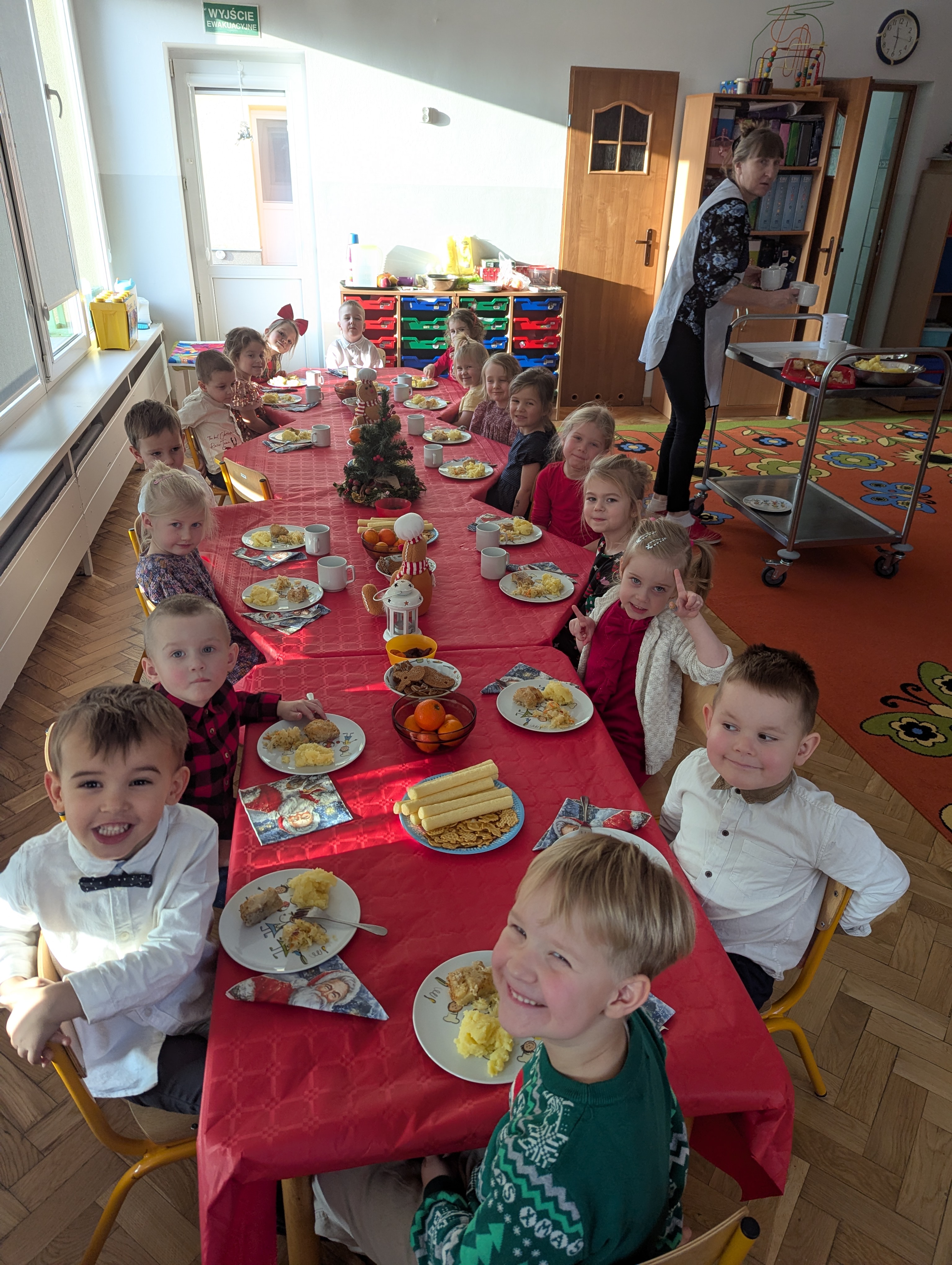 Dnia 19.12.2025 roku w naszym przedszkolu odbyła się wigilia grupowa. Dzieci ubrane były odświętnie, a pięknie przystrójony stół wprowadzał wszystkich w świąteczny nastrój. Wspólnie śpiewaliśmy kolędy oraz dzieliliśmy się opłatkiem, składając sobie serdeczne życzenia. Spotkanie przebiegło w ciepłej, radosnej i pełnej życzliwości atmosferze.