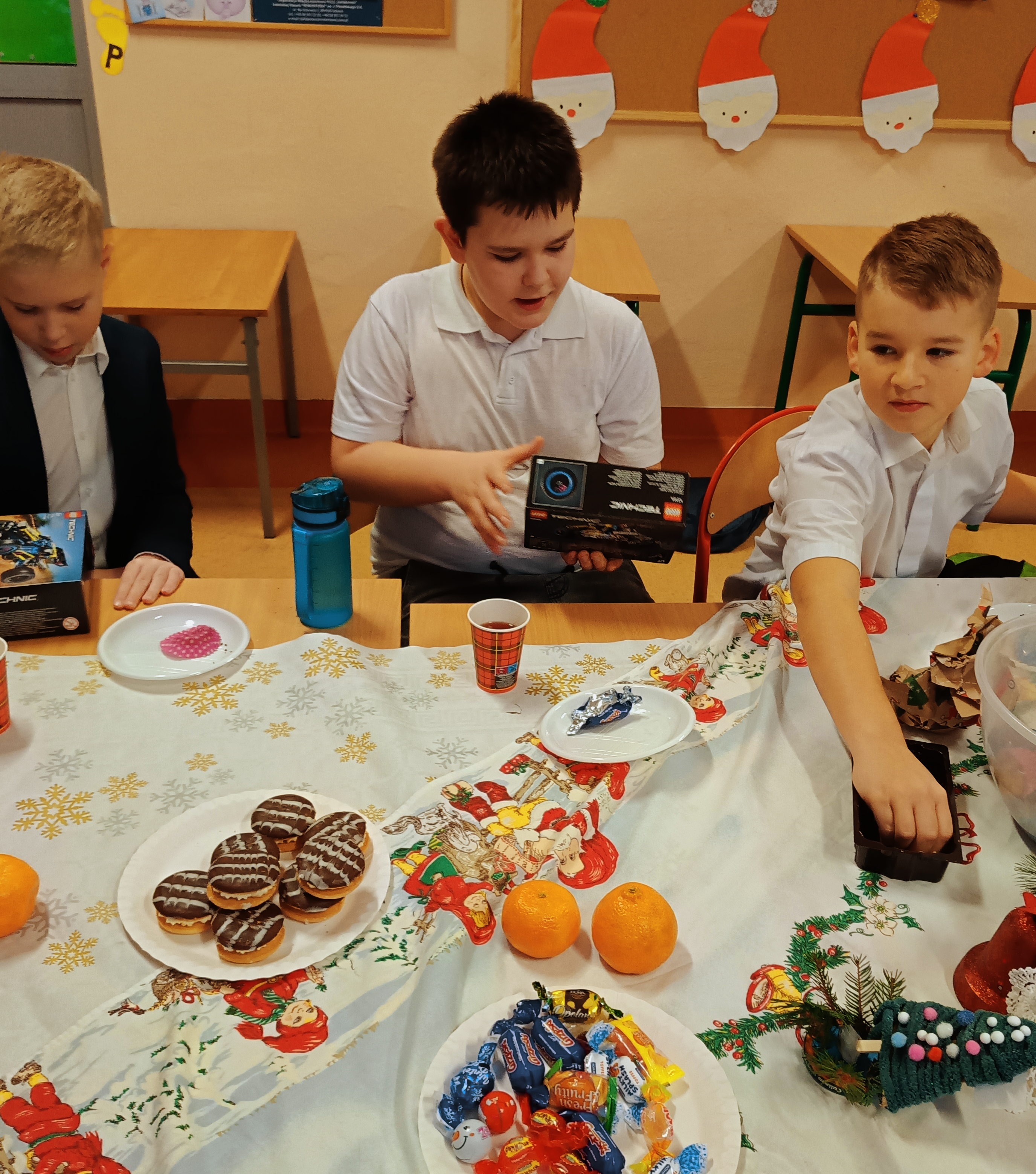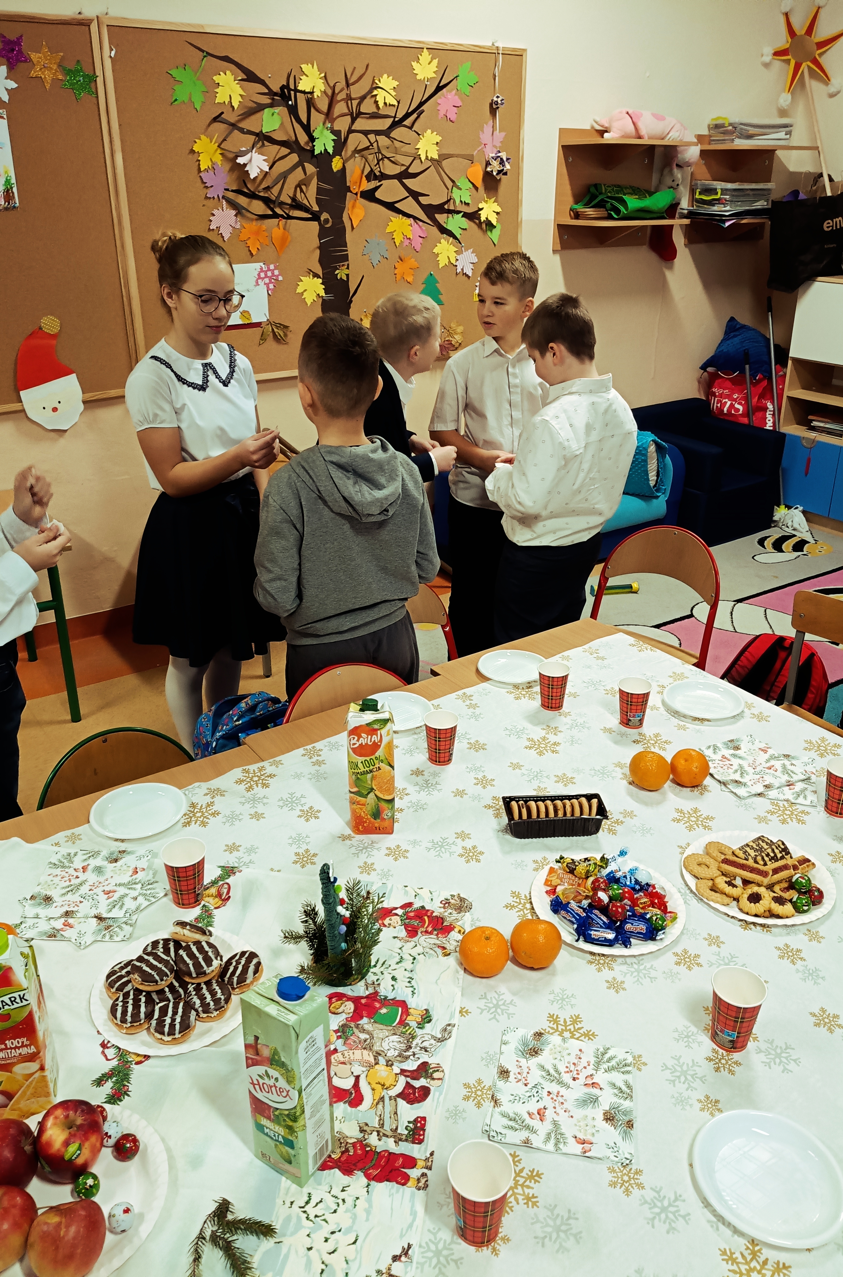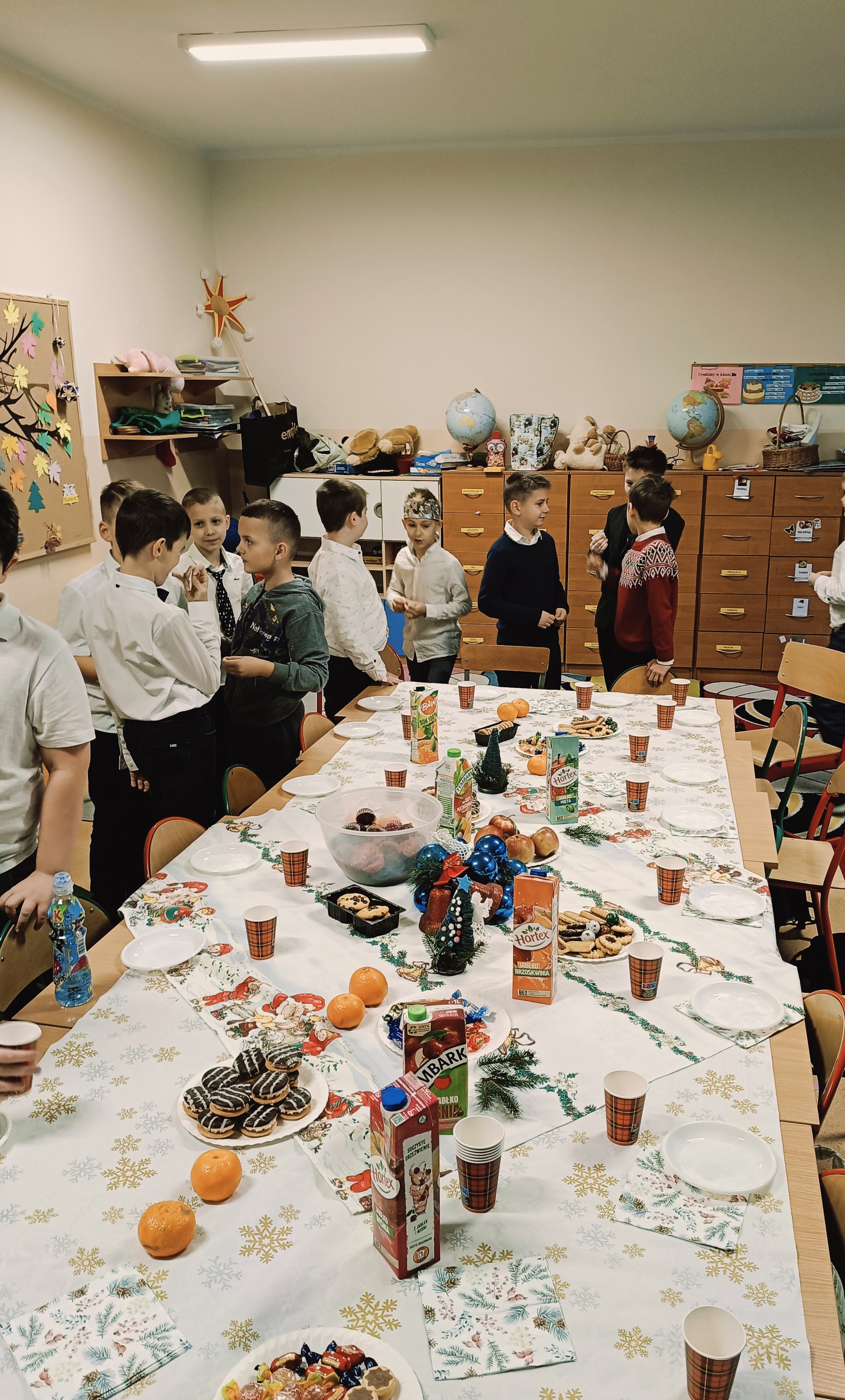 Uczniowie sami udekorowali stół wigilijny, na którym czekał słodki poczęstunek, a pod choinką znalazły się prezenty. Dzieci wraz z wychowawczynią dzieliły się opłatkiem, składały sobie serdeczne życzenia, śpiewały kolędy i cieszyły się wręczanymi upominkami.