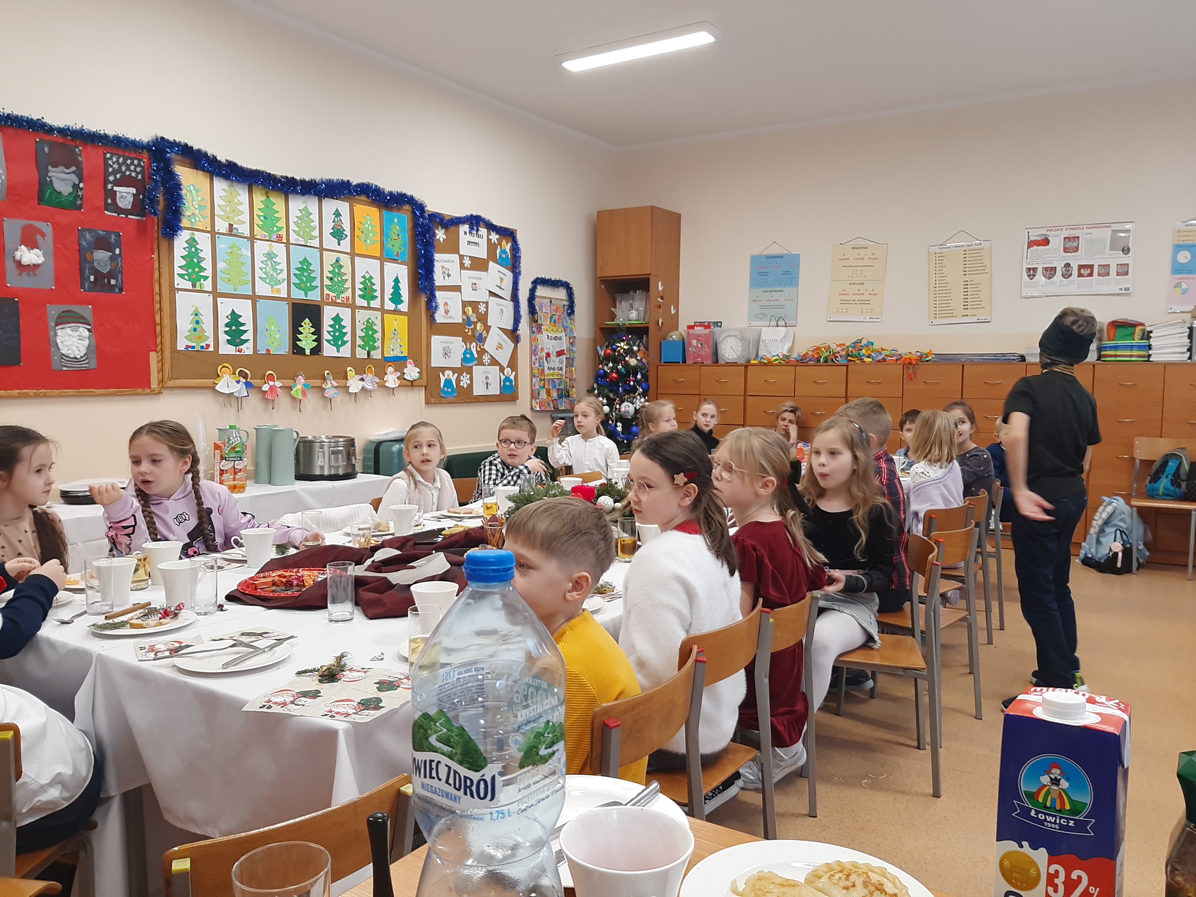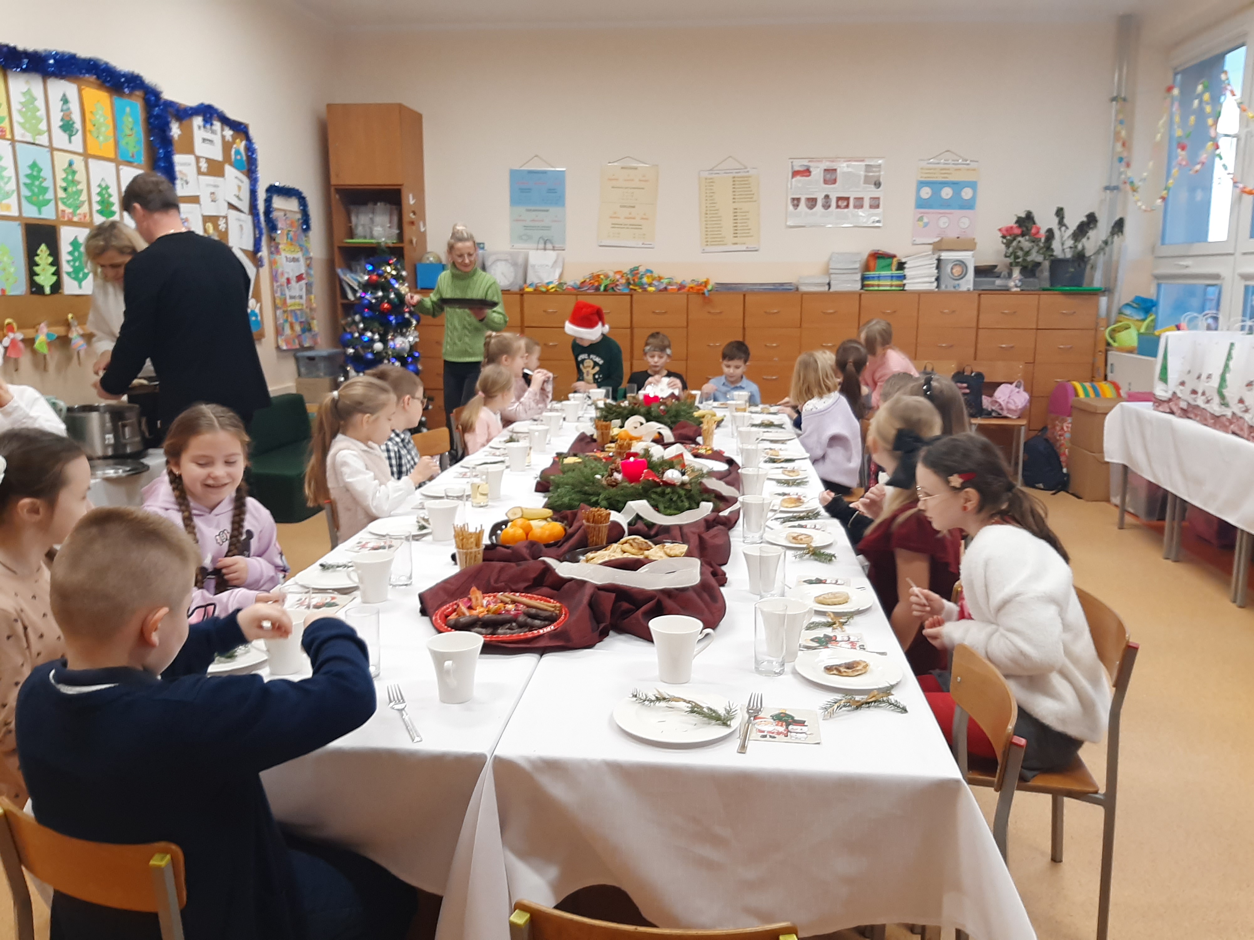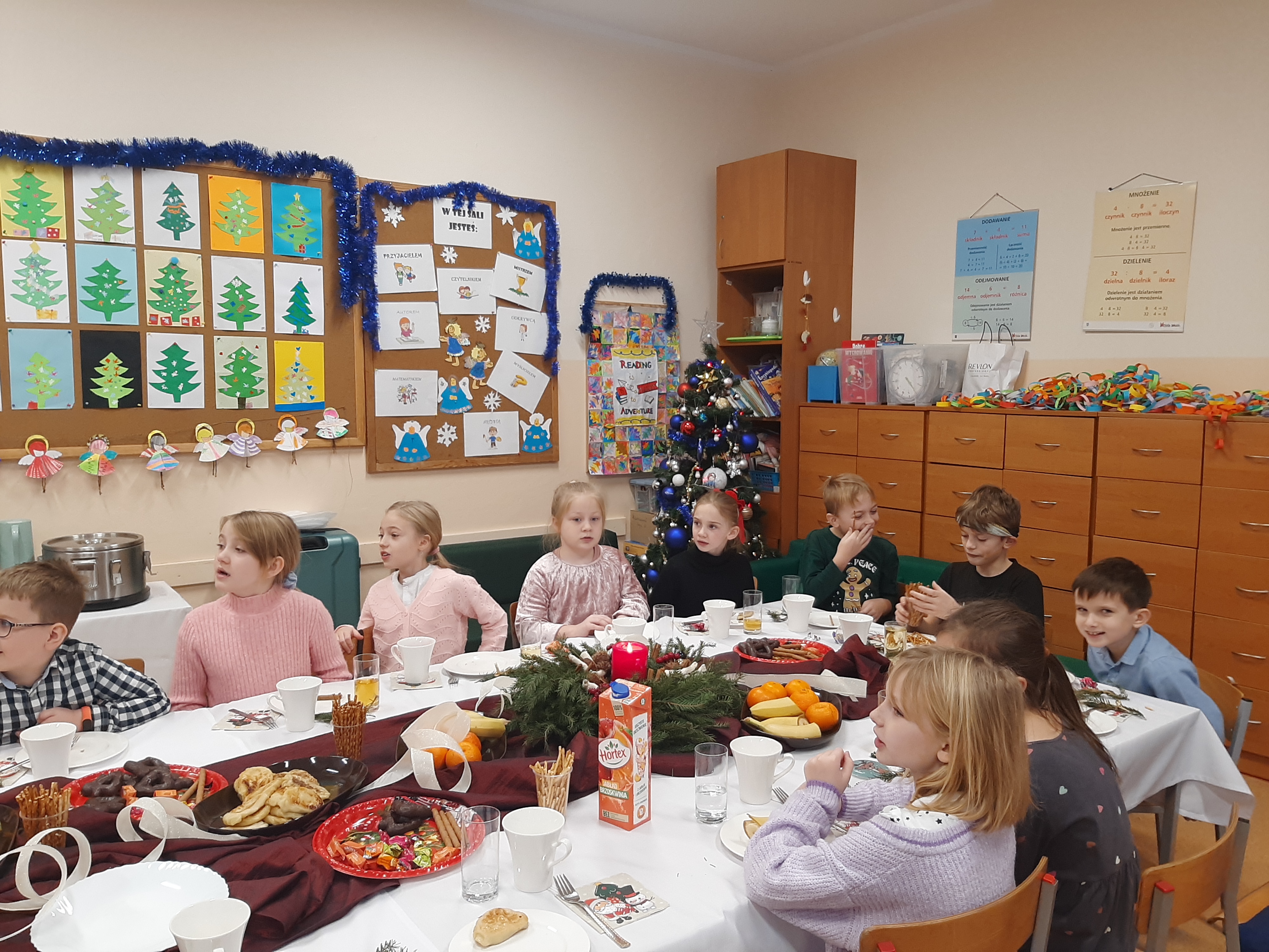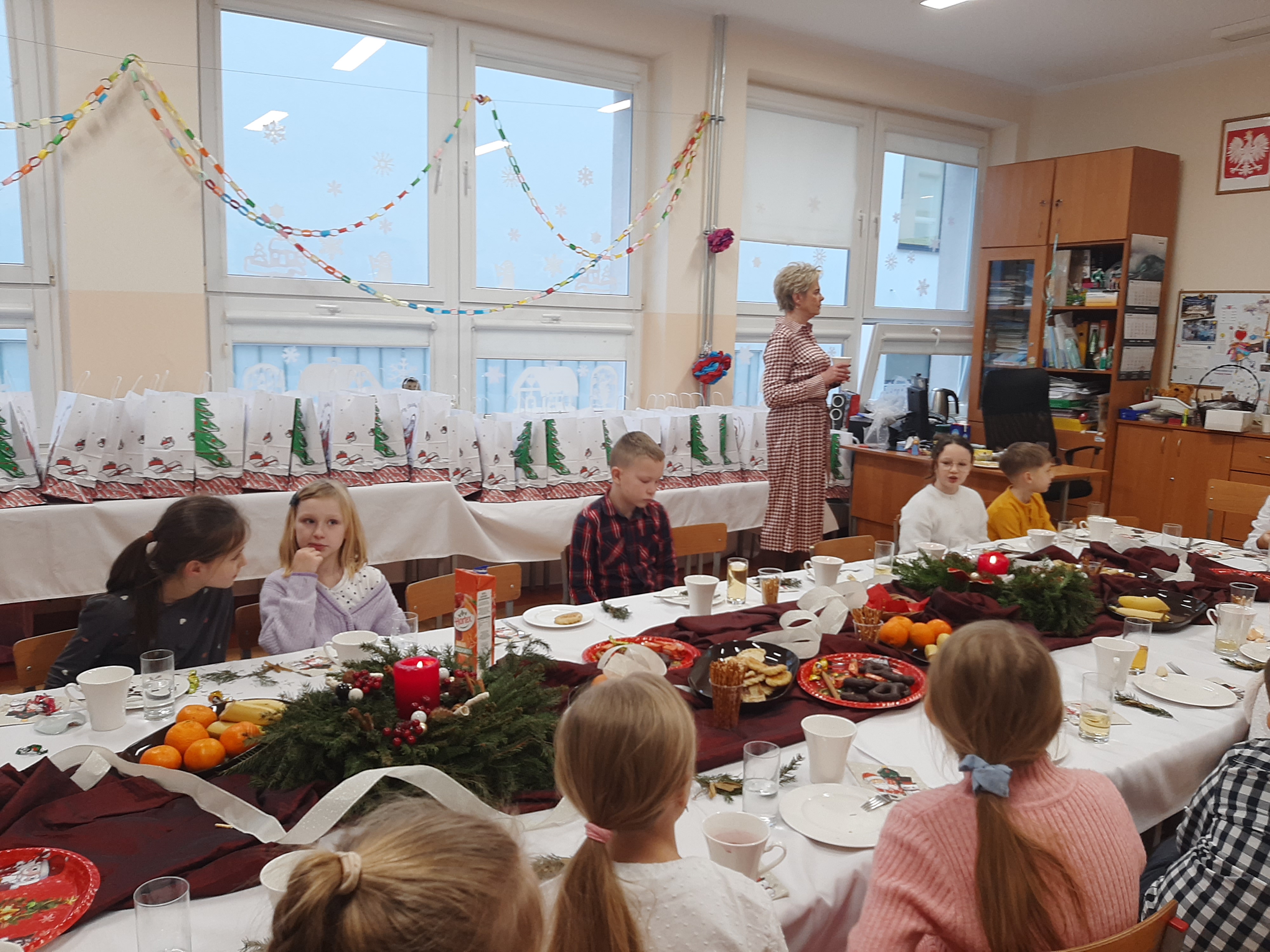 20 grudnia 2024 r. klasa 2b zsiadła do pięknie nakrytego stołu, który przygotowali rodzice uczniów. Podzieliliśmy się opłatkiem, zaśpiewaliśmy kolędy, uczniowie odpowiadali na pytania związane ze Światami Bożego Narodzenia. Podczas spotkania panowała miła, radosna atmosfera, którą zapamiętamy na długo.