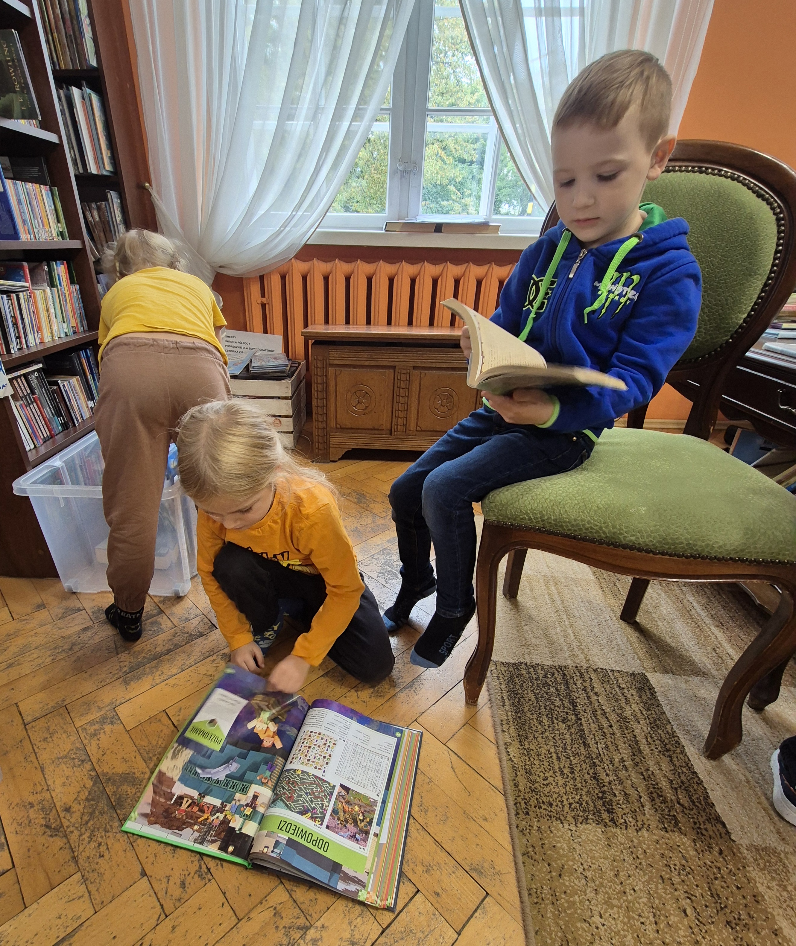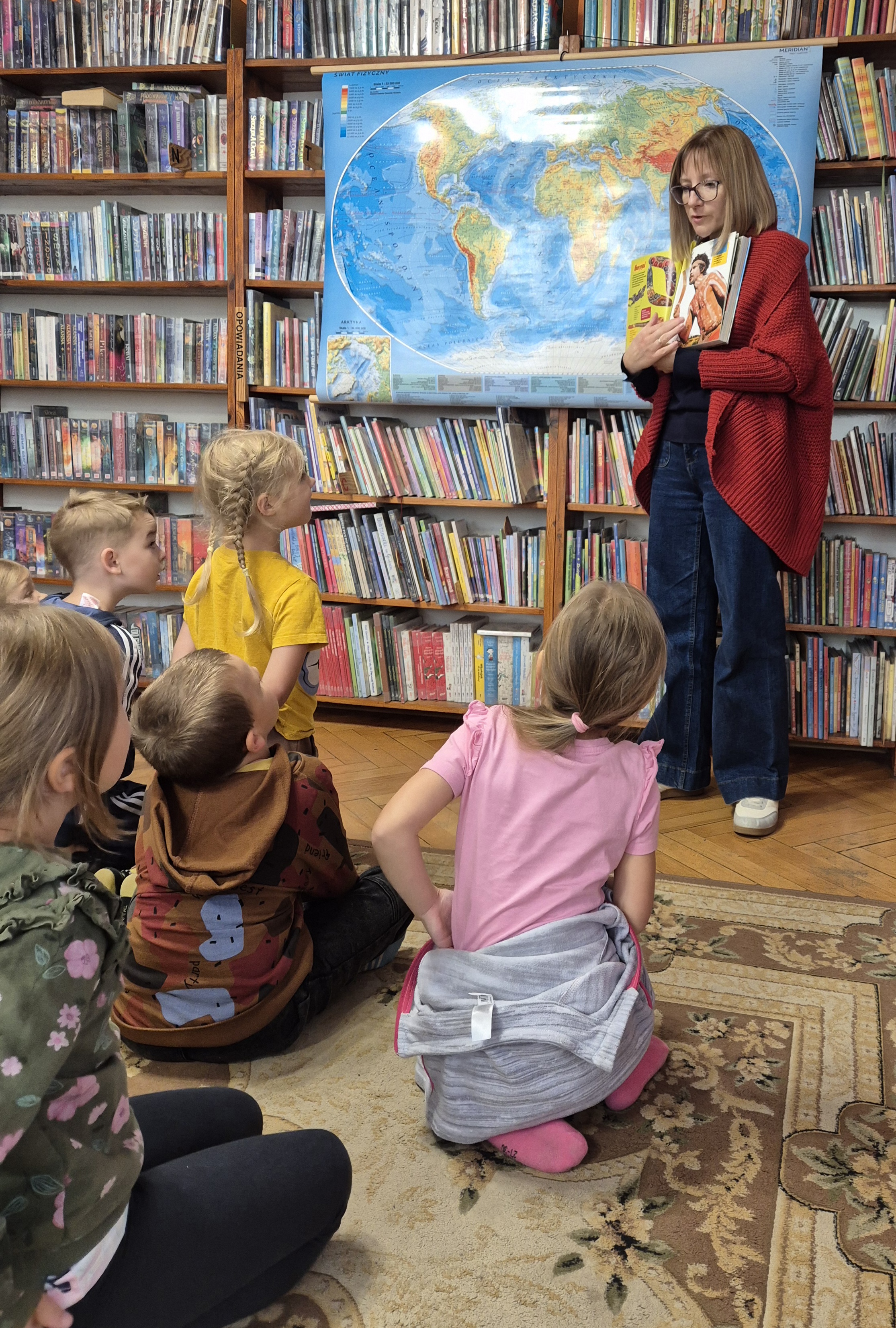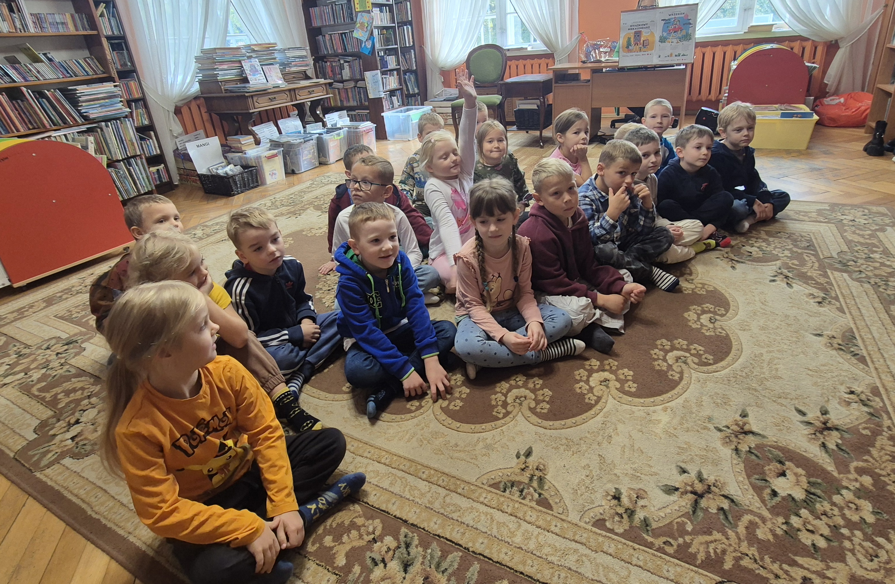 Dzieci 30 września wybrały się na wizytę do biblioteki, gdzie wzięły udział w spotkaniu z panią Asią. Na początku wysłuchały dwóch ciekawych opowieści: „Bajki o gąsienicy, która zamieniła się w motyla” oraz historii o tym, dlaczego ptaki wiją gniazda. Pani Asia opowiadała także wiele interesujących ciekawostek o zwierzętach z różnych kontynentów, m.in. o dingo.