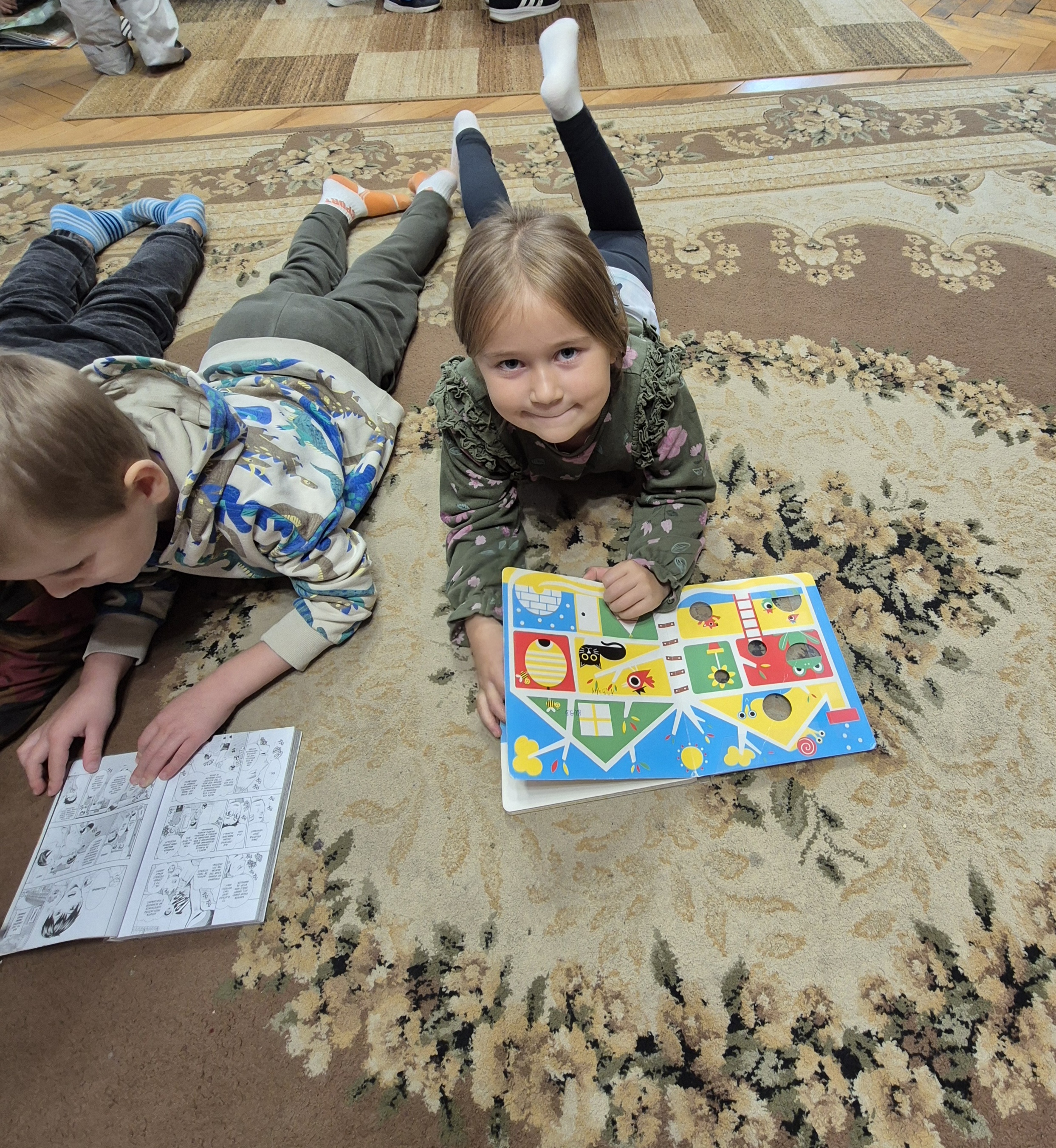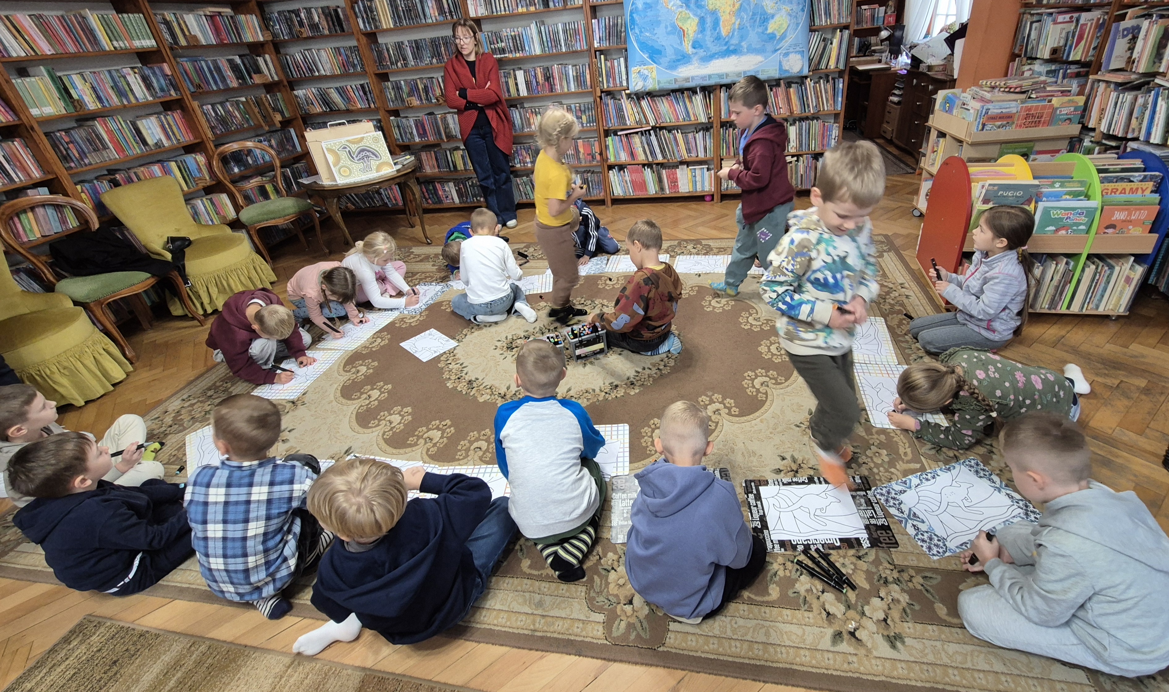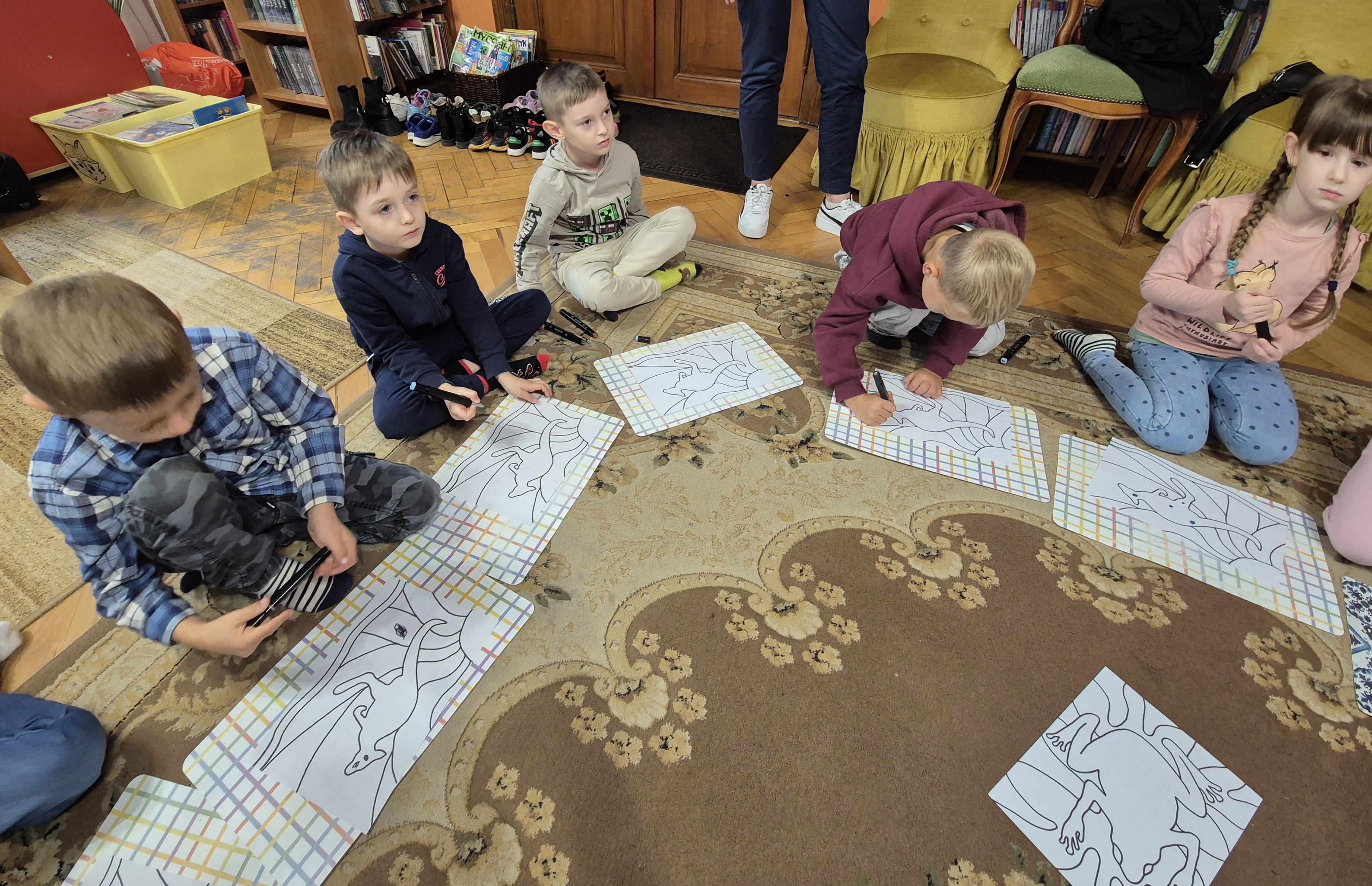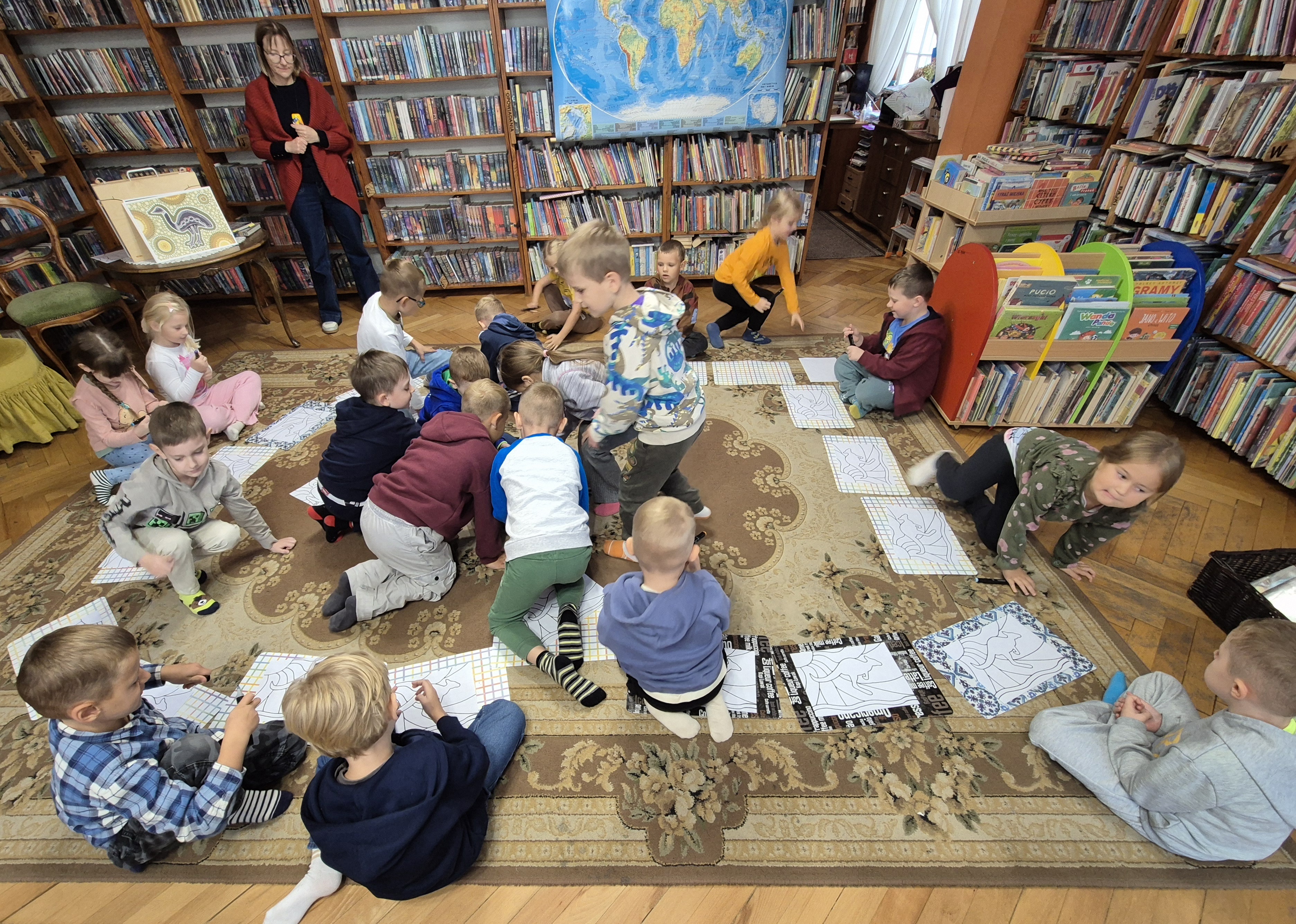 Po części słuchanej dzieci ozdabiały samodzielnie kolorowanki w formie kropek, a na zakończenie mogły obejrzeć i poczytać książeczki dostępne w bibliotece. Pani Asia zachęcała wszystkie dzieci do zapisania się do biblioteki i korzystania z jej bogatych zbiorów.