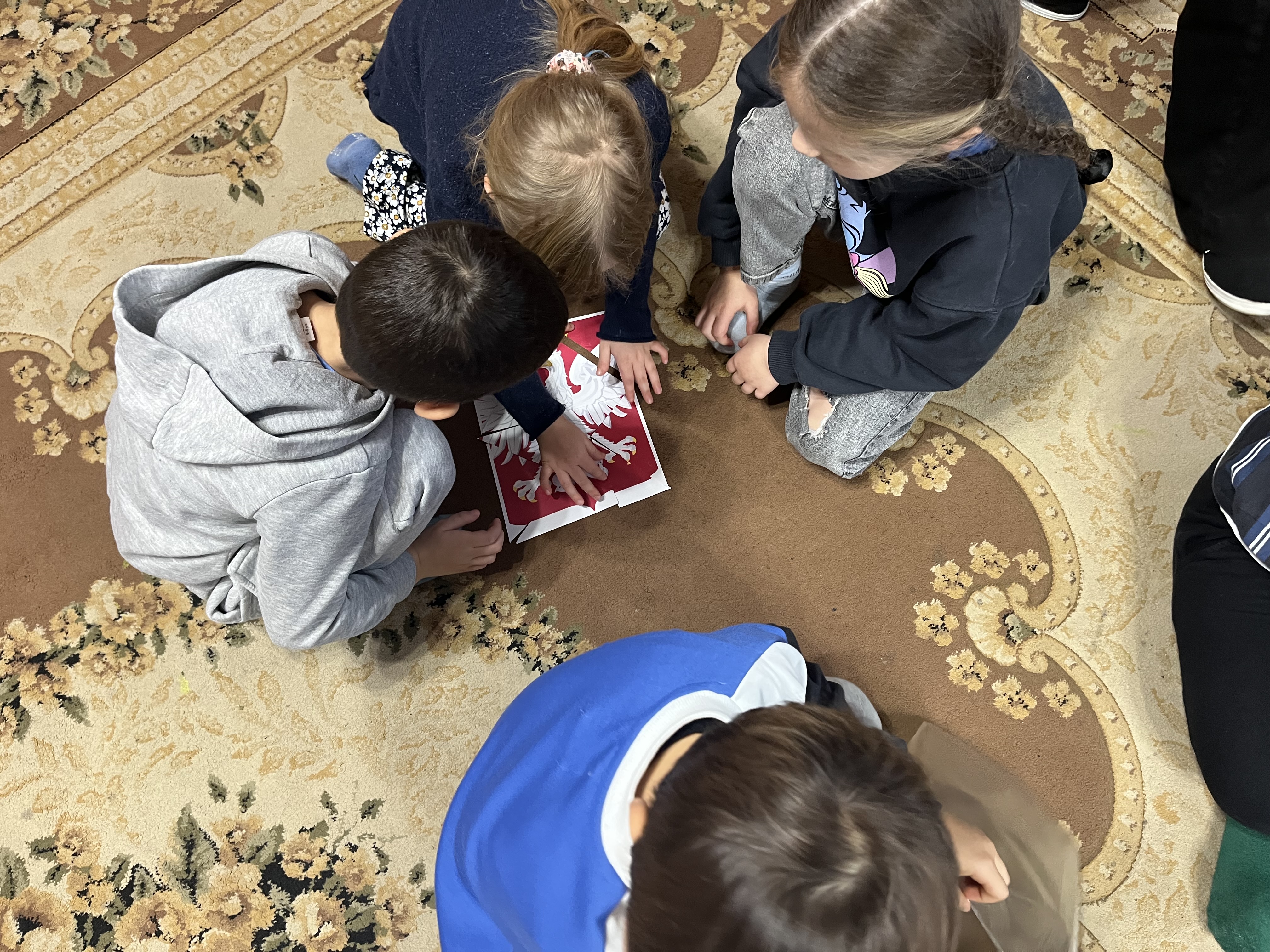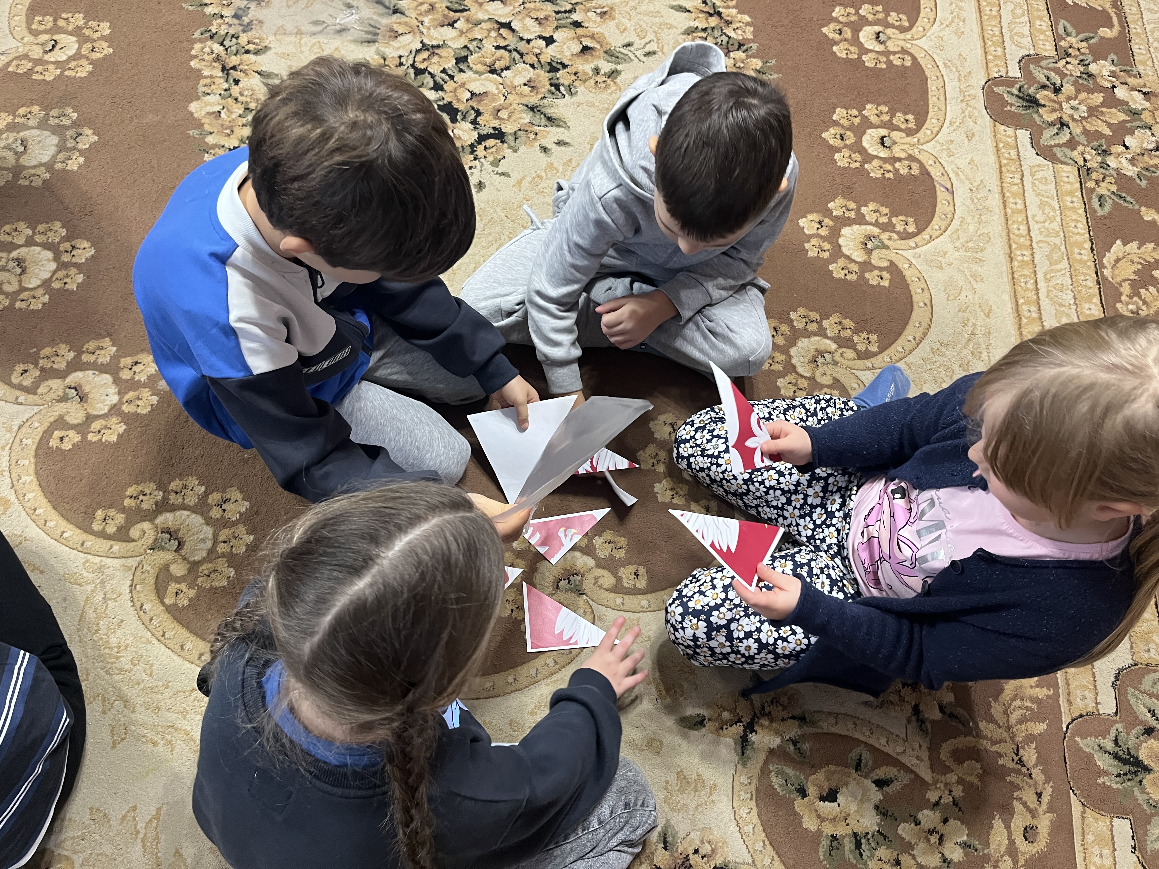 W dalszej części zajęć pani Asia przeczytała opowiadanie pt. „Niepodległa”, które pomogło dzieciom lepiej zrozumieć pojęcie wolności oraz miłości do ojczyzny. Następnie uczestnicy zostali podzieleni na grupy i z przygotowanych elementów układali symbole narodowe.