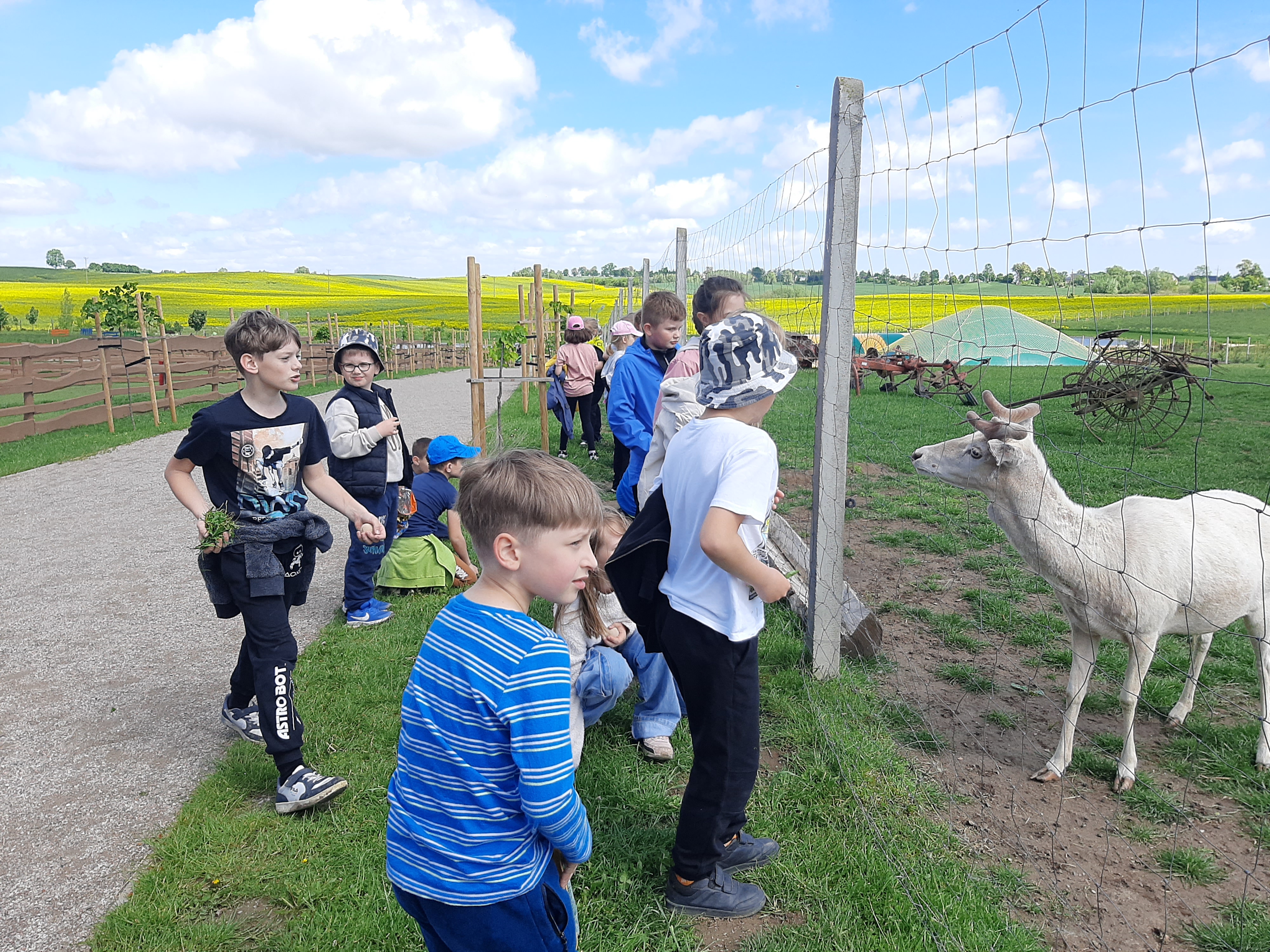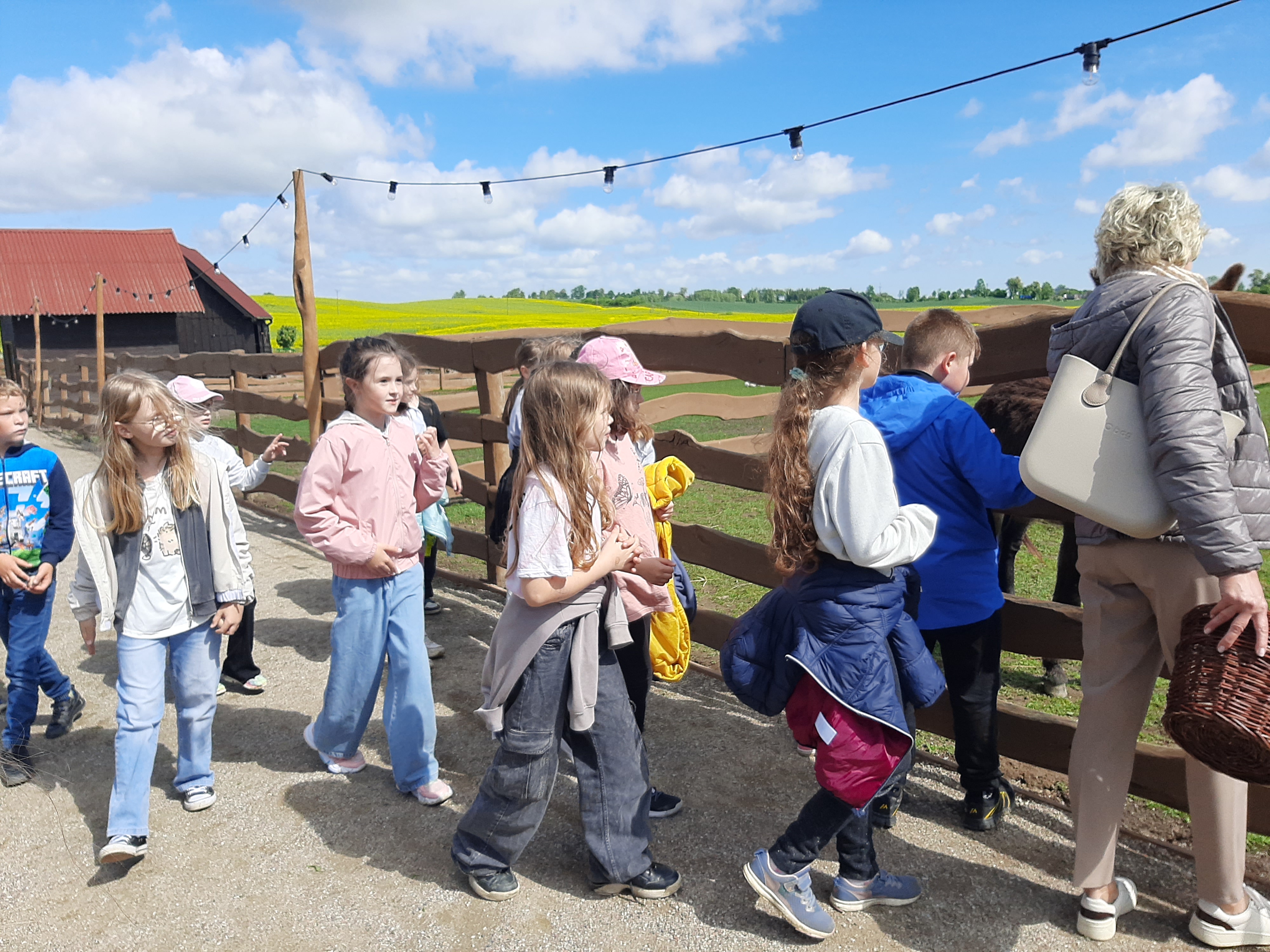Nie zabrakło również kontaktu z przyrodą – dzieci z zaciekawieniem obserwowały, głaskały i karmiły zwierzęta gospodarskie: kozy, kury, kaczki, alpaki i osiołki. Była to nie tylko radosna zabawa, ale także cenna lekcja empatii i przyrody.