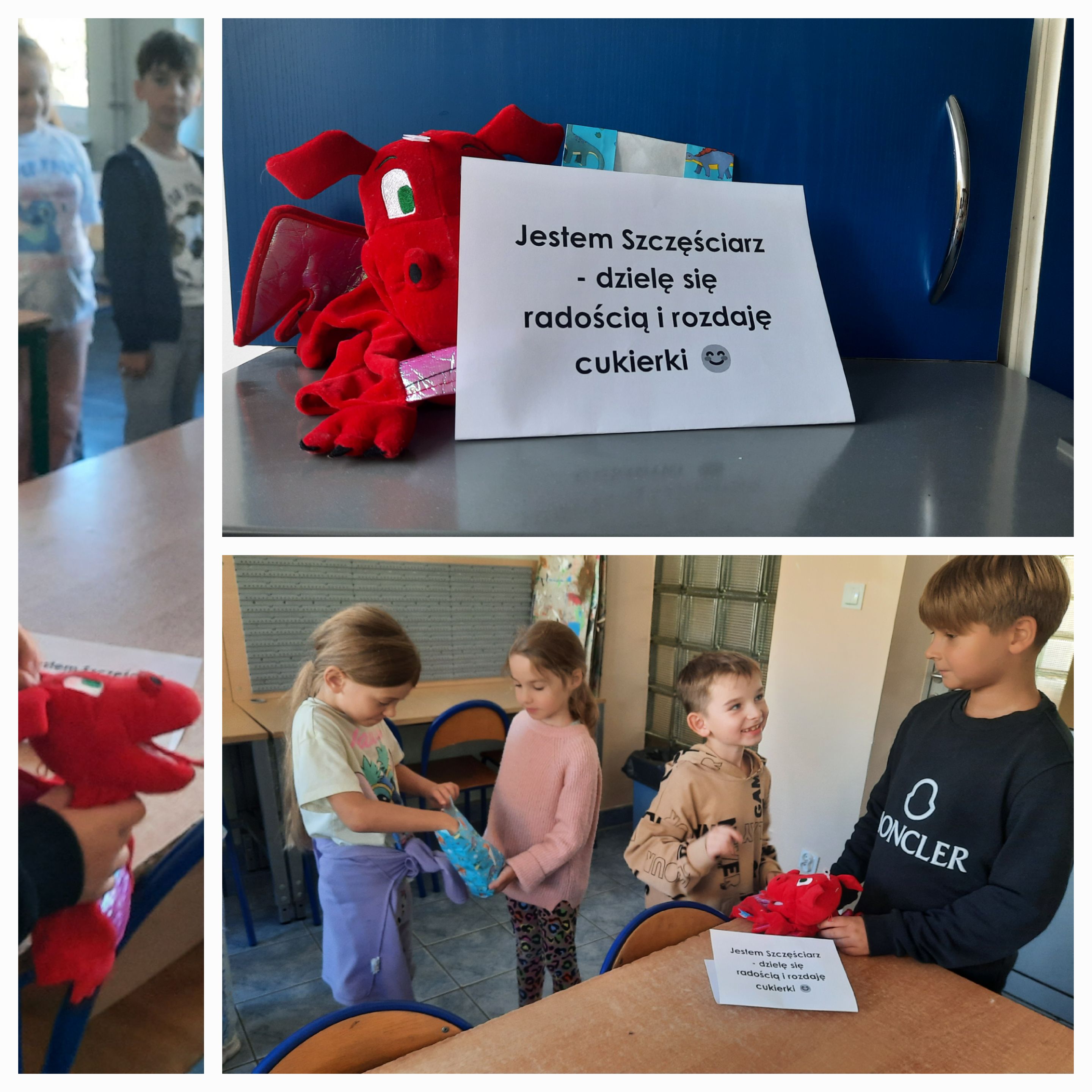W szkole organizowany był również Tydzień Szczęścia - najbardziej podobało nam się "spotkanie zagadka" ze Szczęściarzem, który był cudną czerwoną maskotką z przygotowaną specjalnie dla nas torbą cukierków i życzeniami szczescia. Każdy z nas mógł go pogłaskać i pomyśleć sobie życzenie- oby się spełniło:)