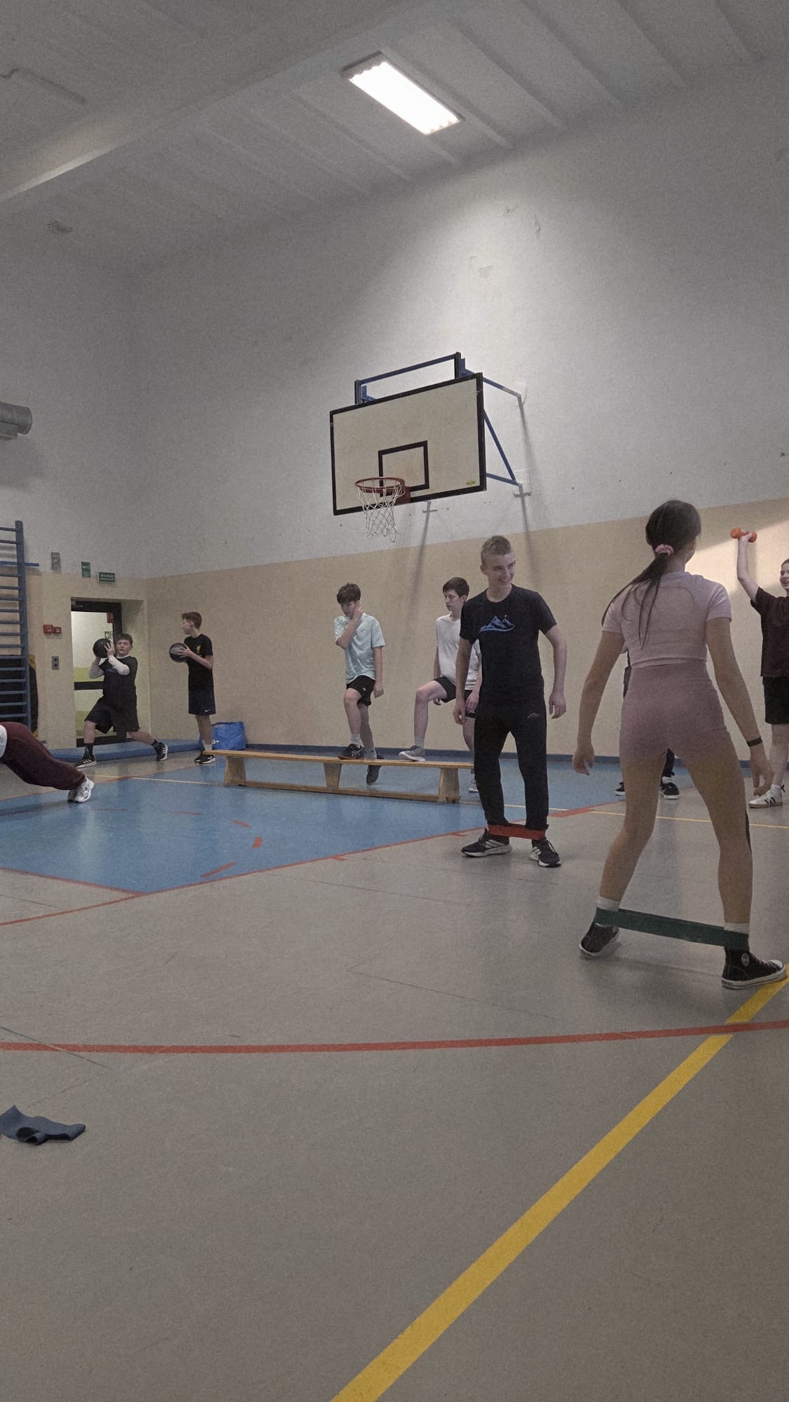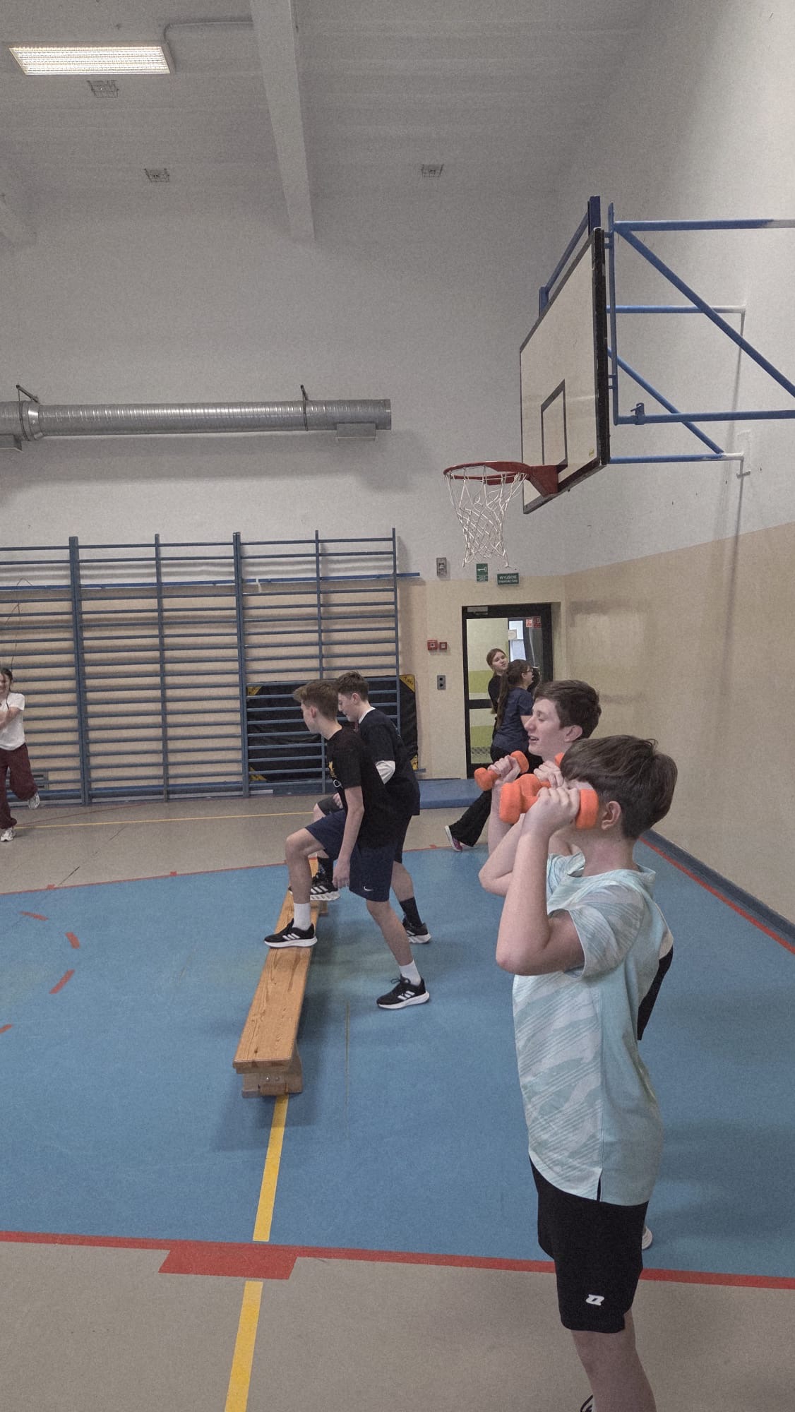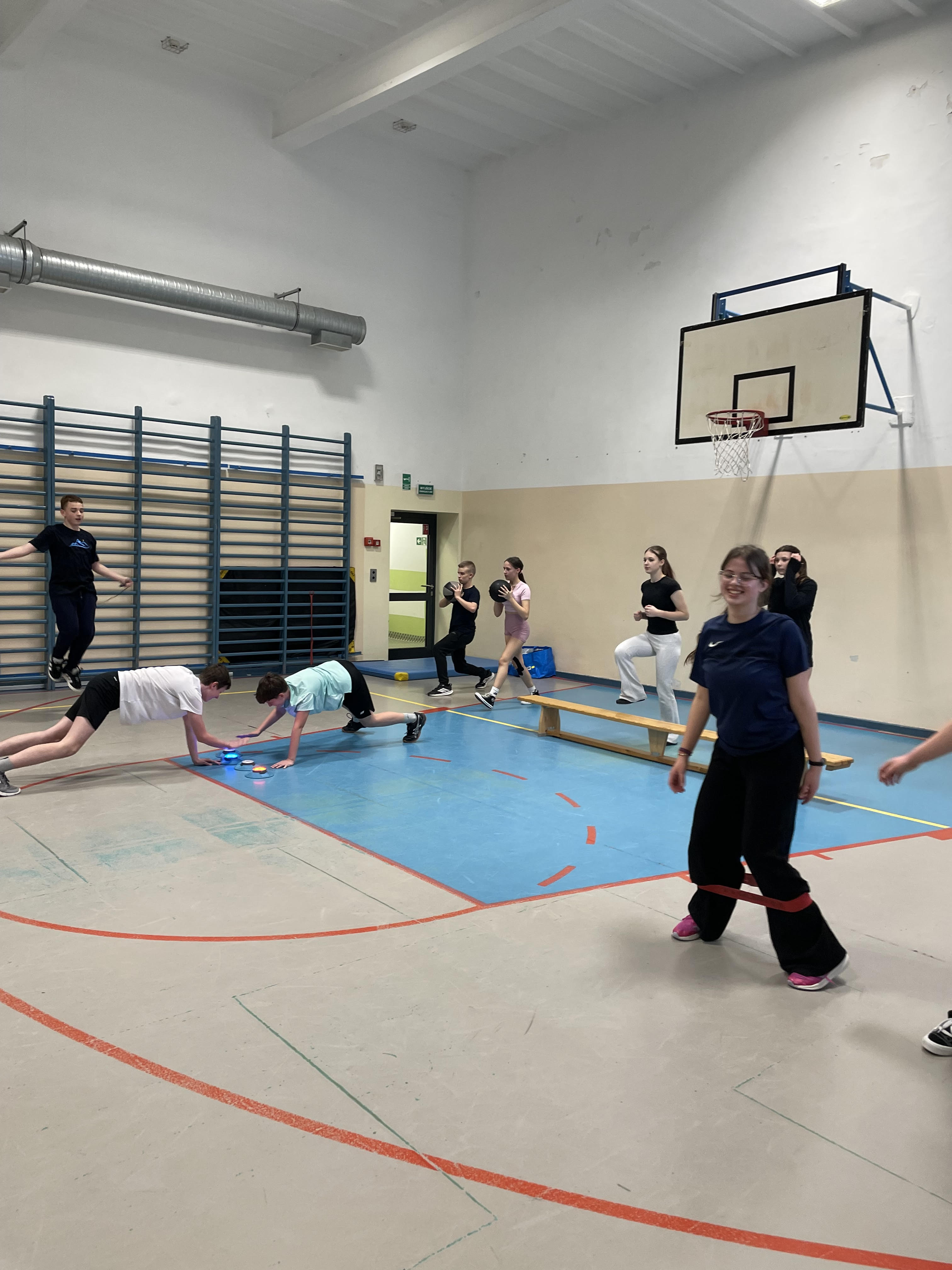 Po części teoretycznej uczestnicy przeszli na salę gimnastyczną, gdzie czekały na nich specjalnie przygotowane stacje zadaniowe. Każda z nich obejmowała inne ćwiczenia rozwijające m.in. koordynację, równowagę, siłę oraz wytrzymałość. Uczniowie z dużym zaangażowaniem wykonywali kolejne zadania, wykazując się determinacją i sportowym duchem.
