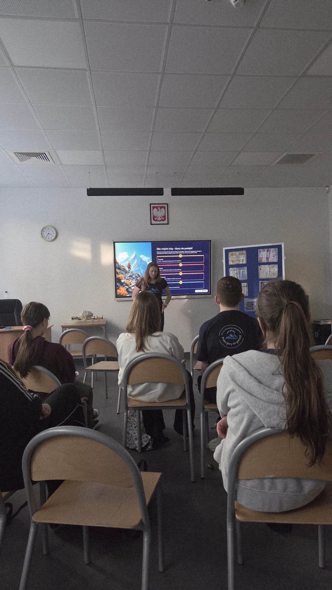Pierwsza część zajęć miała charakter teoretyczny. Uczniowie wysłuchali wykładu na temat ćwiczeń wzmacniających kondycję, wytrzymałość oraz siłę mięśni, które odgrywają kluczową rolę podczas górskich wędrówek. Omówione zostały również zasady bezpiecznego treningu oraz znaczenie regularnej aktywności fizycznej w przygotowaniach do wypraw w trudniejszym terenie.