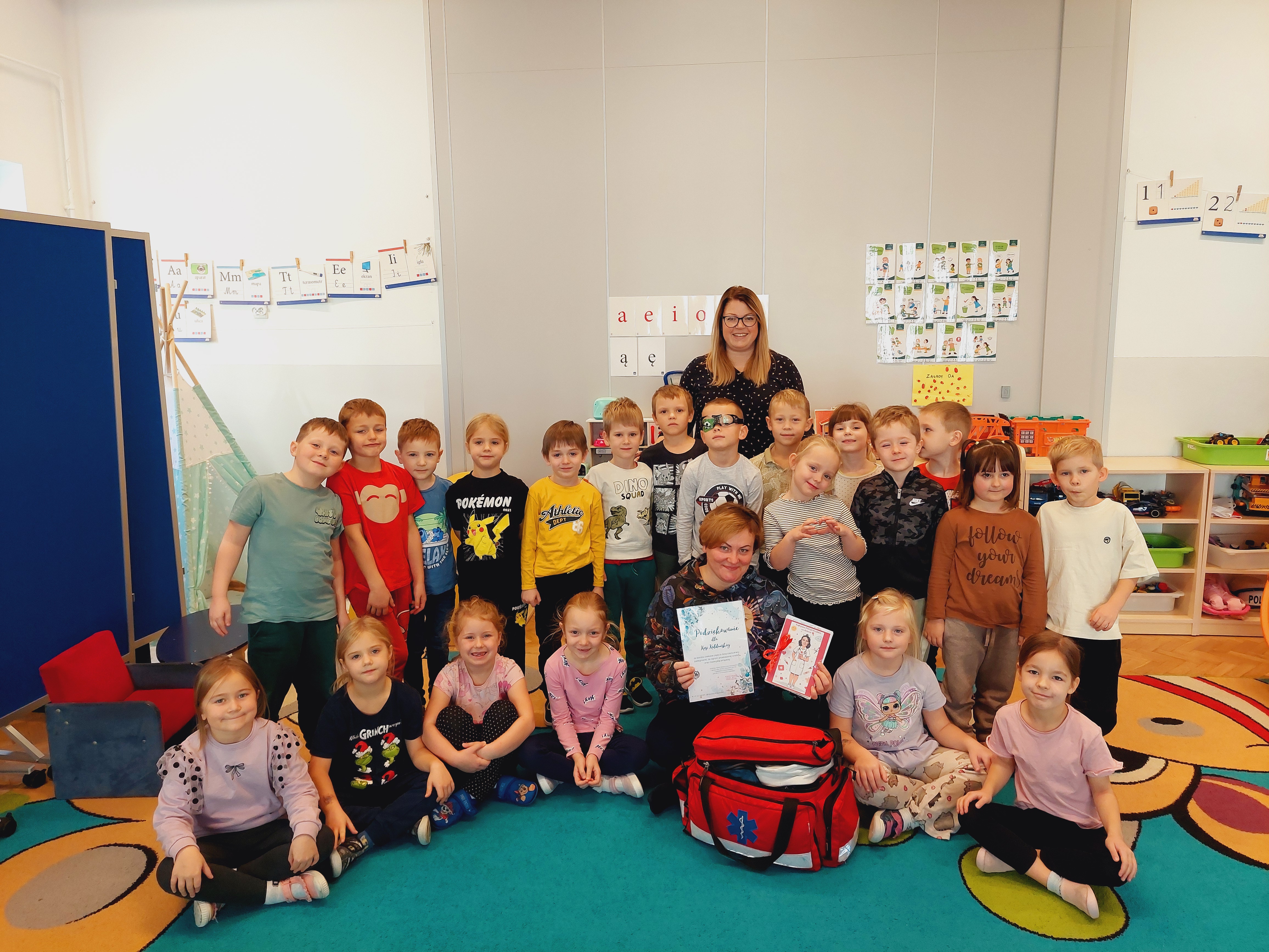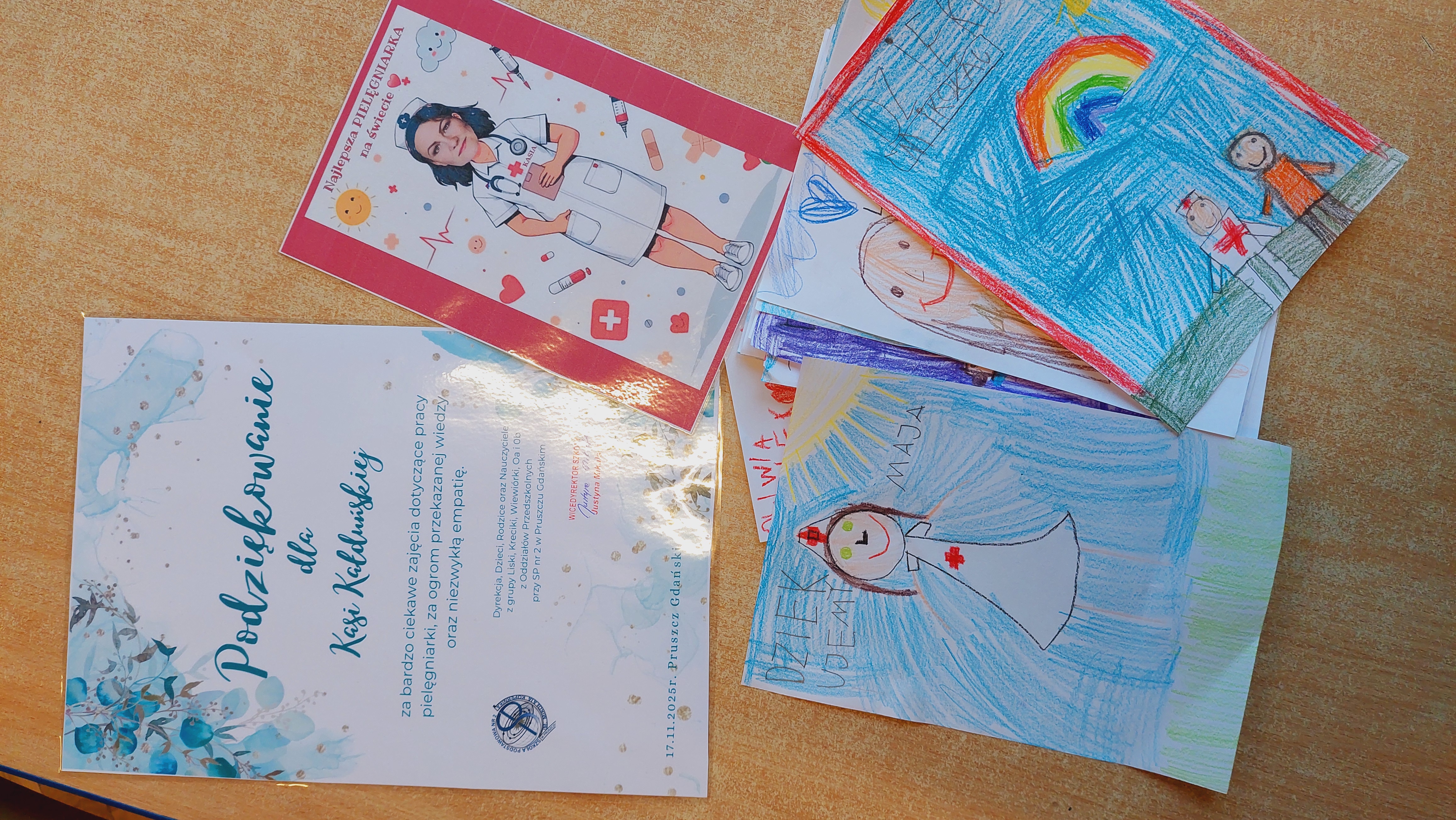 Na zakończenie spotkania dzieci wręczyły pani Kasi własnoręcznie przygotowane laurki i podziękowania. Słowa wdzięczności popłynęły także od dyrekcji, rodziców i nauczycieli — za wspaniałe zajęcia, które poszerzyły wiedzę najmłodszych o niezwykle ważnym zawodzie pielęgniarki.
