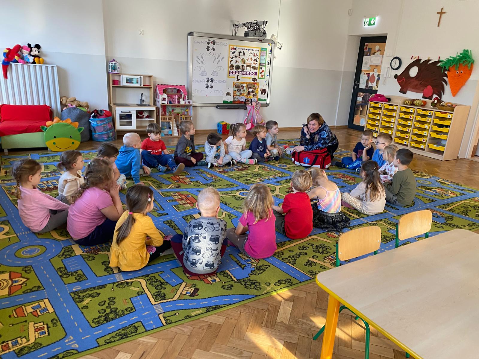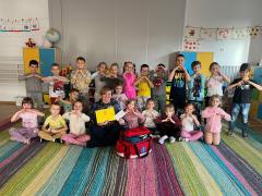 Przywiozła ze sobą „magiczną torbę pielęgniarki", a w niej same skarby: pulsoksymetr, stetoskop, ciśnieniomierz, strzykawki i wiele innych ciekawych narzędzi i przedmiotów. Dzieci mogły zobaczyć, dotknąć i posłuchać, do czego służą te przedmioty — a ciekawości i pytań nie było końca! Mało tego, nasze przedszkolaki wykazały się też ogromną wiedzą, co wprawiało zachwyt naszego gościa.