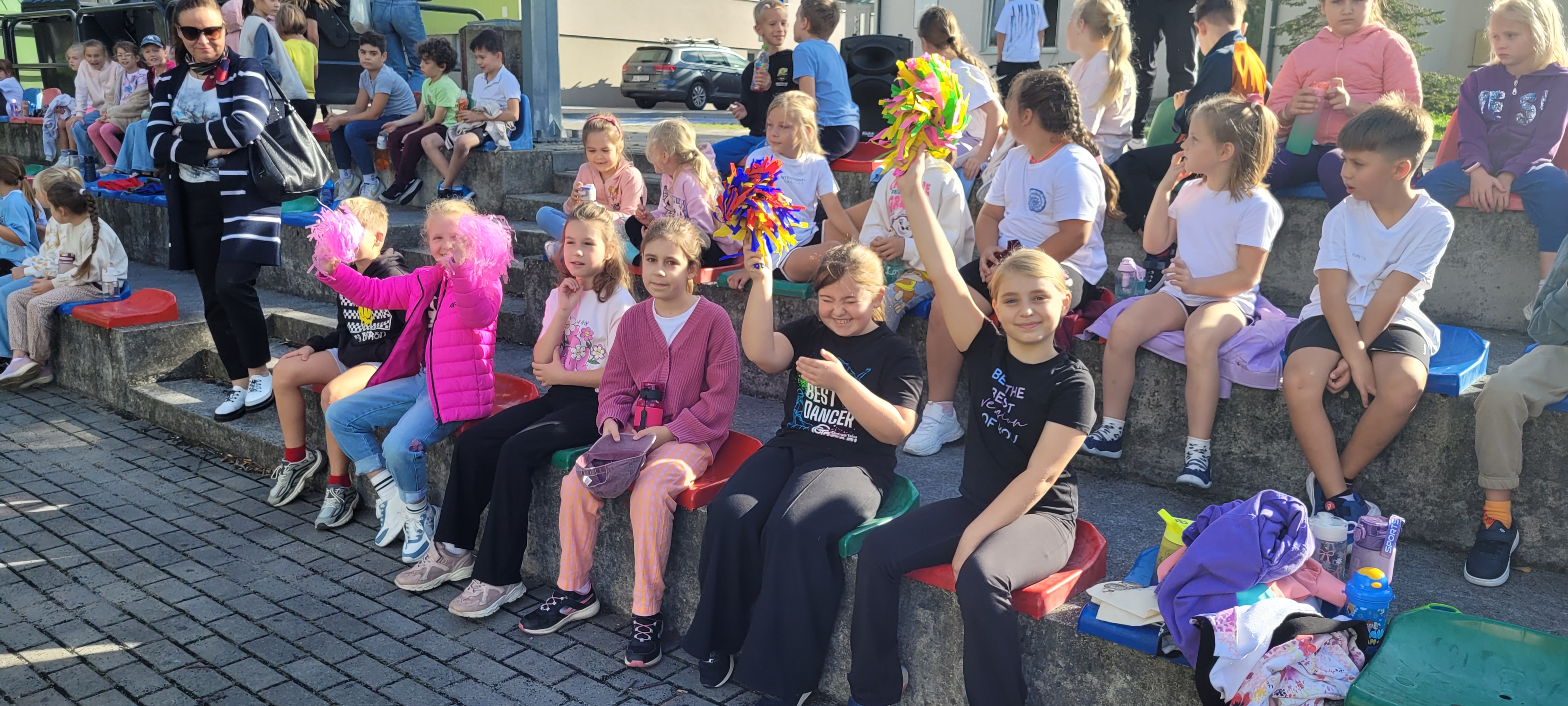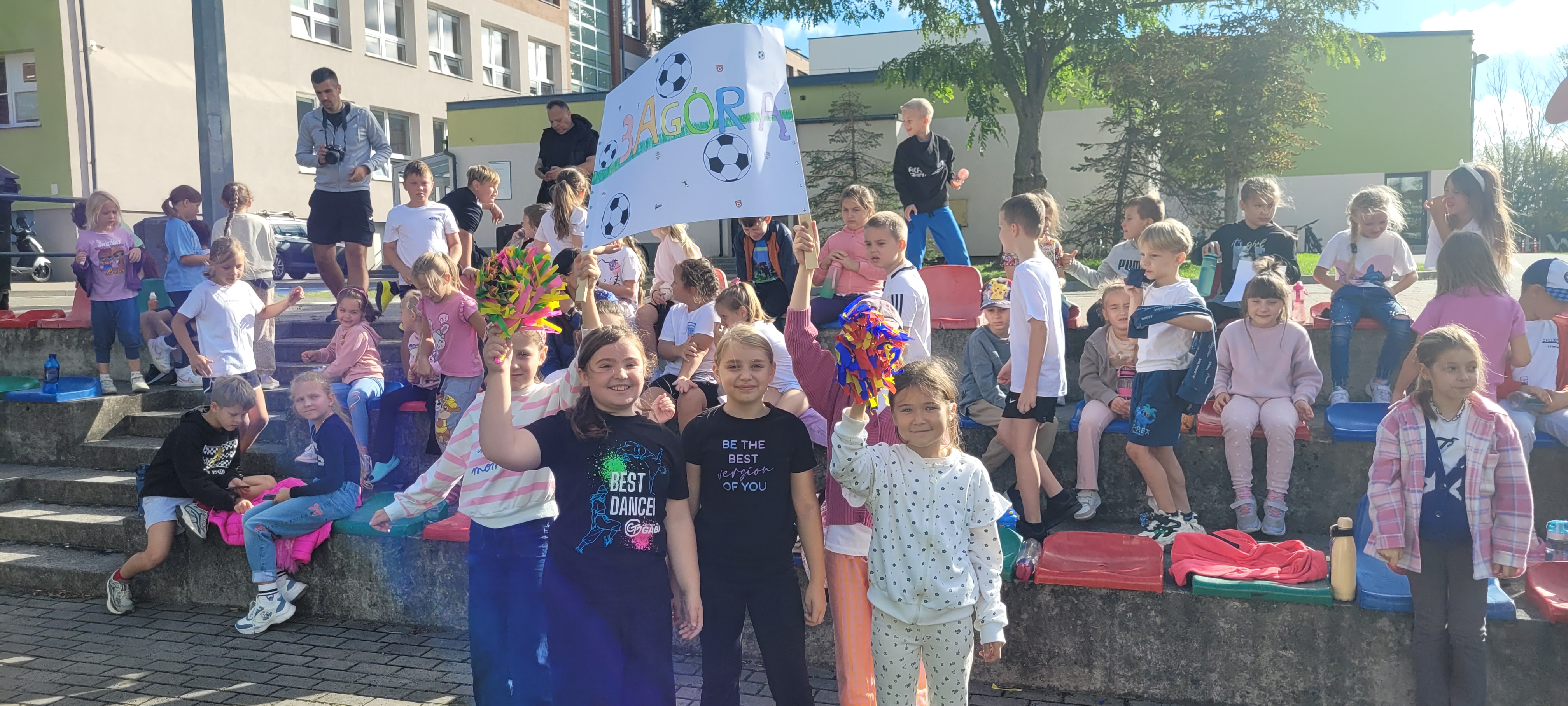 Część uczniów z zaangażowaniem rywalizowała na boisku, pokazując swoje umiejętności, szybkość i ducha fair play. Pozostali uczniowie gorąco dopingowali swoje drużyny, tworząc wspaniałą atmosferę pełną radości, śmiechu i sportowych emocji.